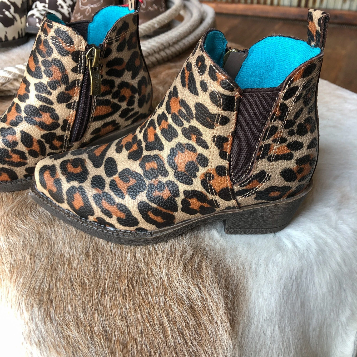 - Snip toe leopard print leather toddler boots.