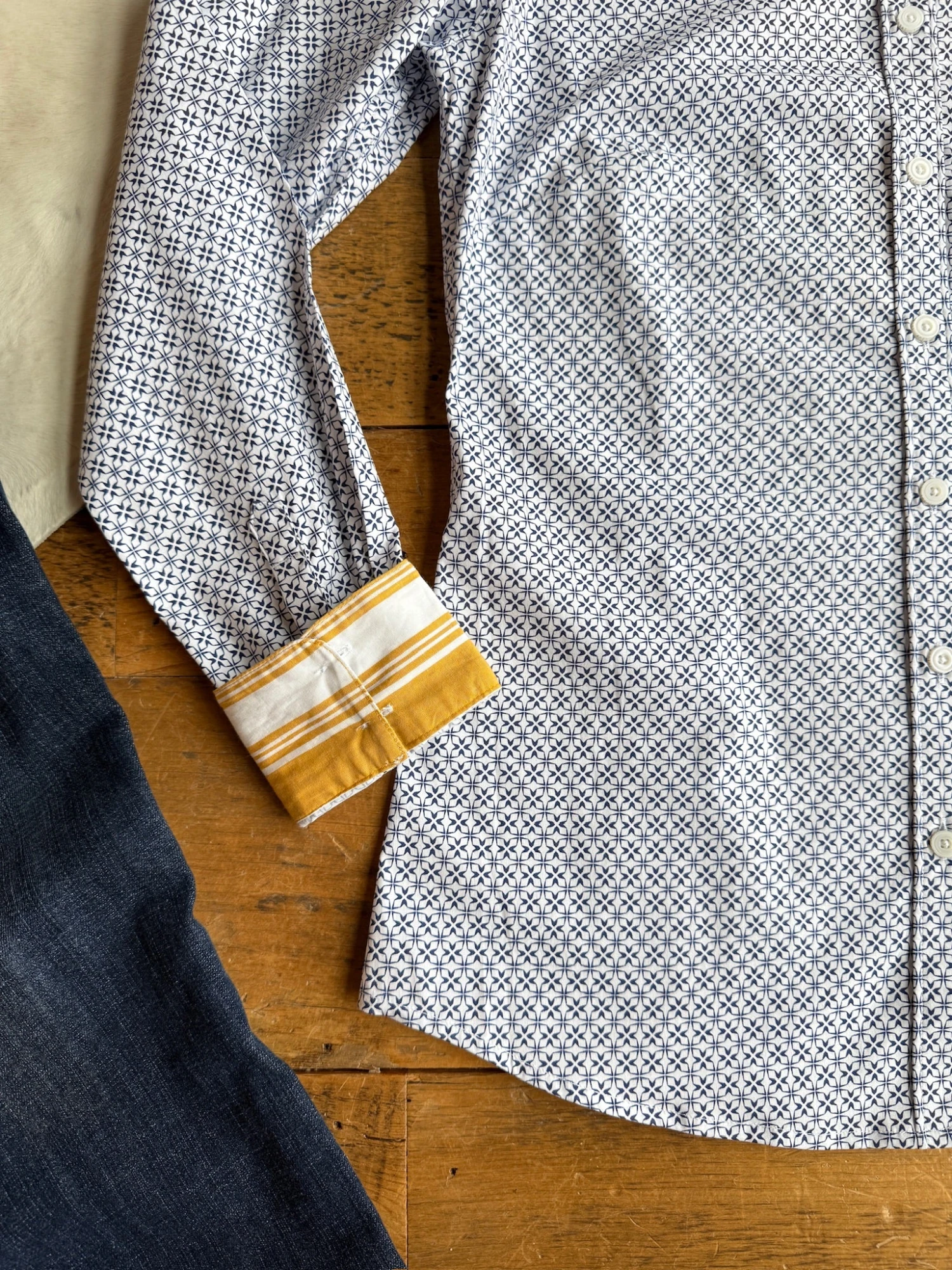 - Cuff can be rolled to show mustard and white stripe design.