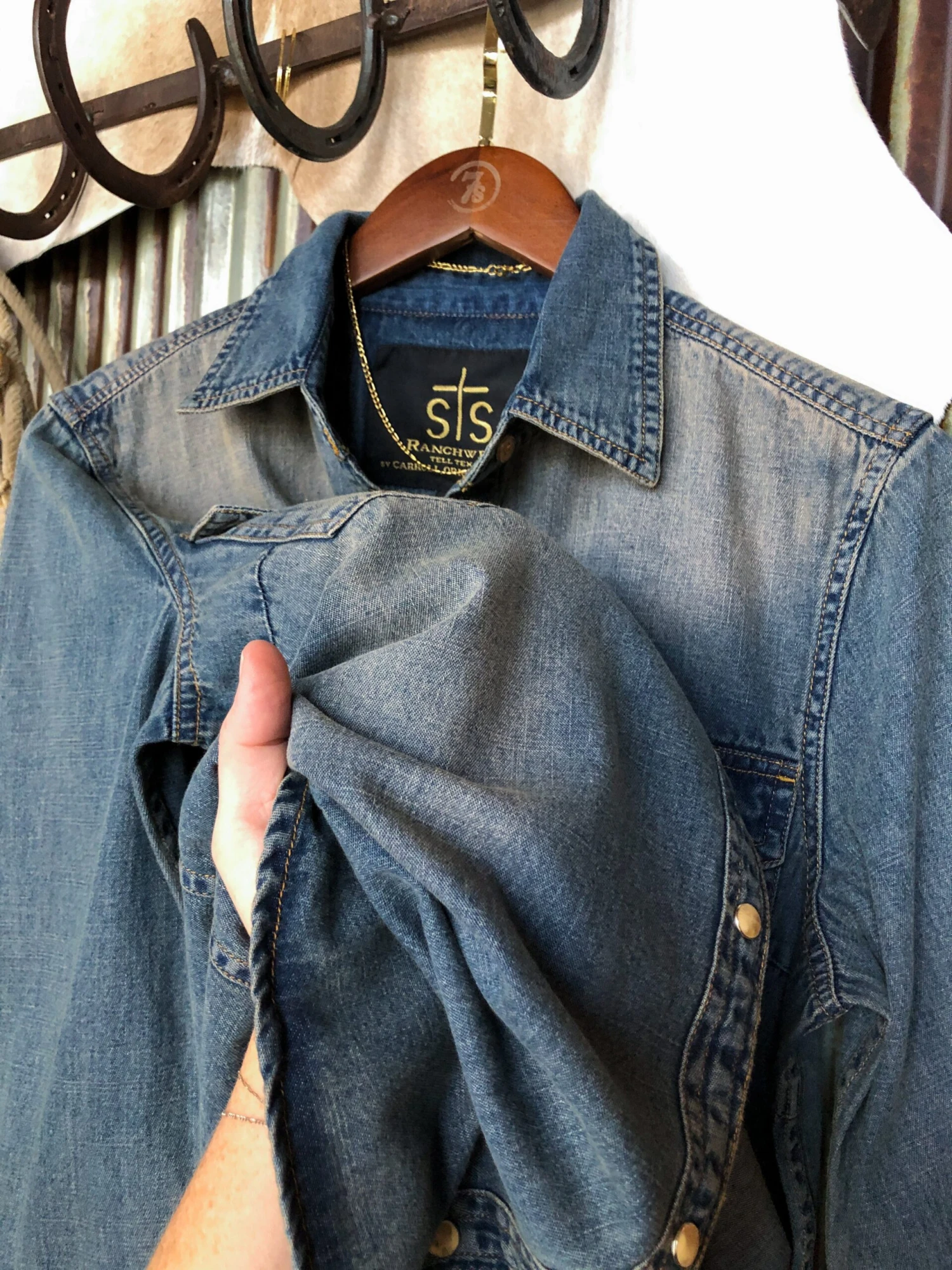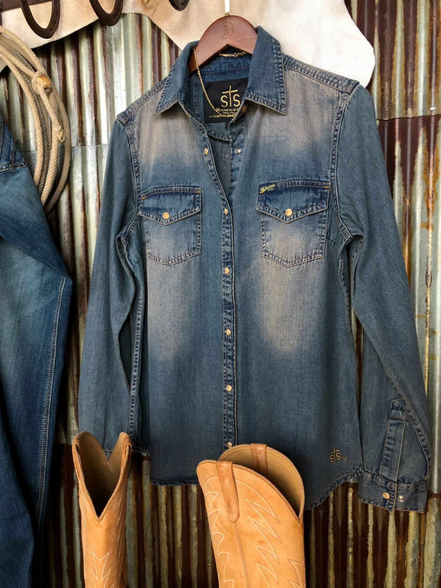 - Vintage wash denim pearl snap long sleeve top.