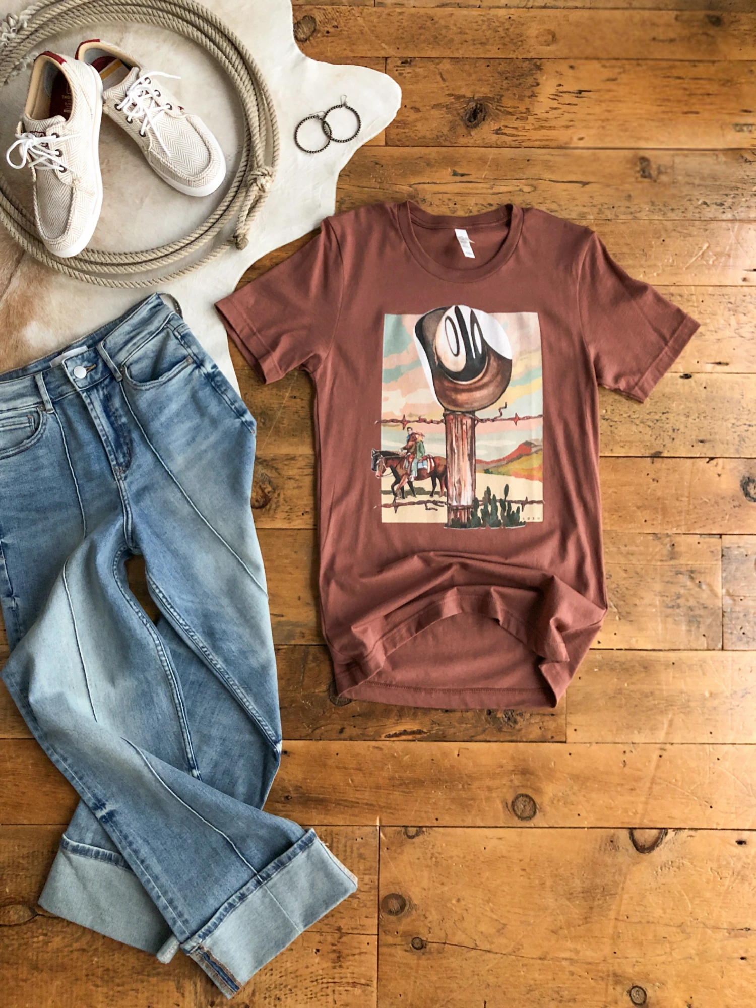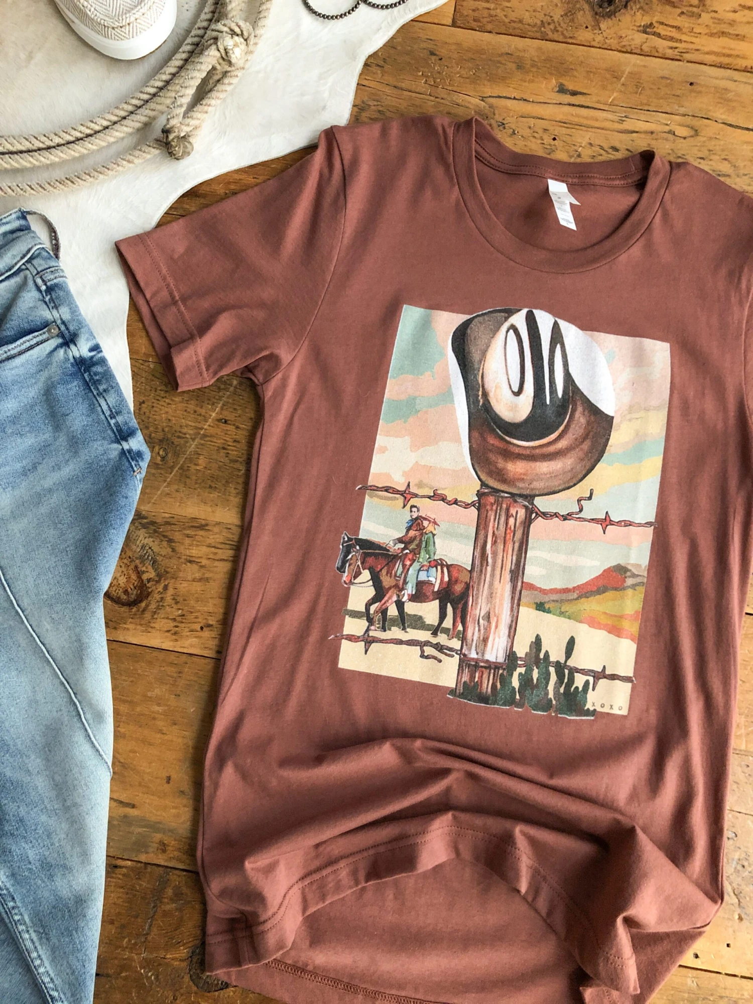 - Lost cowboy hat on a fence post with mountain desert rancher scene graphics.