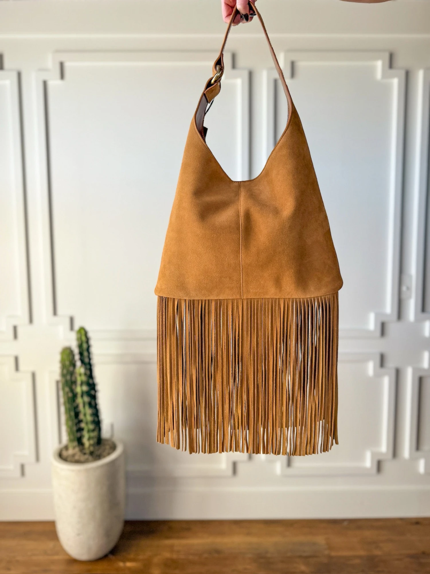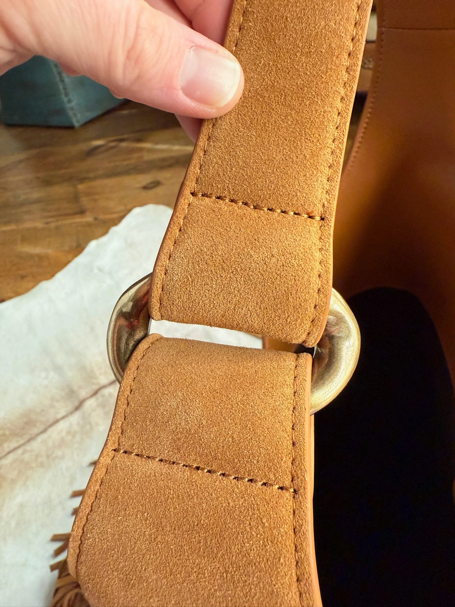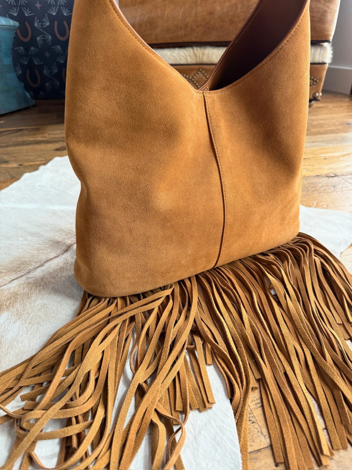 - Rich saddle tan rough out leather handbag.