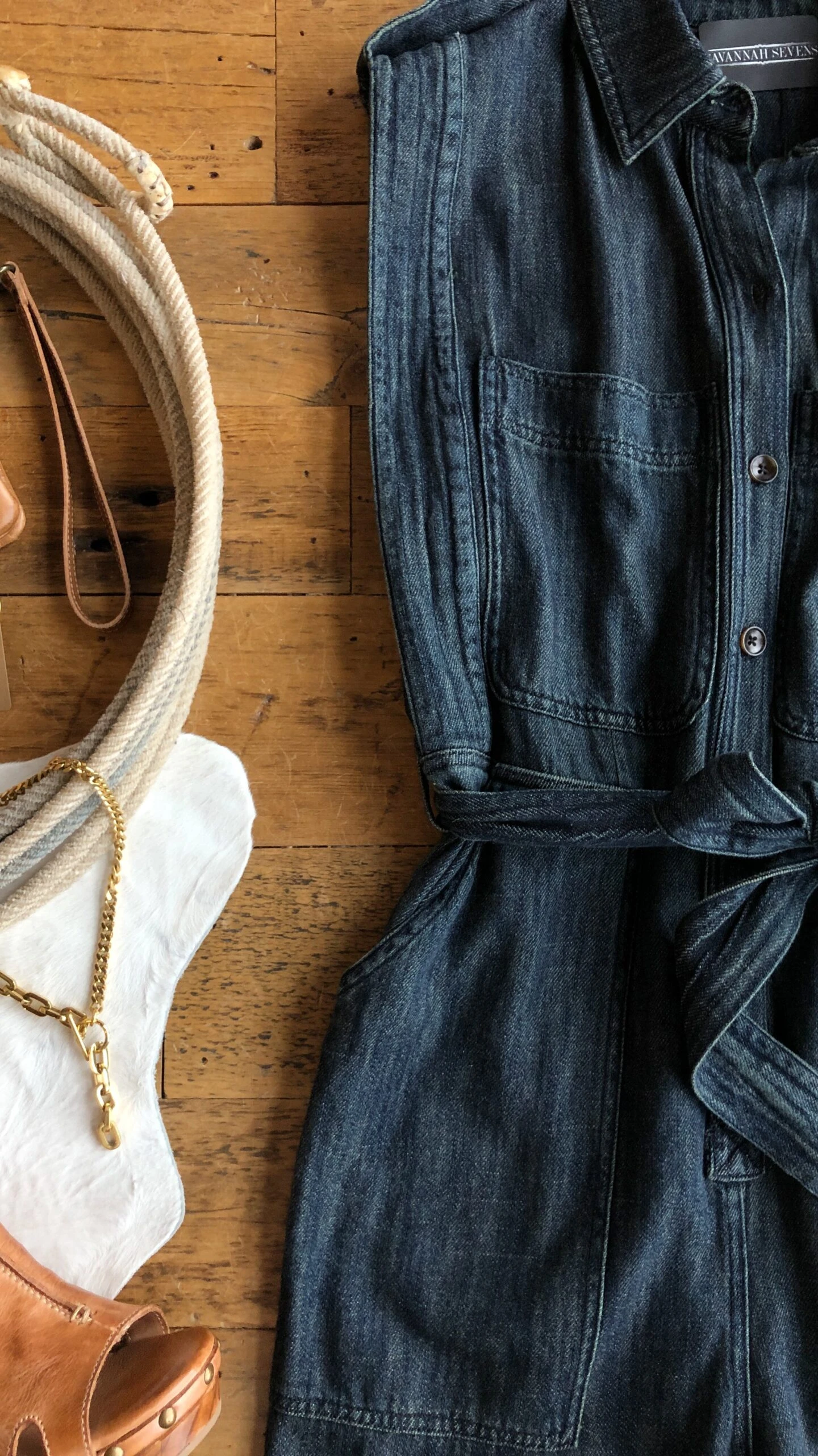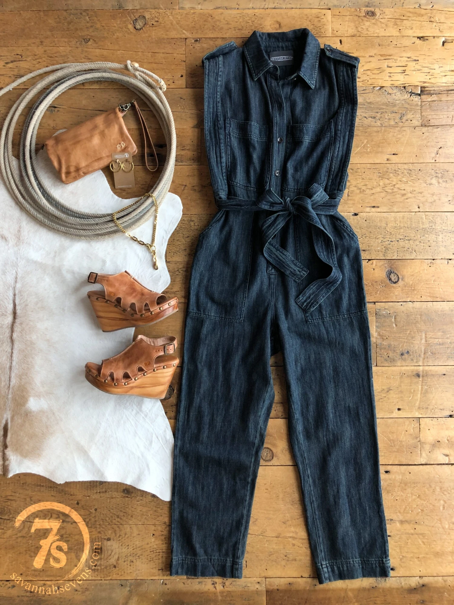 - Dark denim cap sleeve summary up crop jumpsuit.