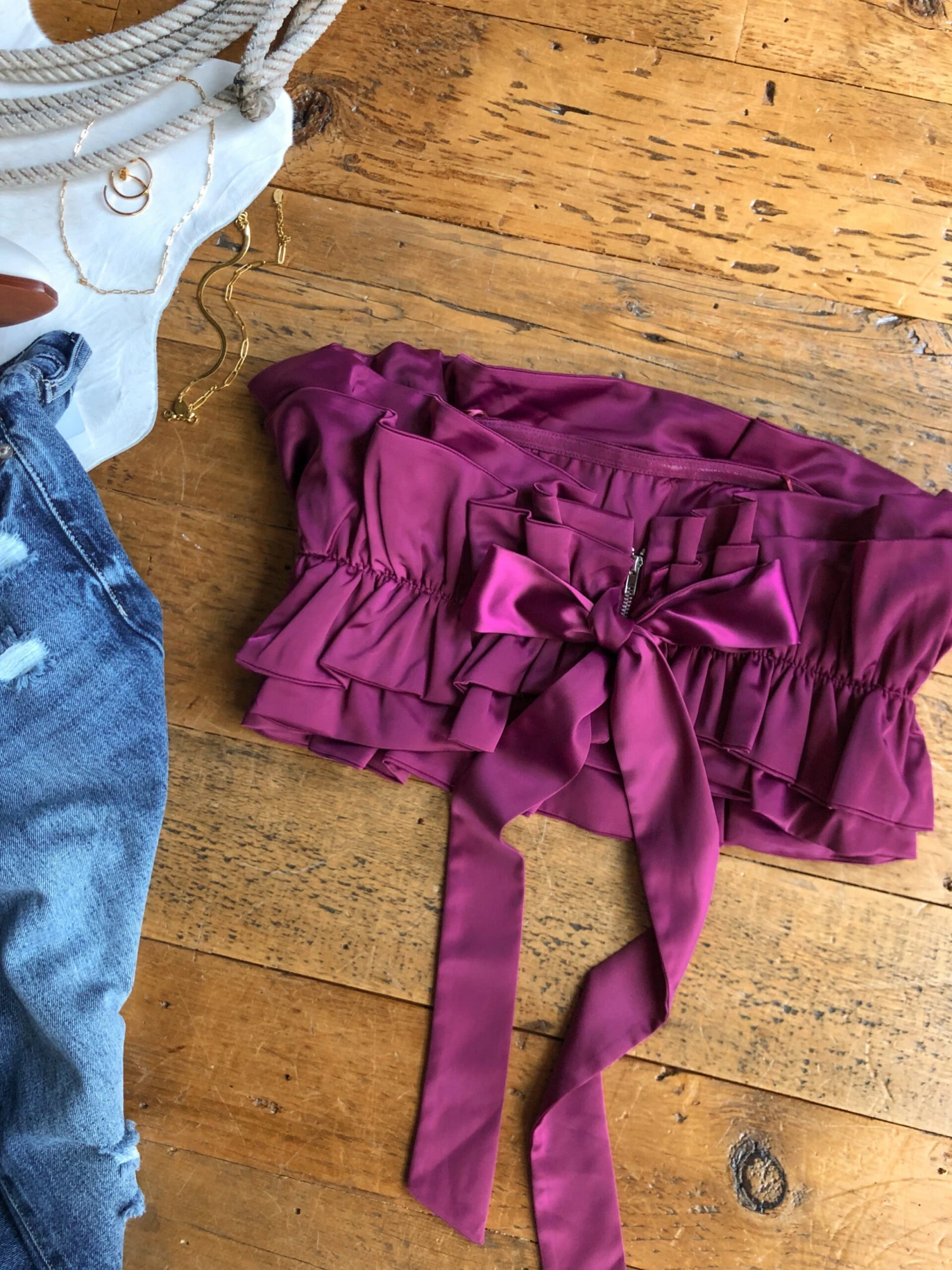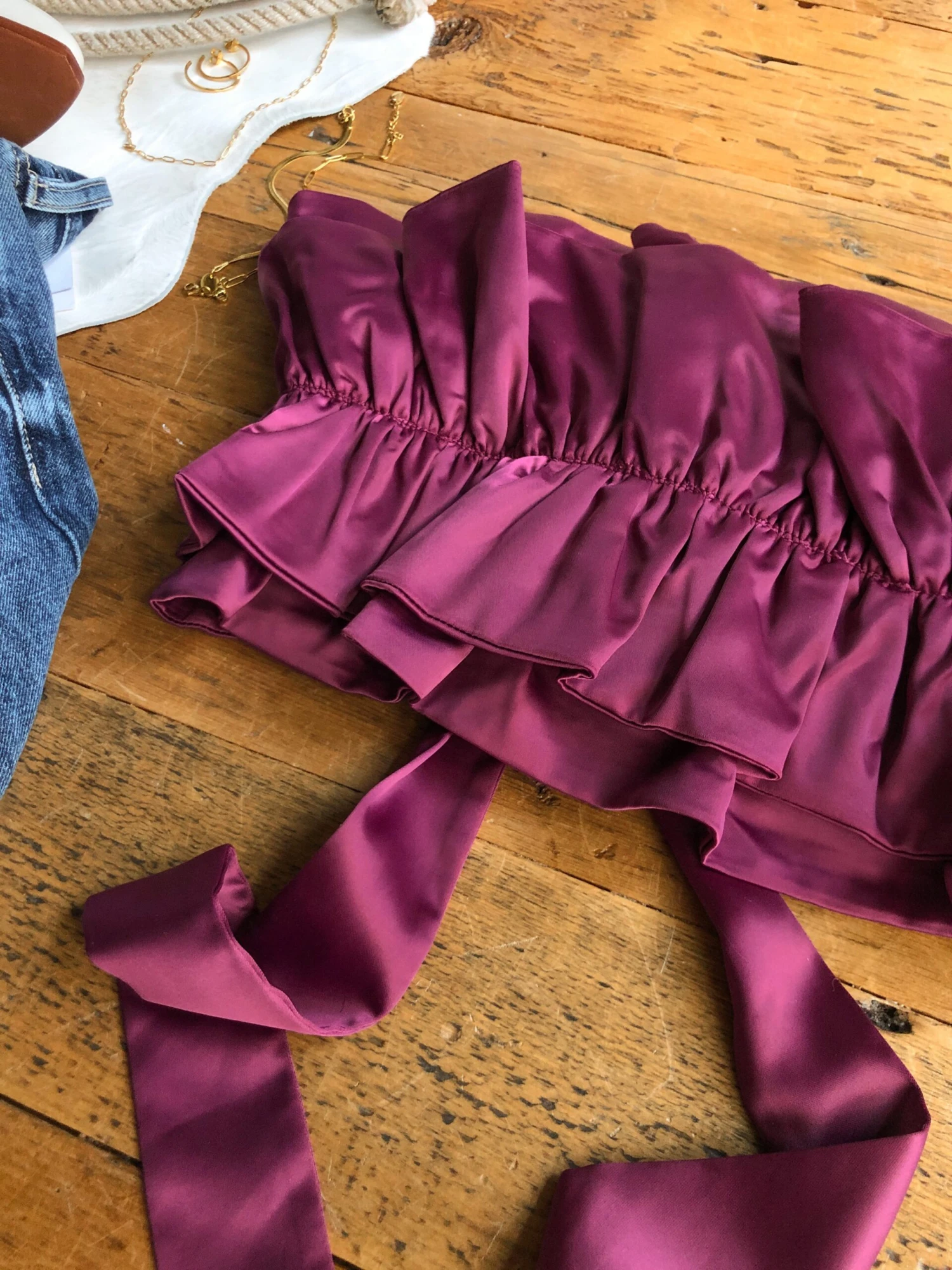 - Plum satin sleeveless ruffle crop top.