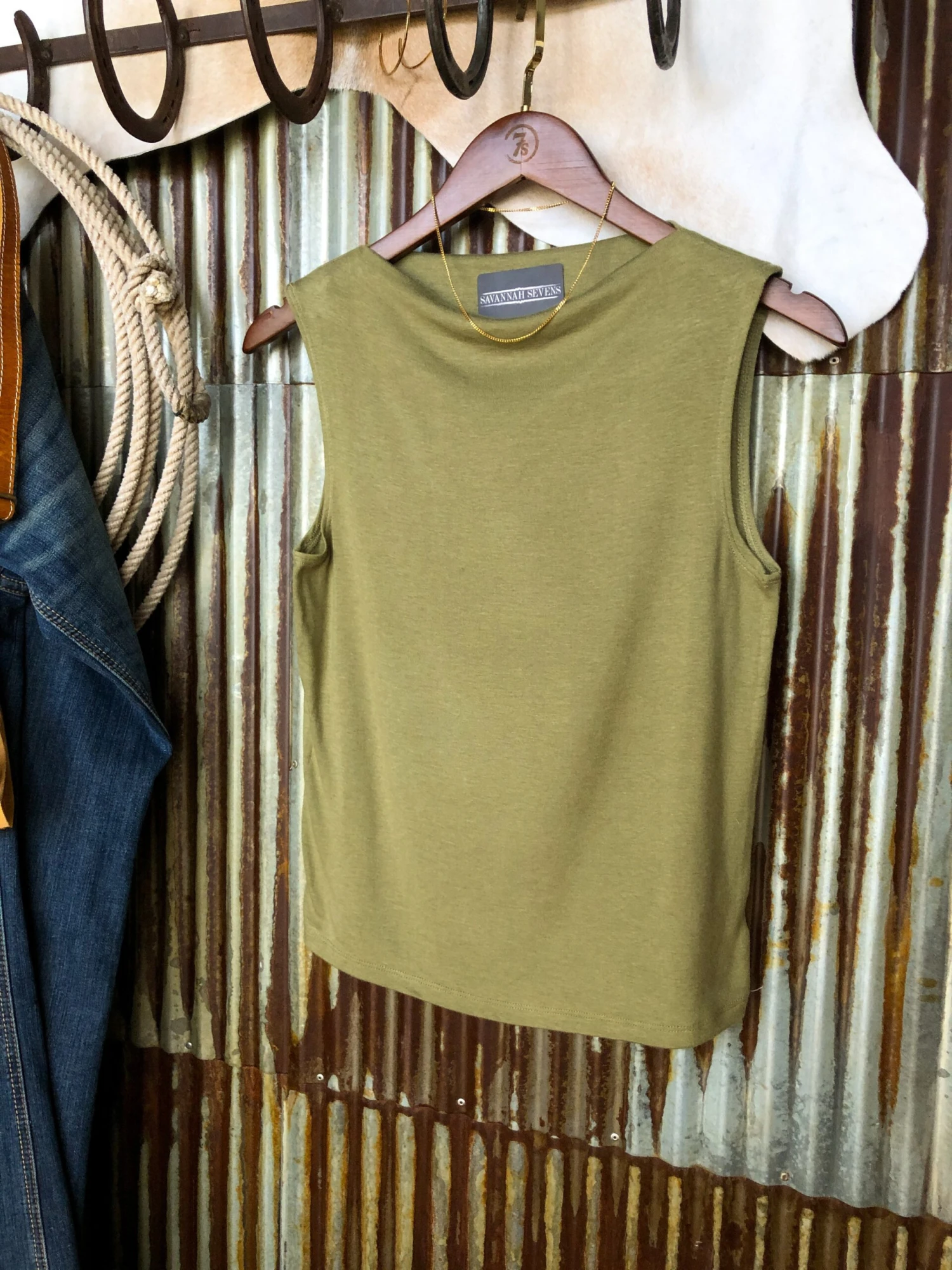 - Olive cowl neck sleeveless top.