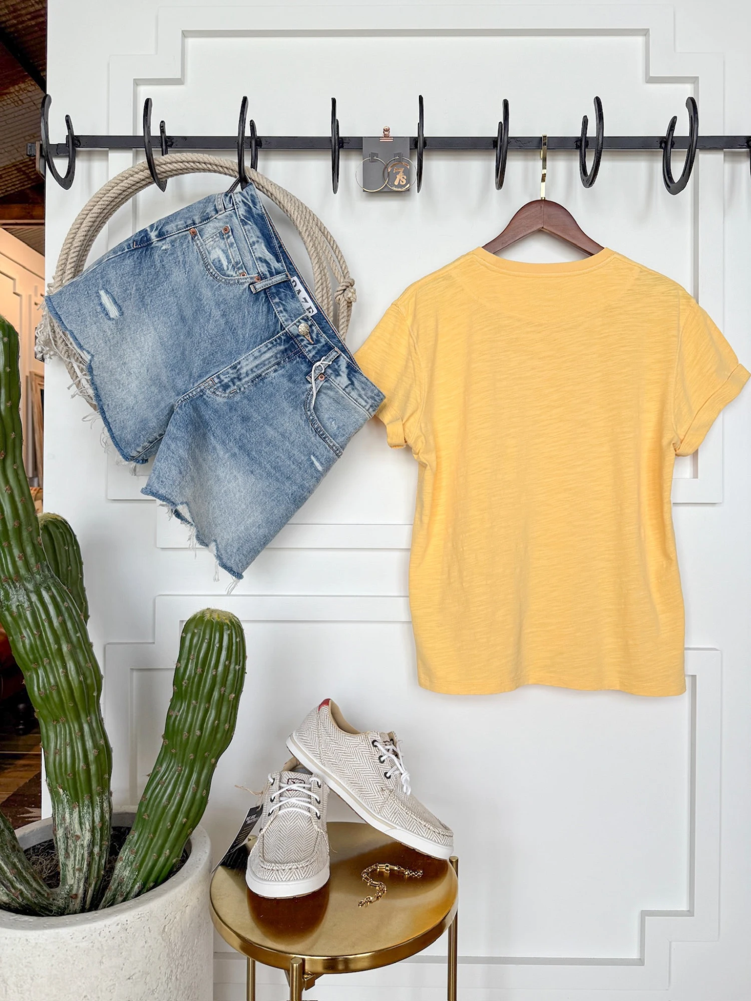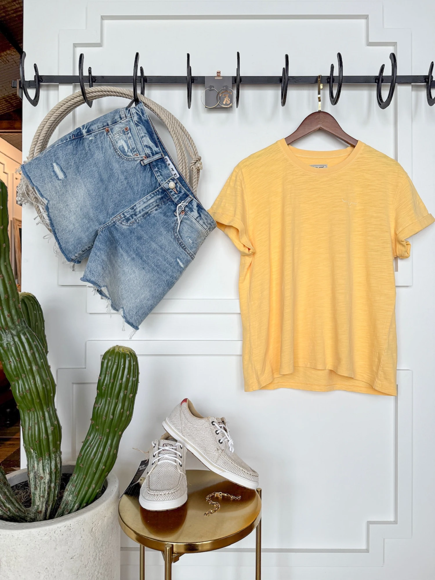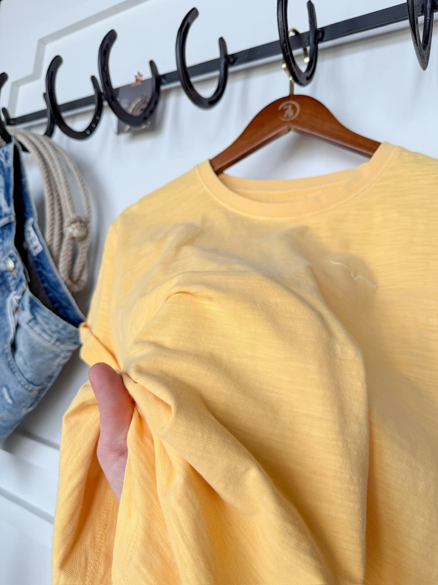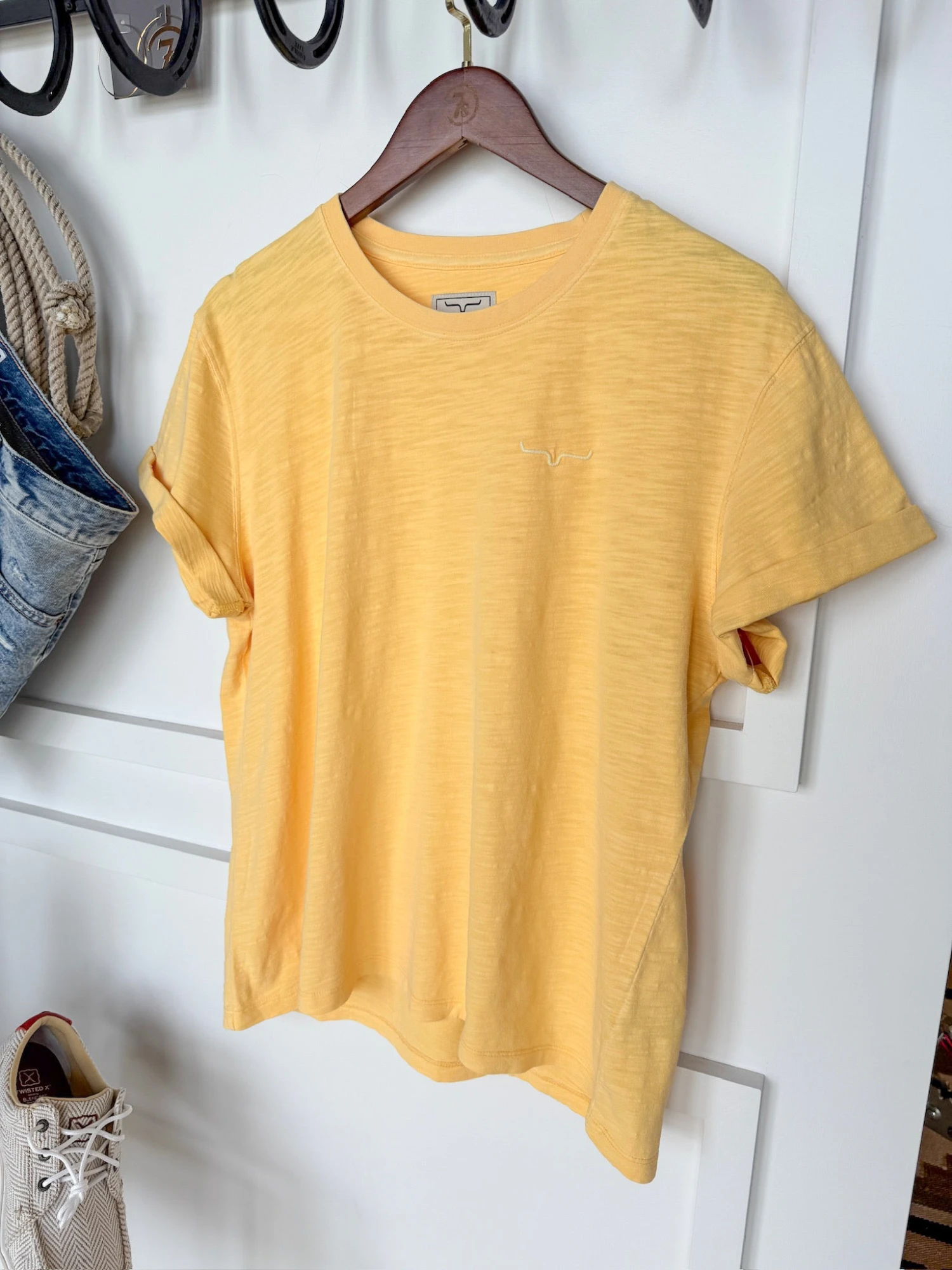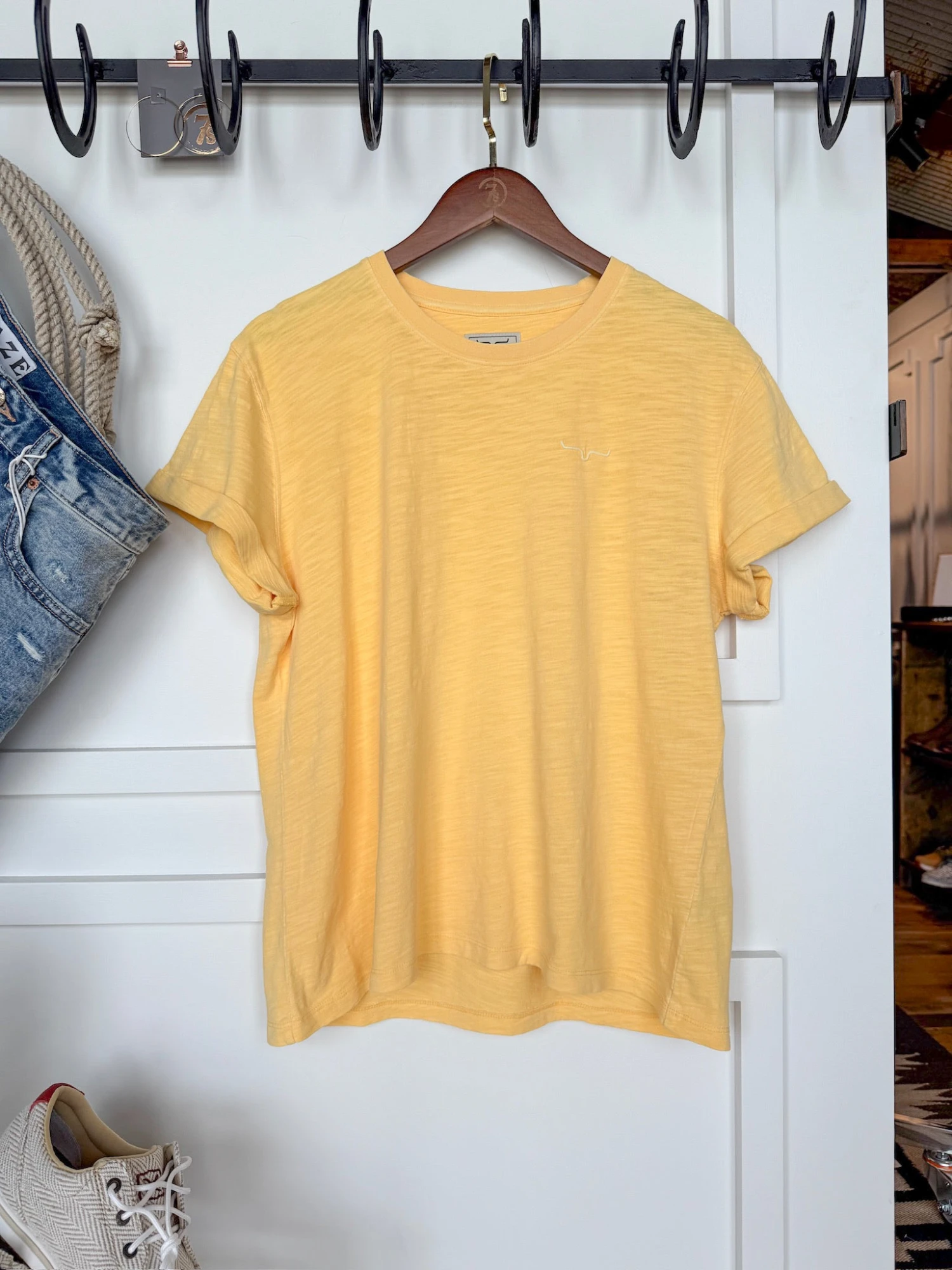 - Golden yellow short sleeve slub tee.