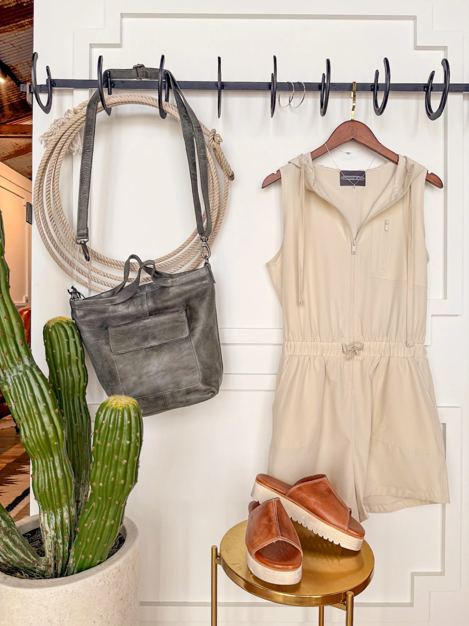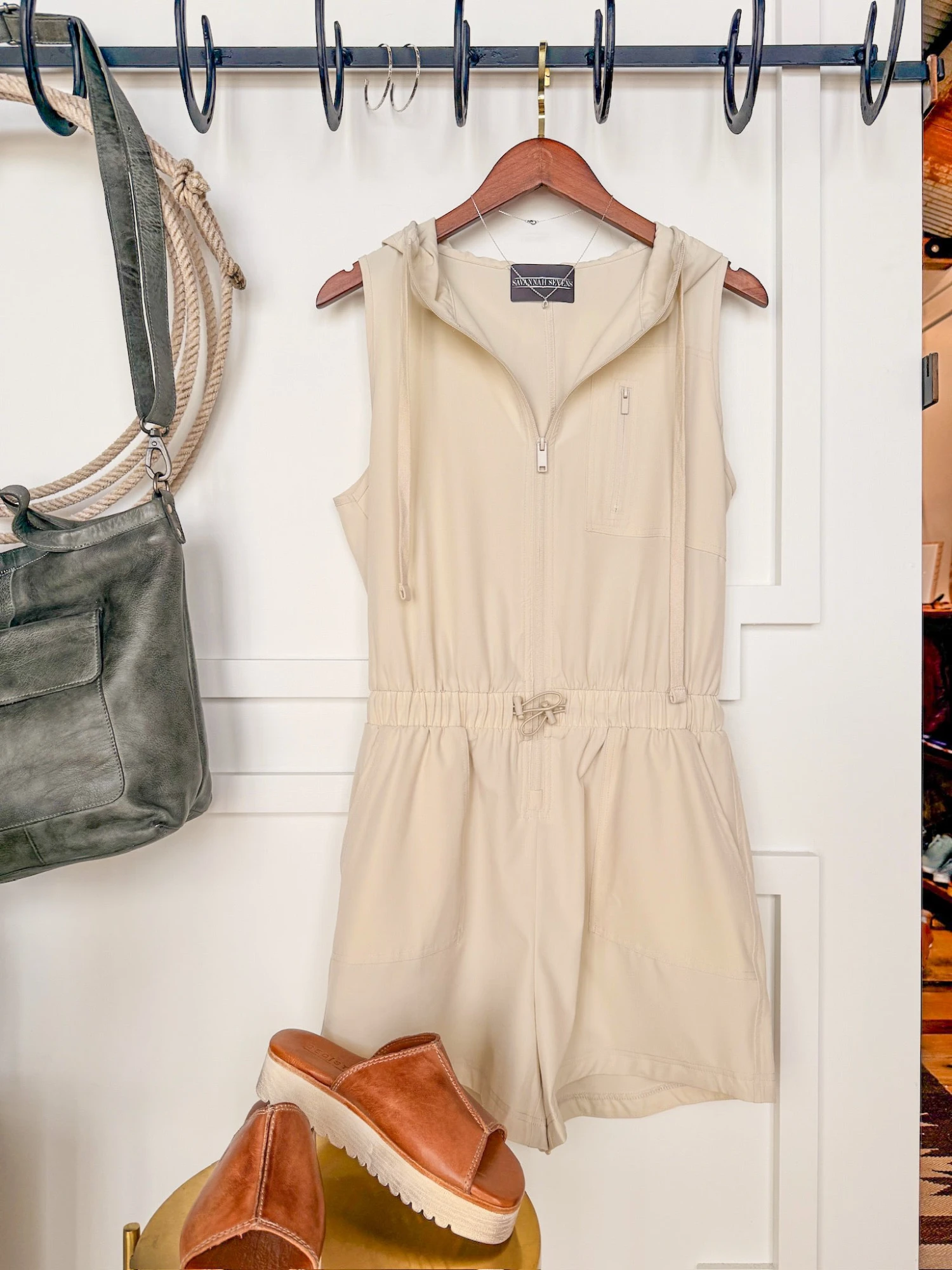 - Bone sleeveless hooded romper.