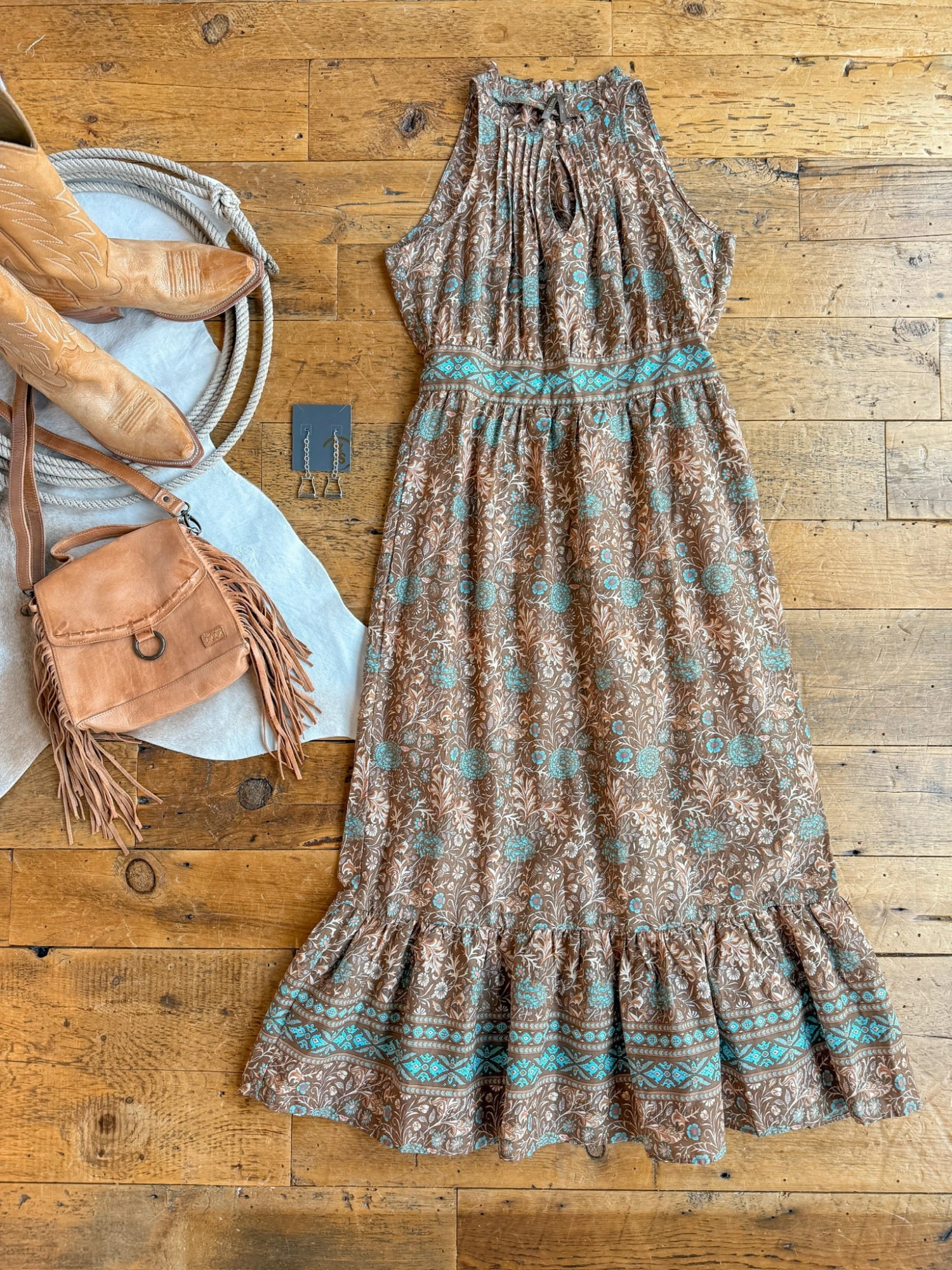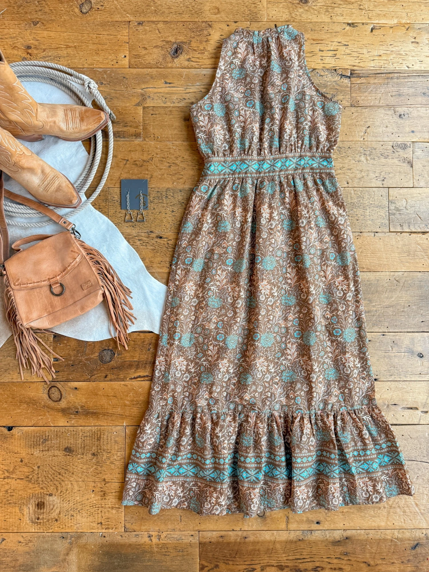 - Tobacco halter neck maxi dress.