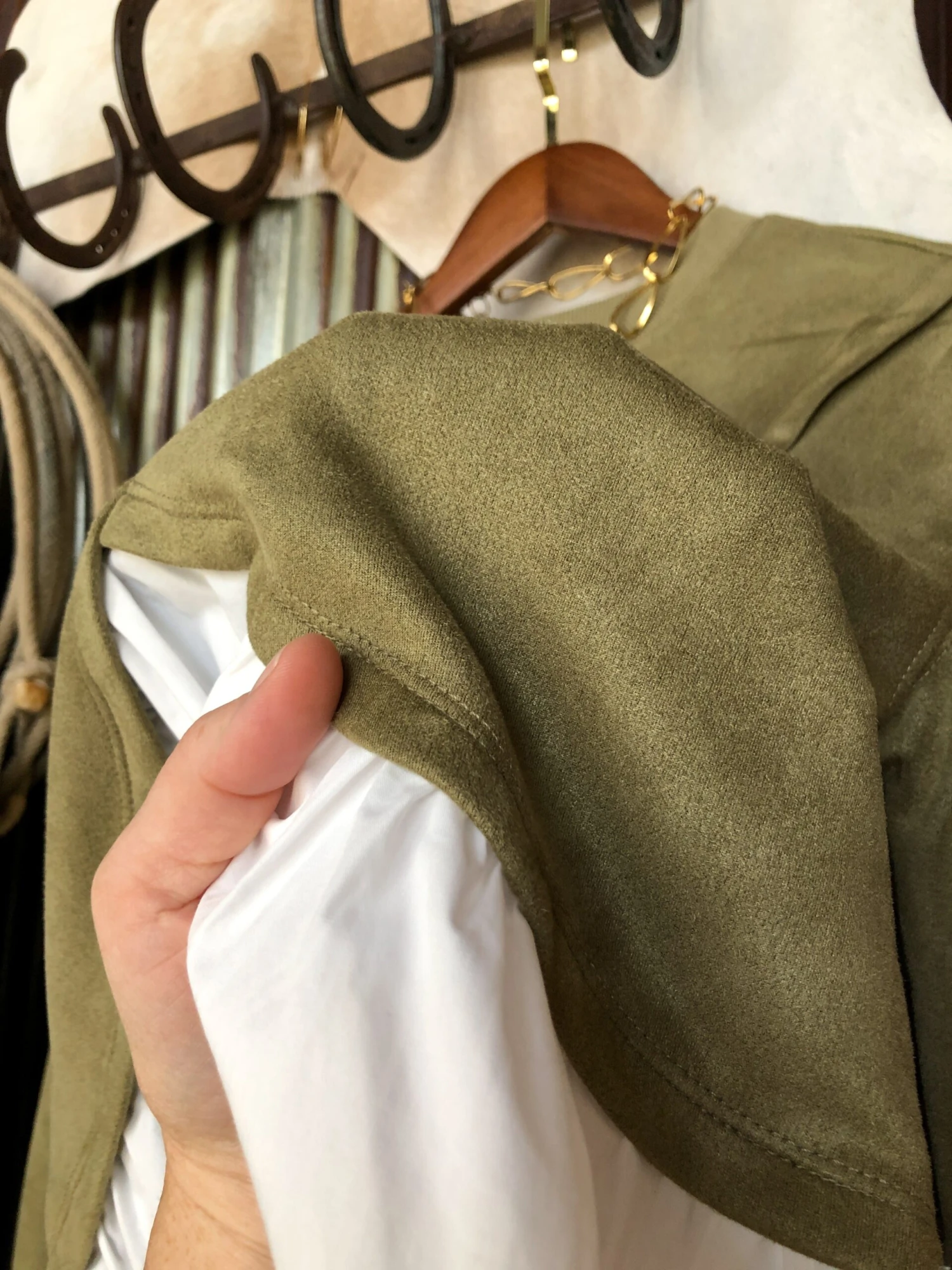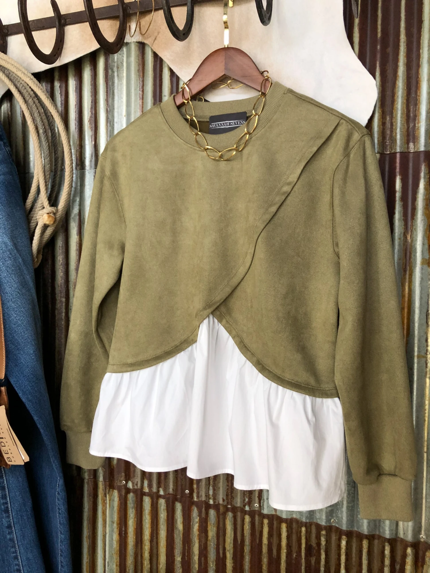 - Sage faux suede long sleeve top.