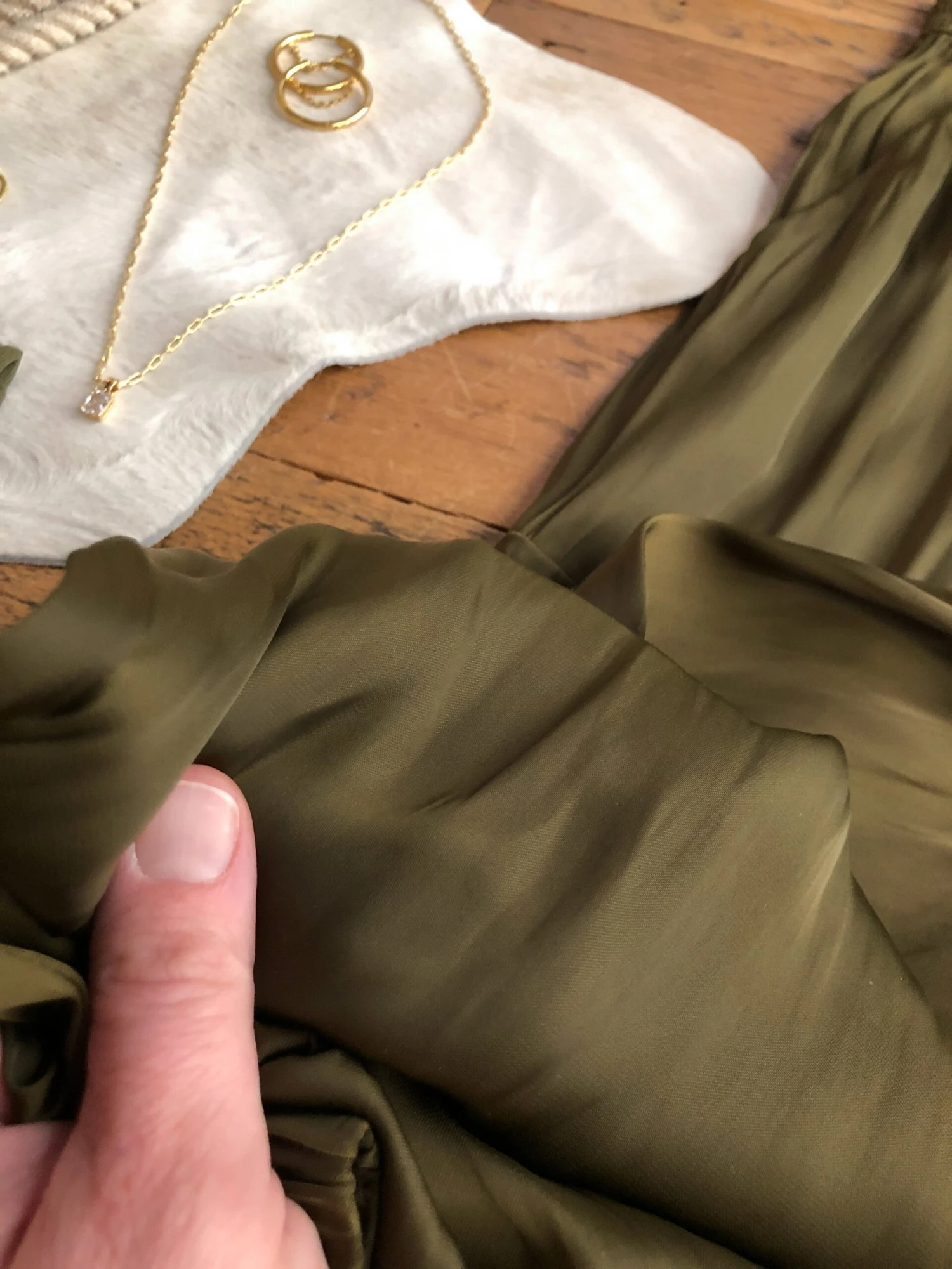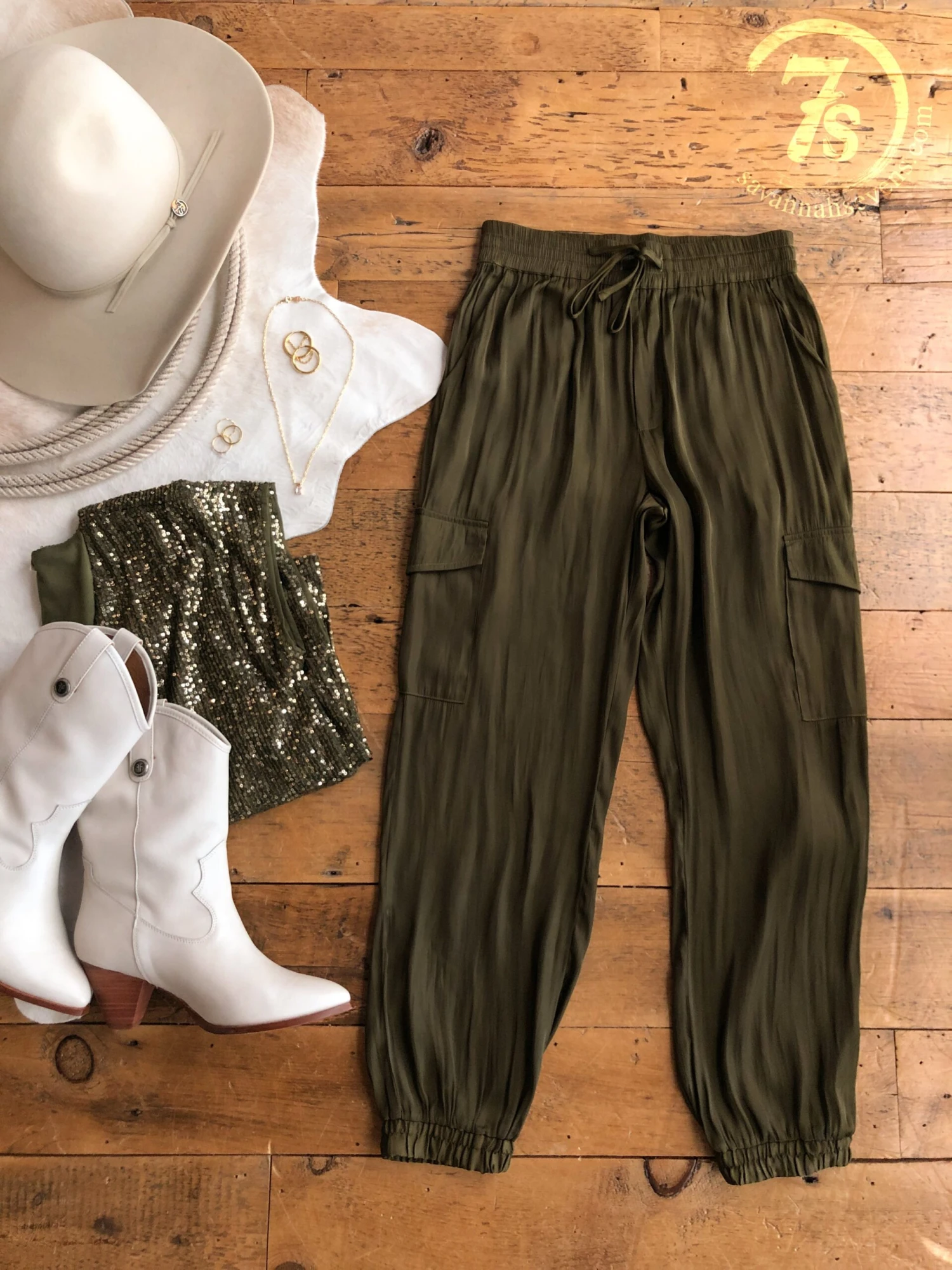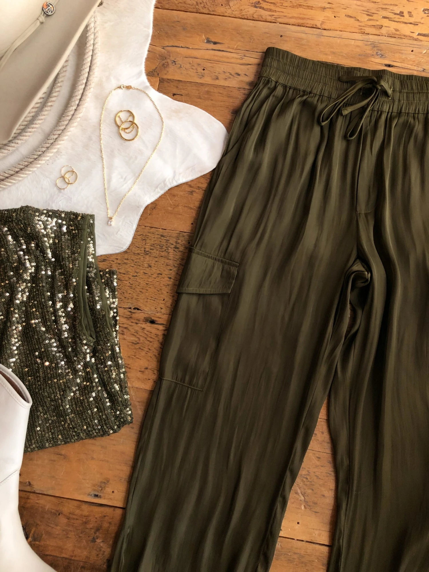 - Olive bark satin jogger pants.