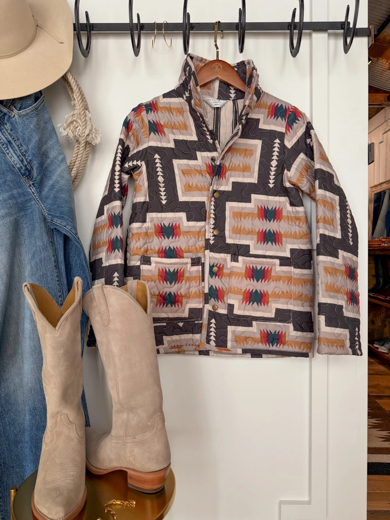 - Charcoal and vibrant southwest quilted snap summary jacket.