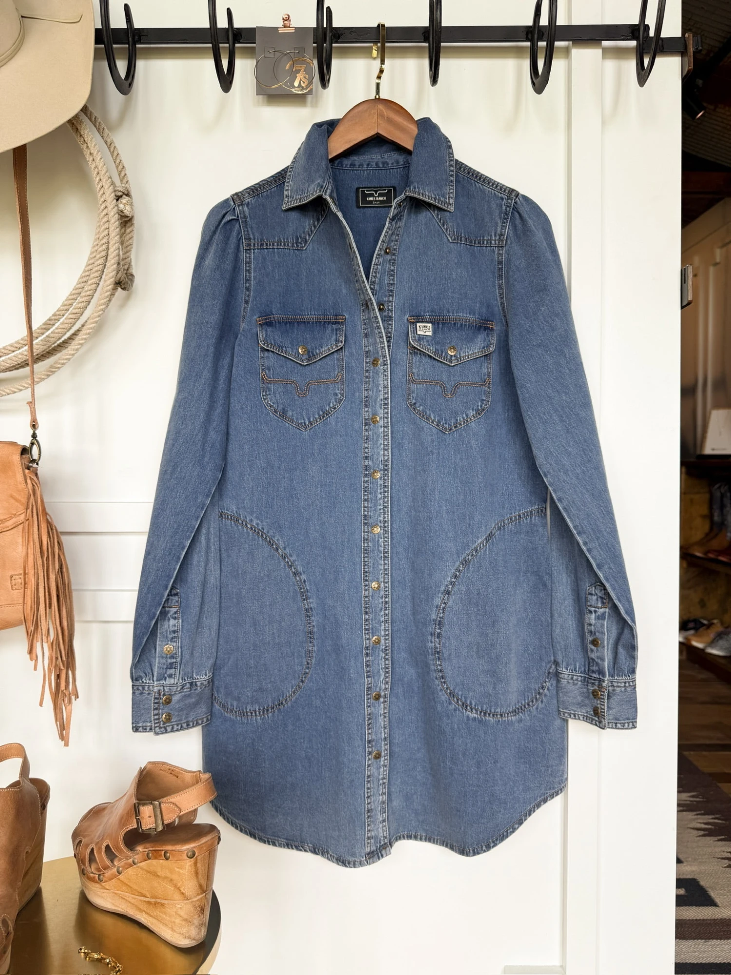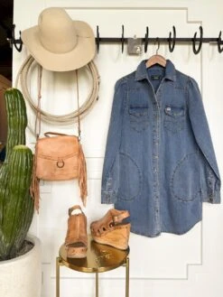 - Medium wash denim long sleeve snap summary dress.