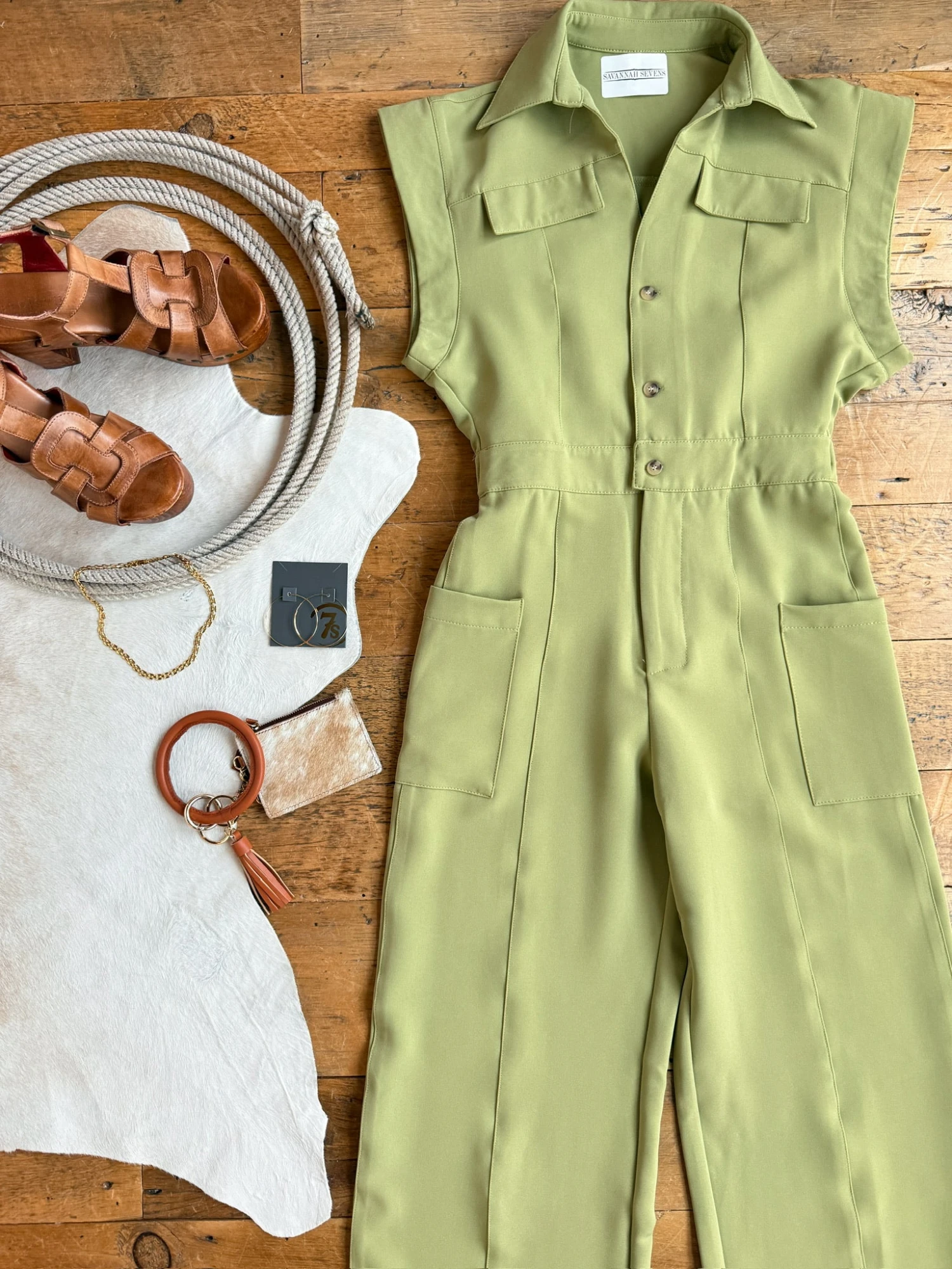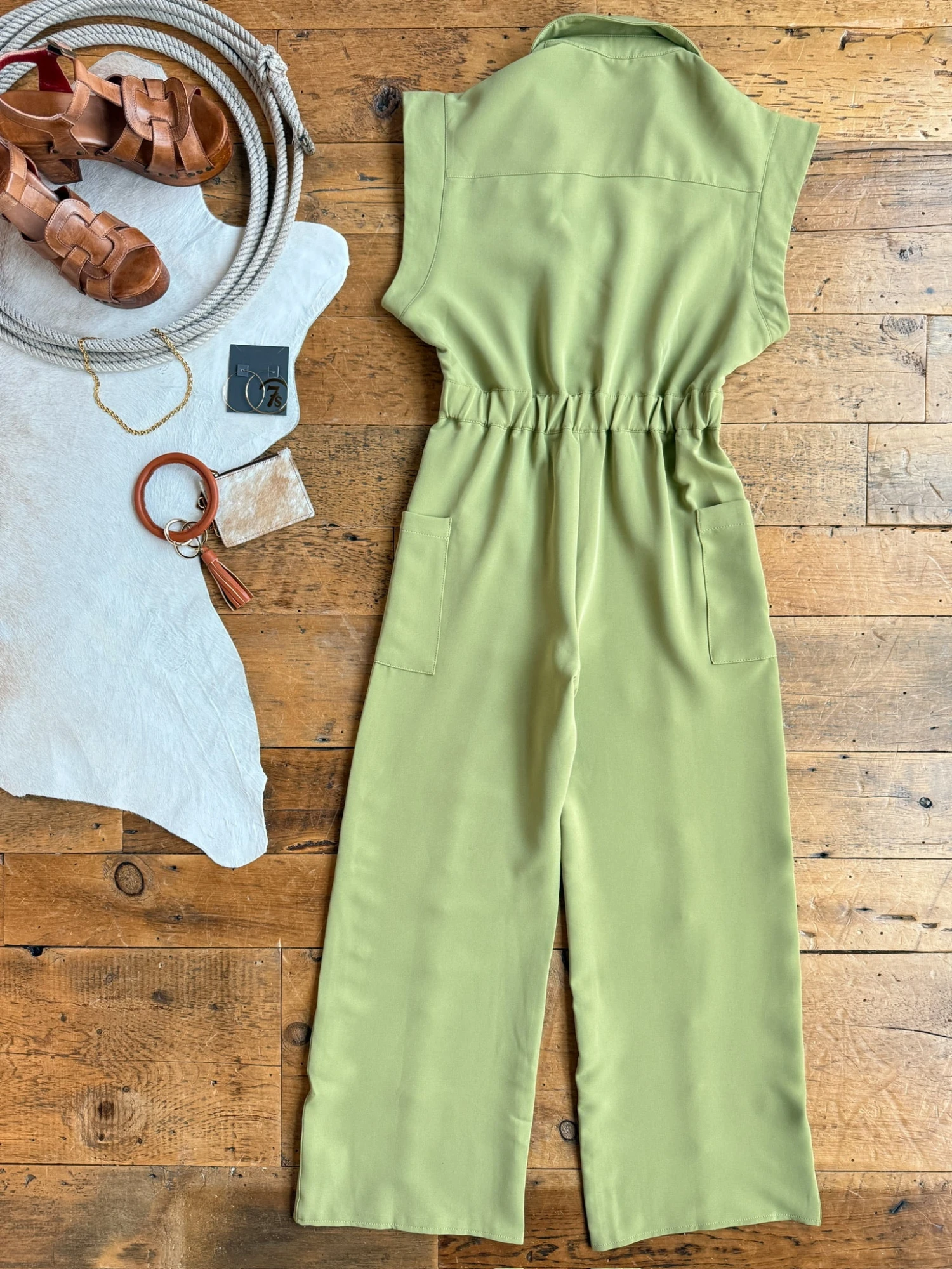 - Pea green short sleeve jumpsuit.