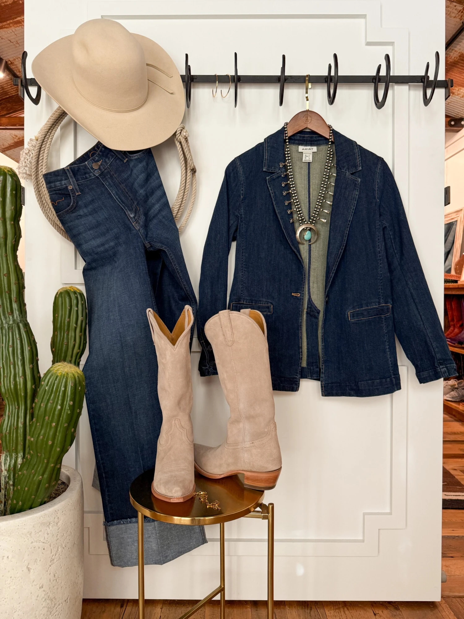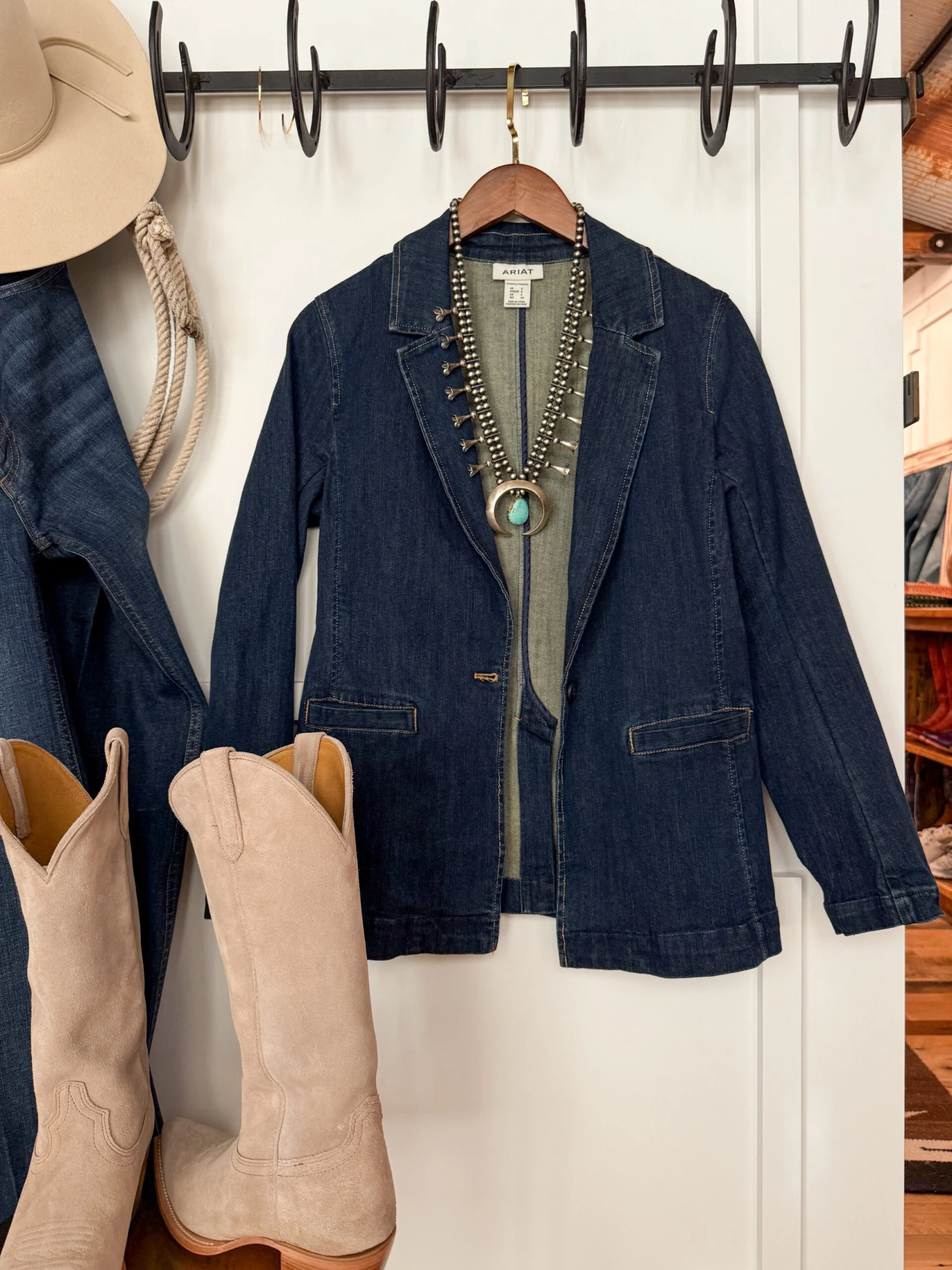 - Dark denim blazer.