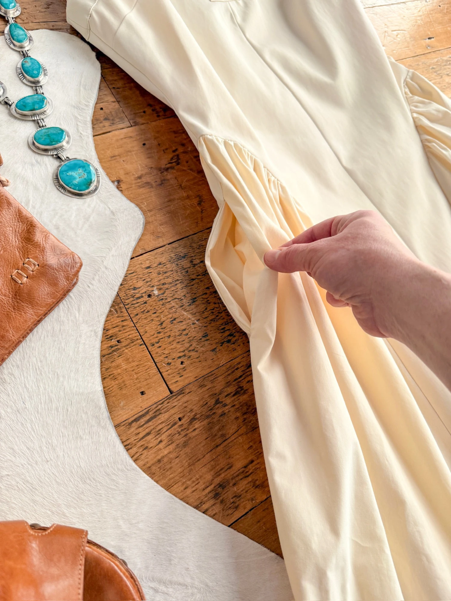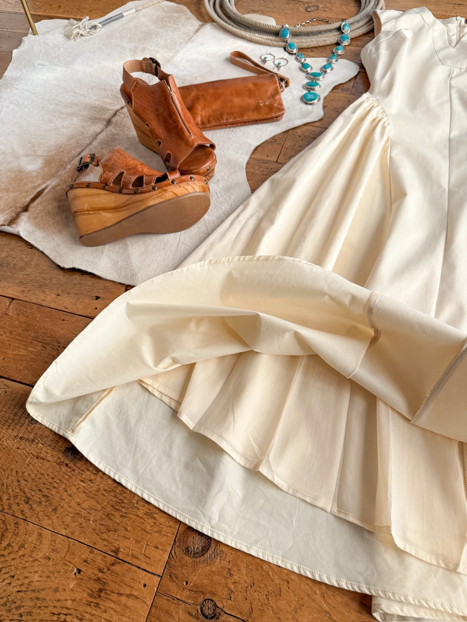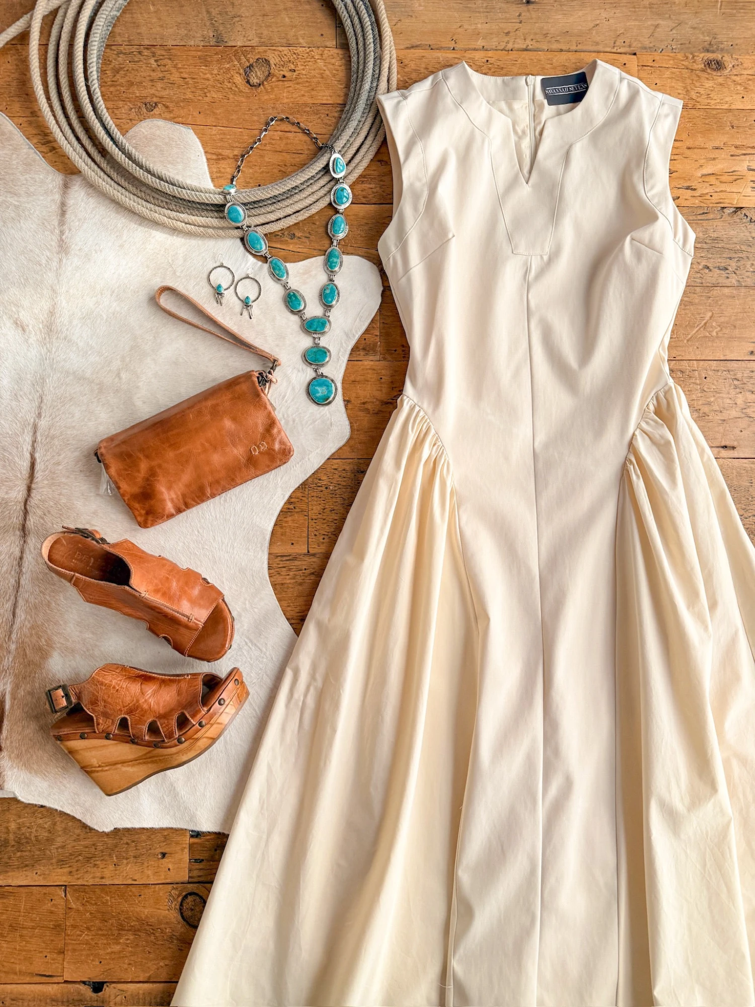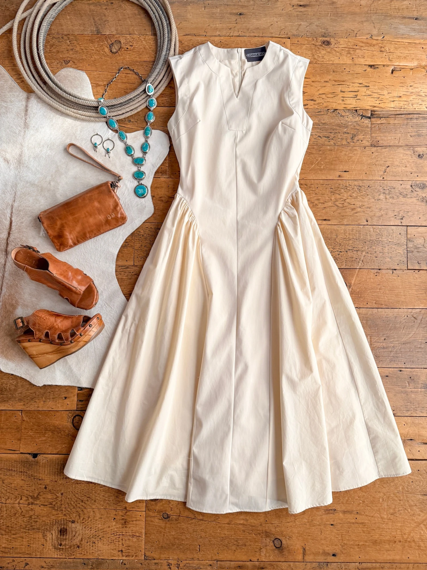 - Cream sleeveless midi dress.
