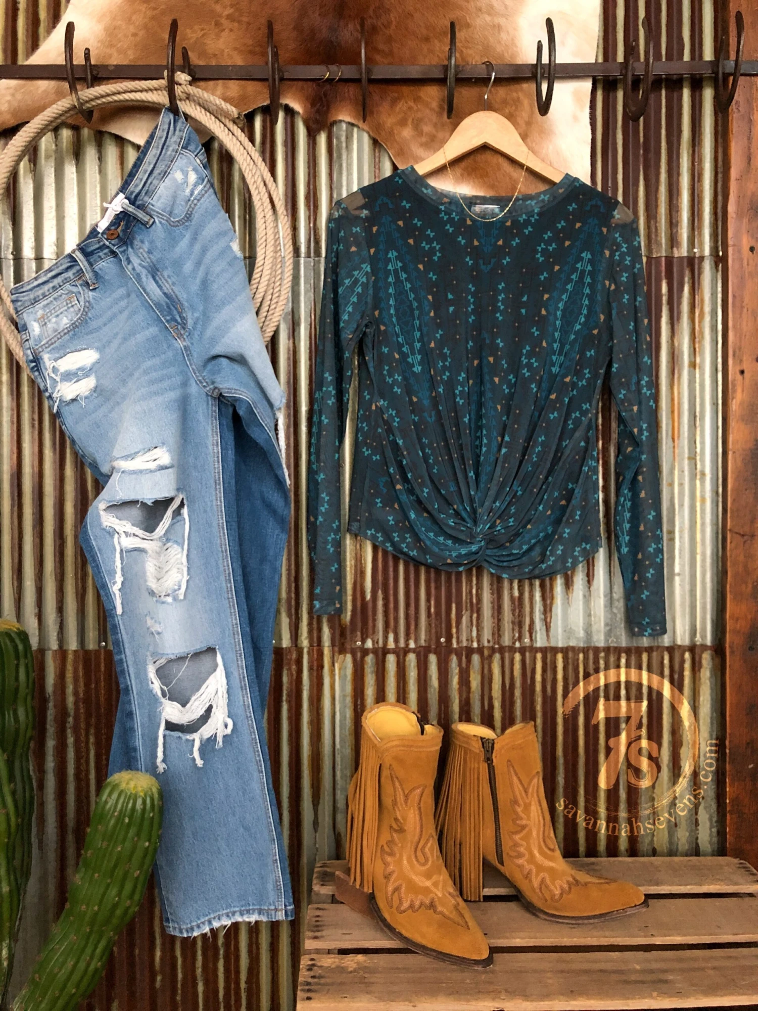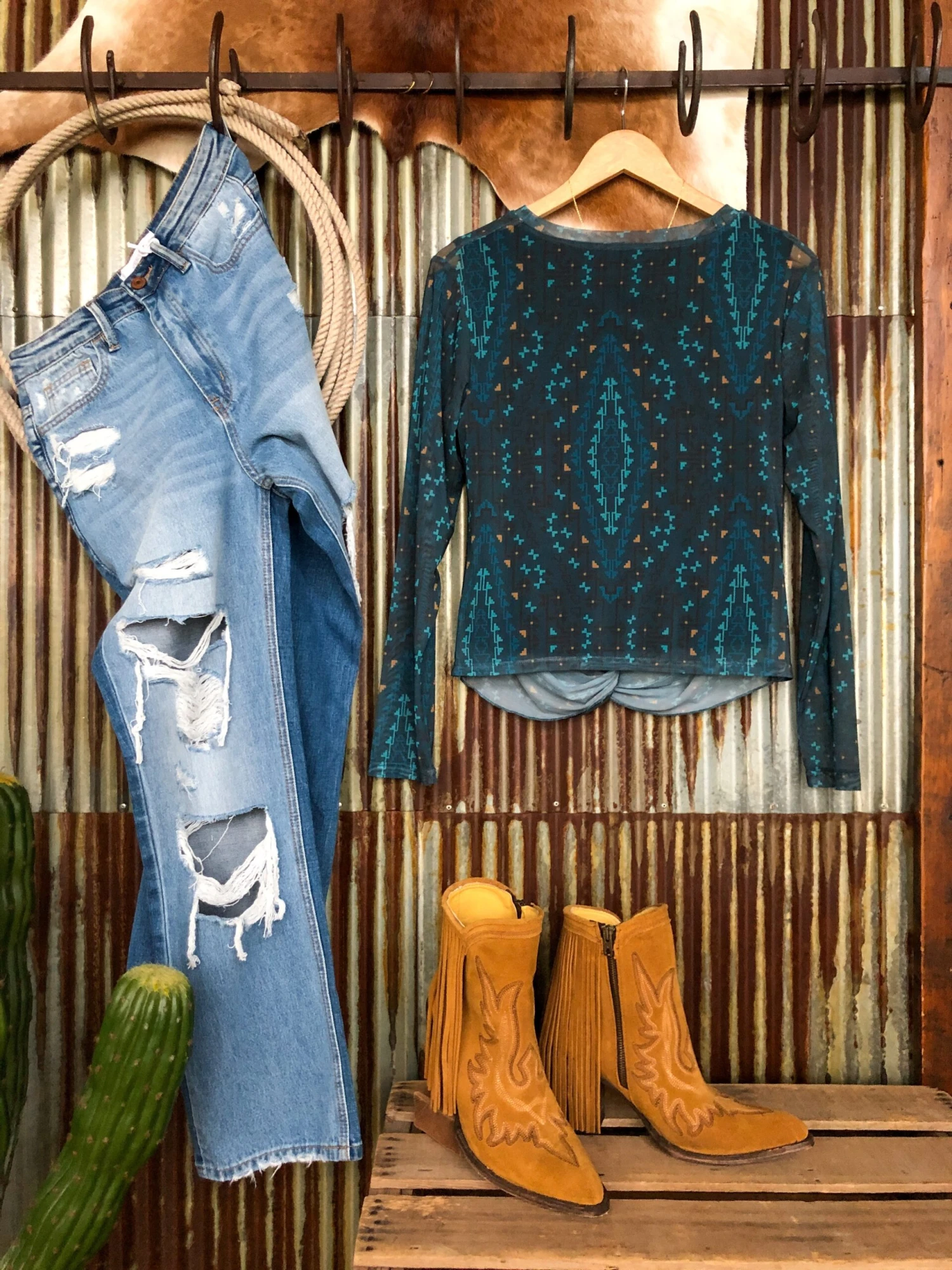 - Teal with turquoise and aspen gold southwest patterns throughout.