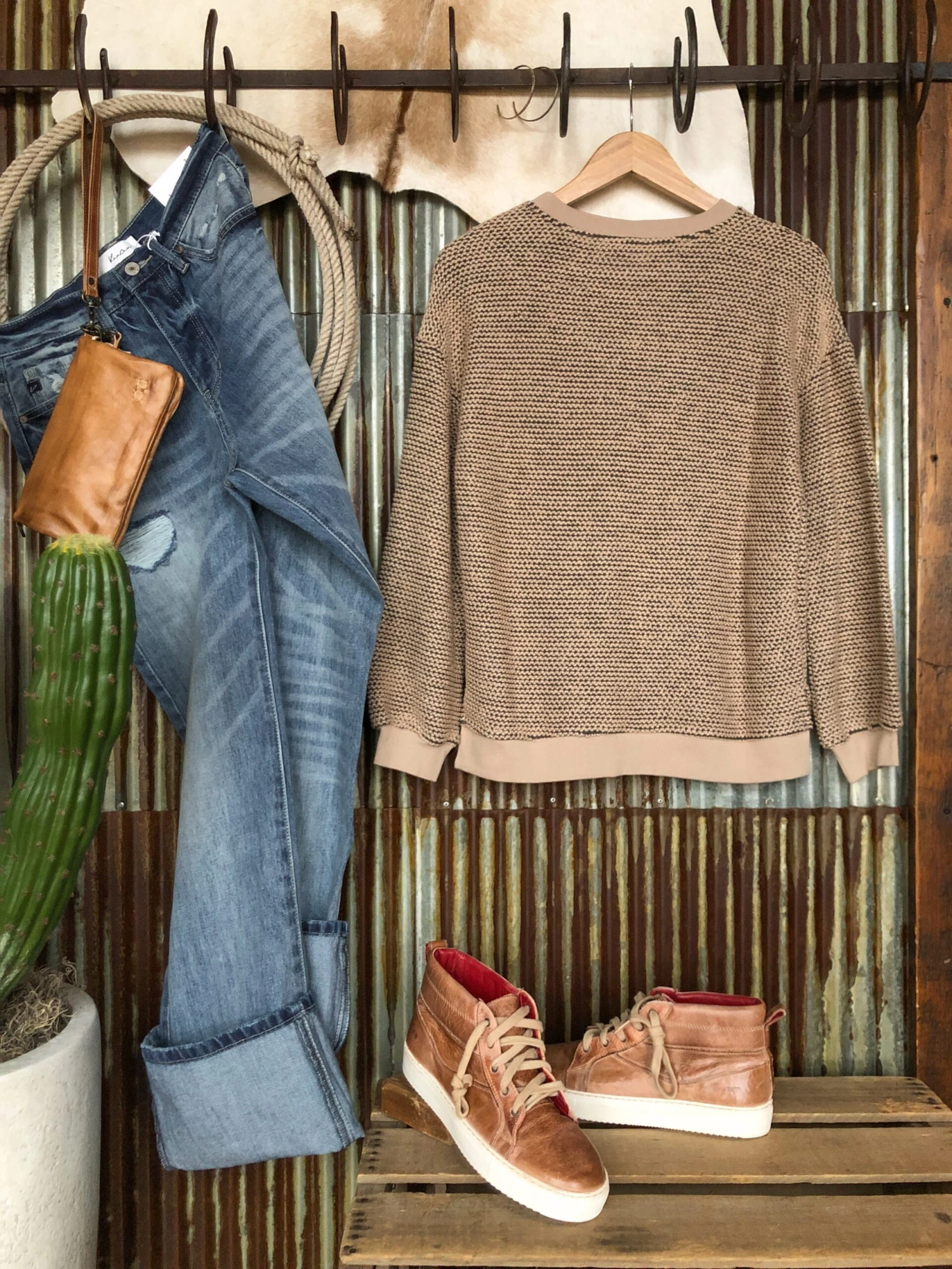 - Shown styled with The Trace High Rise 90’s Wide Leg Jean, The Bowies shoes, The Roca crossbody wristlet, and Montrose Earrings.