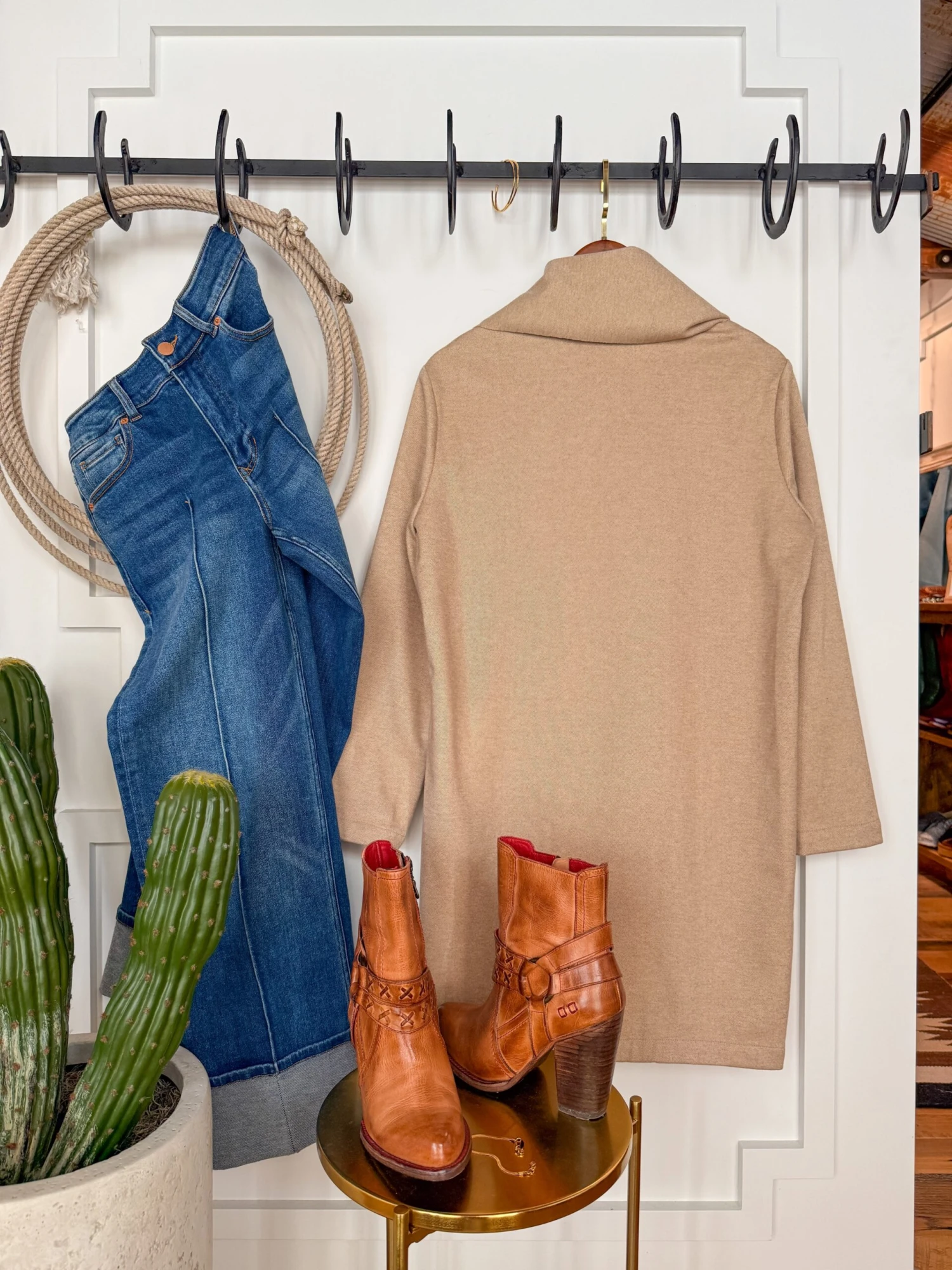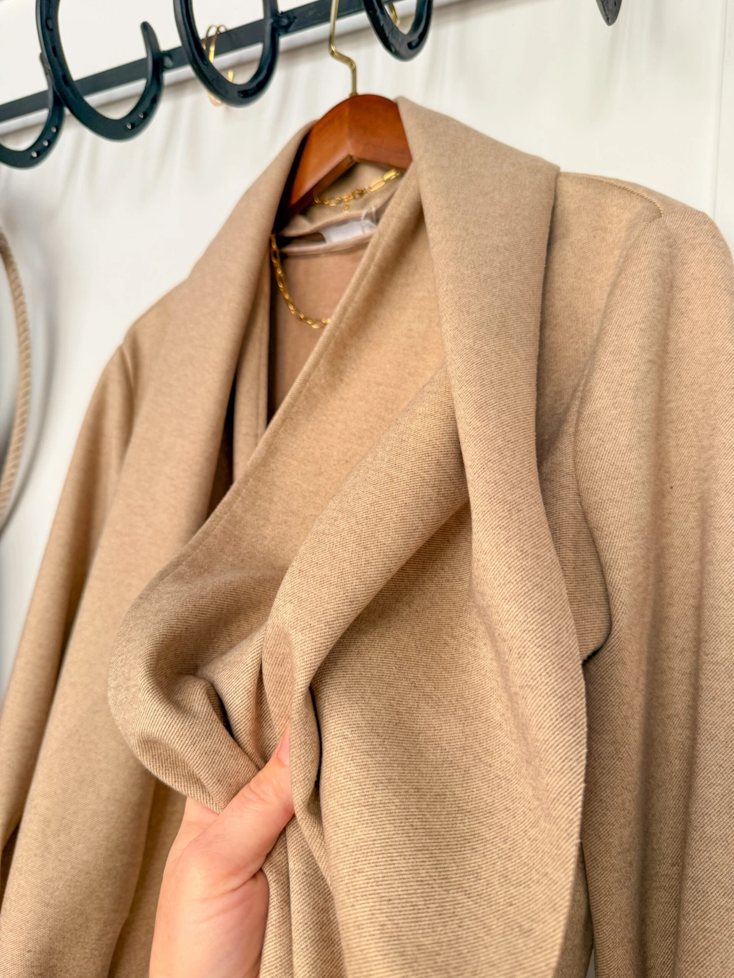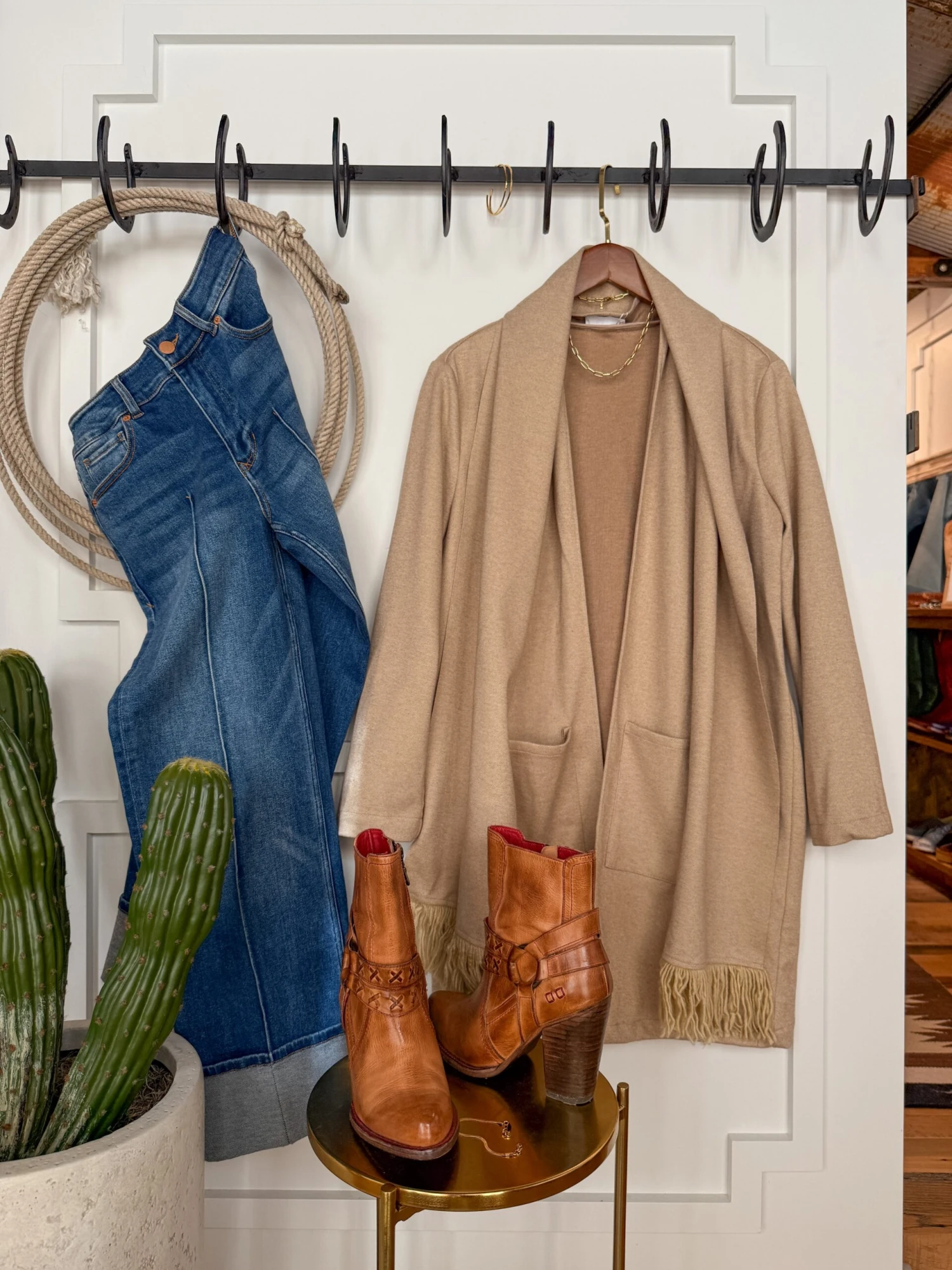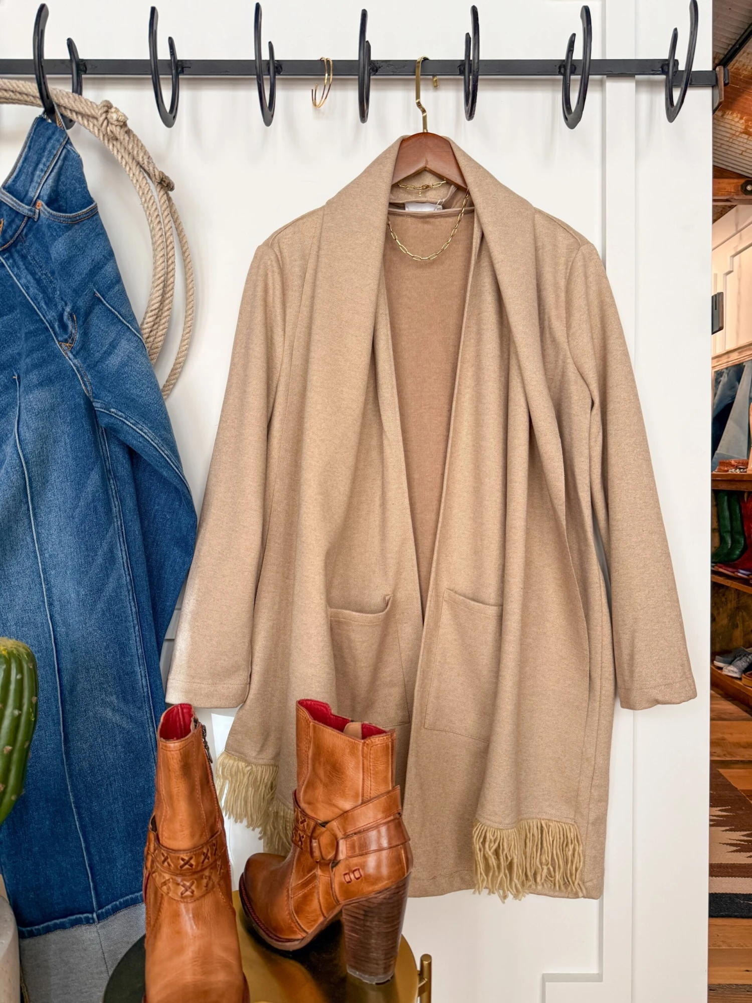 - Natural oatmeal open long cardigan.