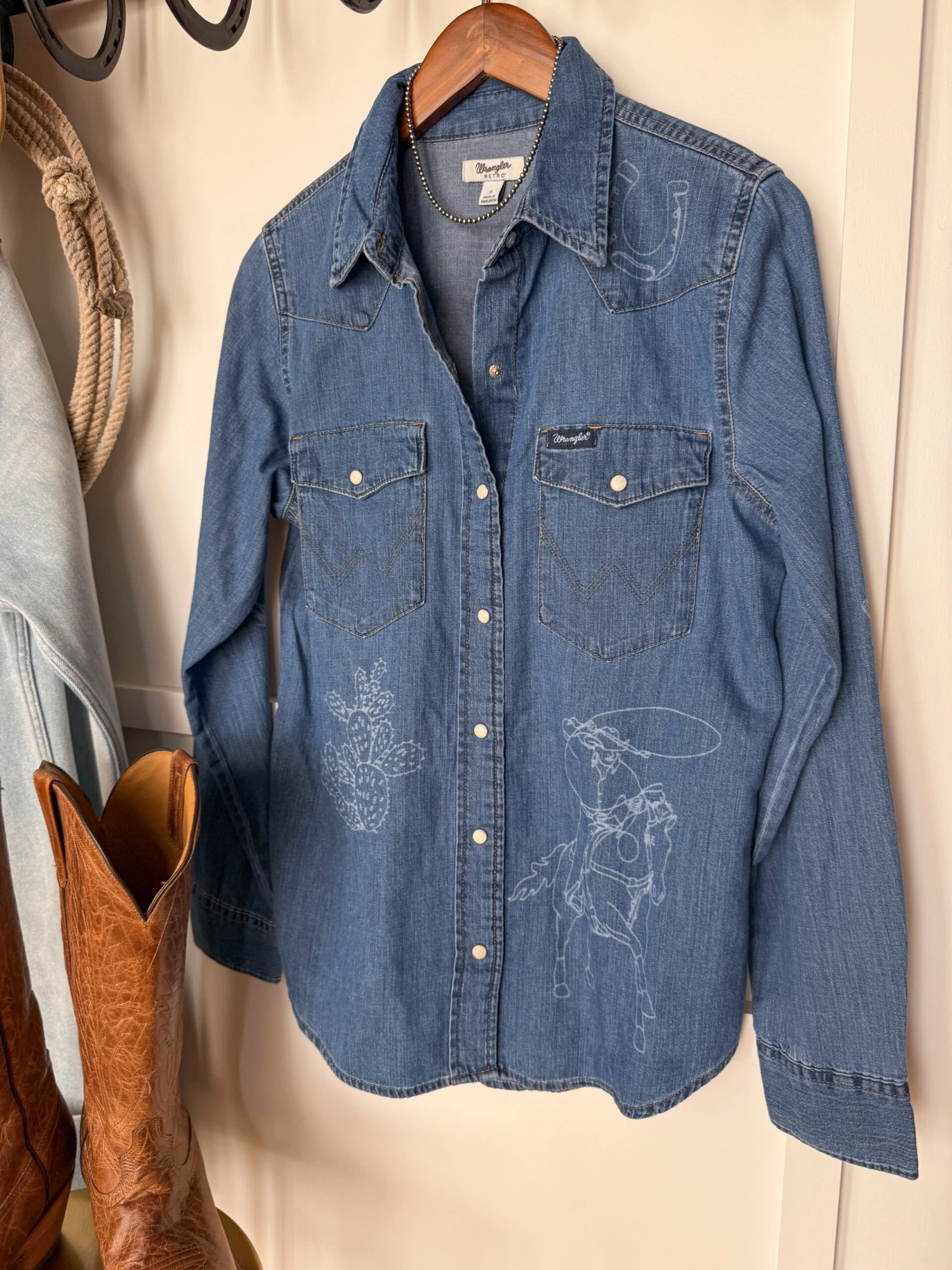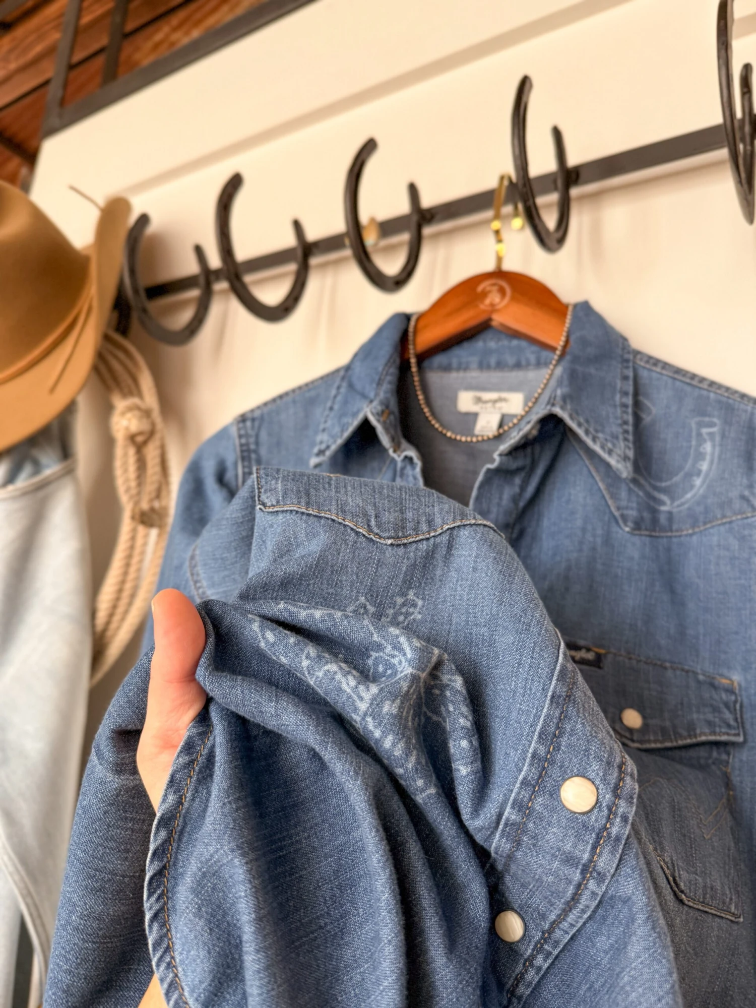 - Pearl snap chest pockets with traditional logo stitching and a hidden pen slot.