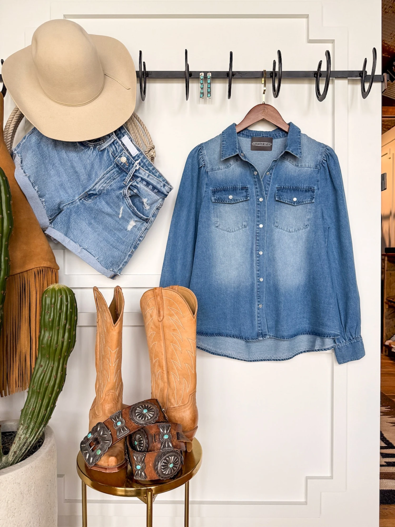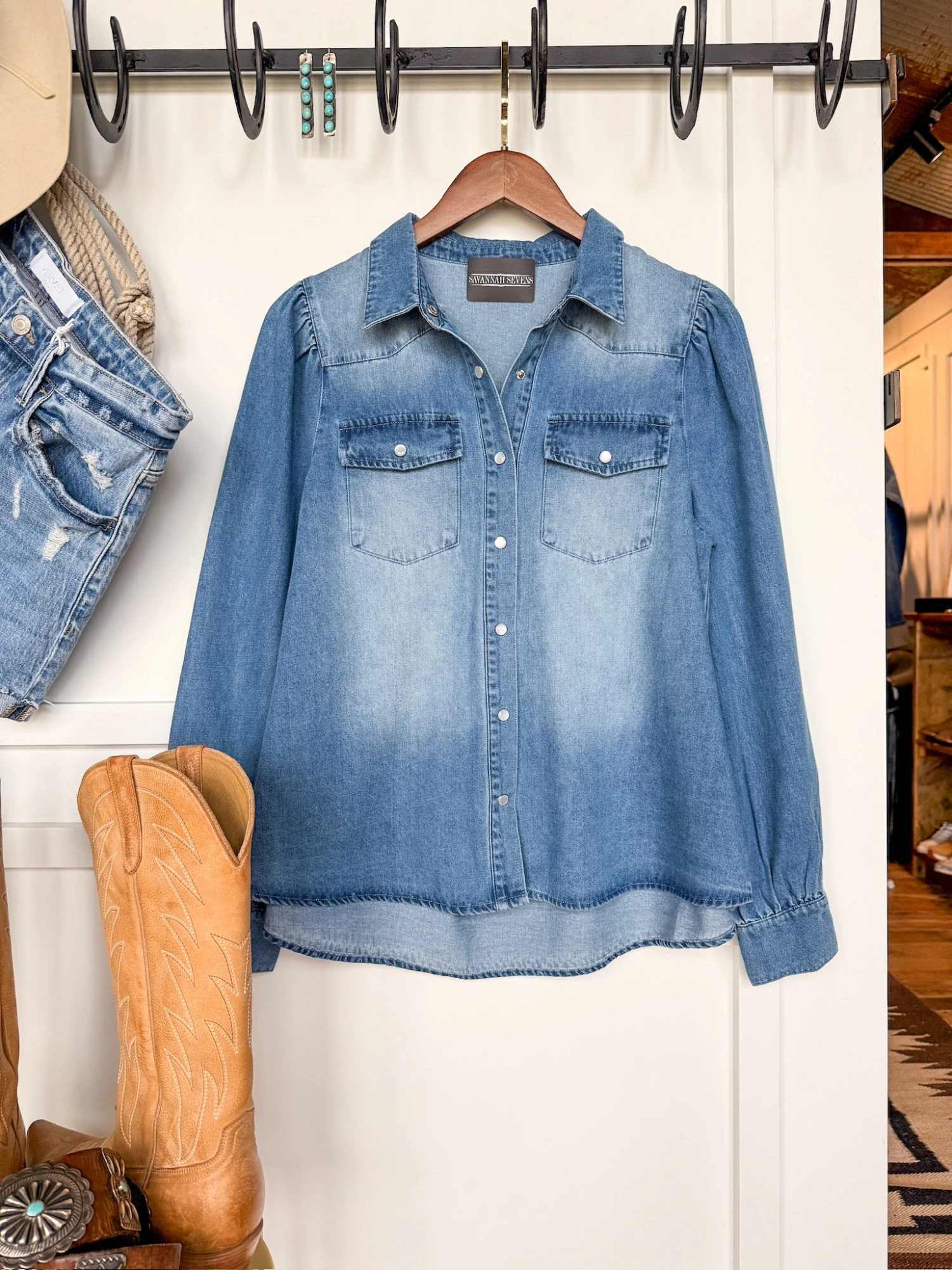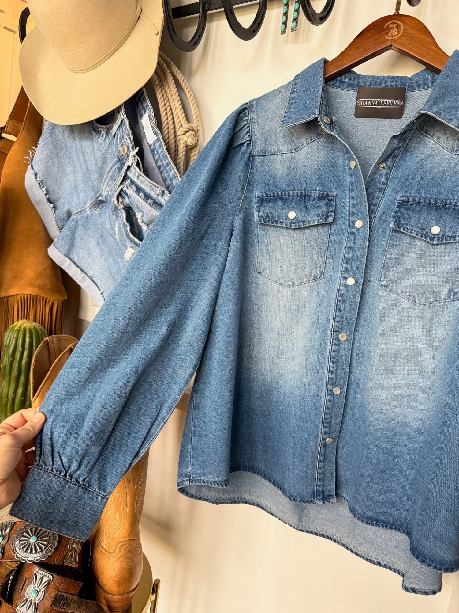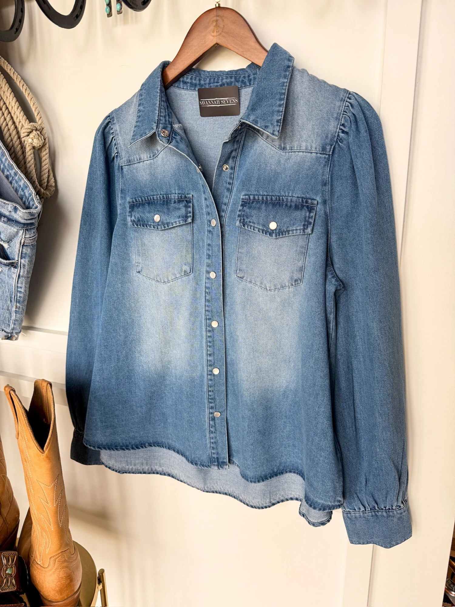 - Medium wash denim long sleeve snap summary top.