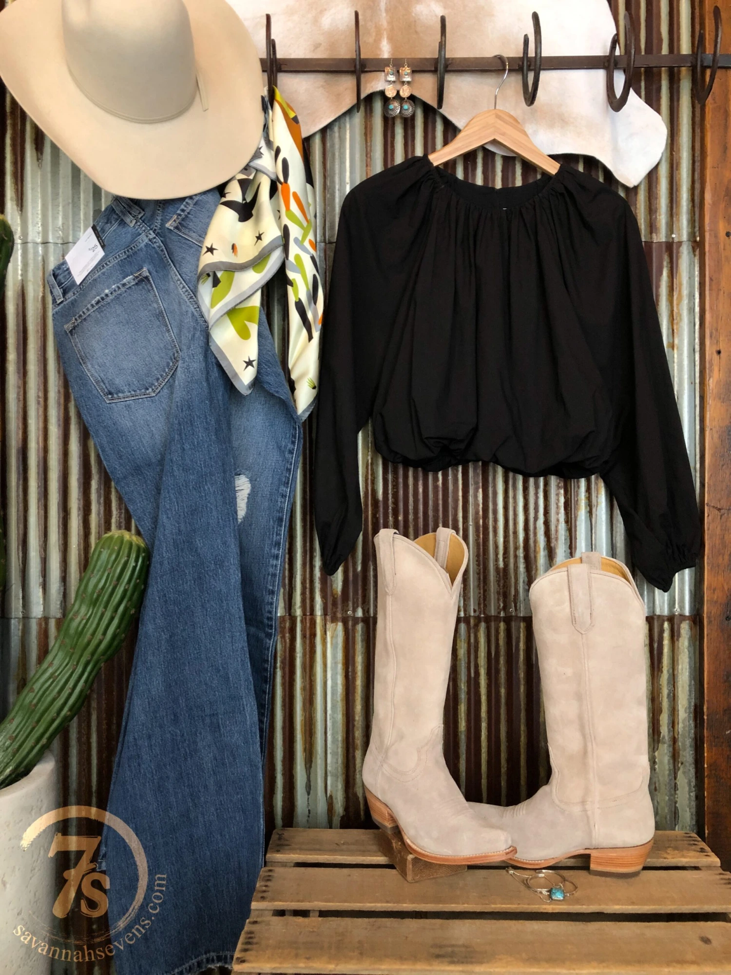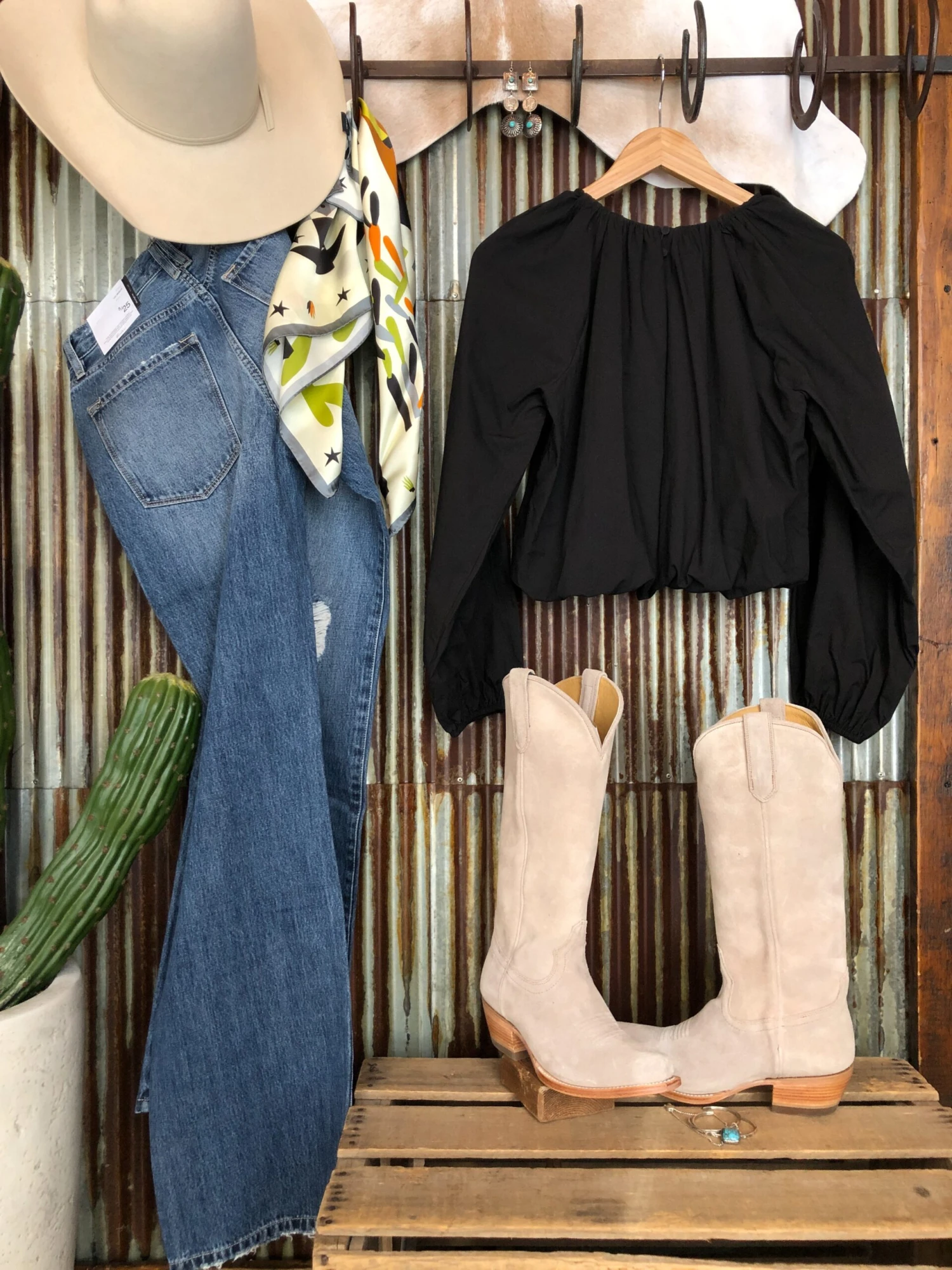 - Shown styled with The Trace High Rise 90’s Wide Leg Jean, The Shiloh boots, and Retro Ranch Neck Scarf.