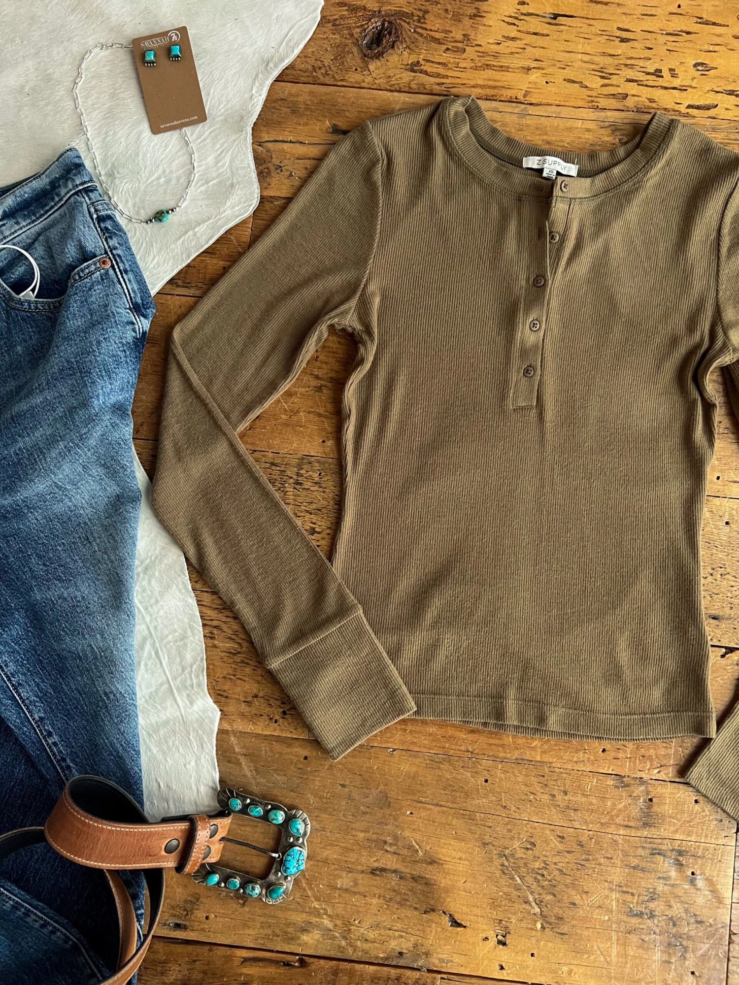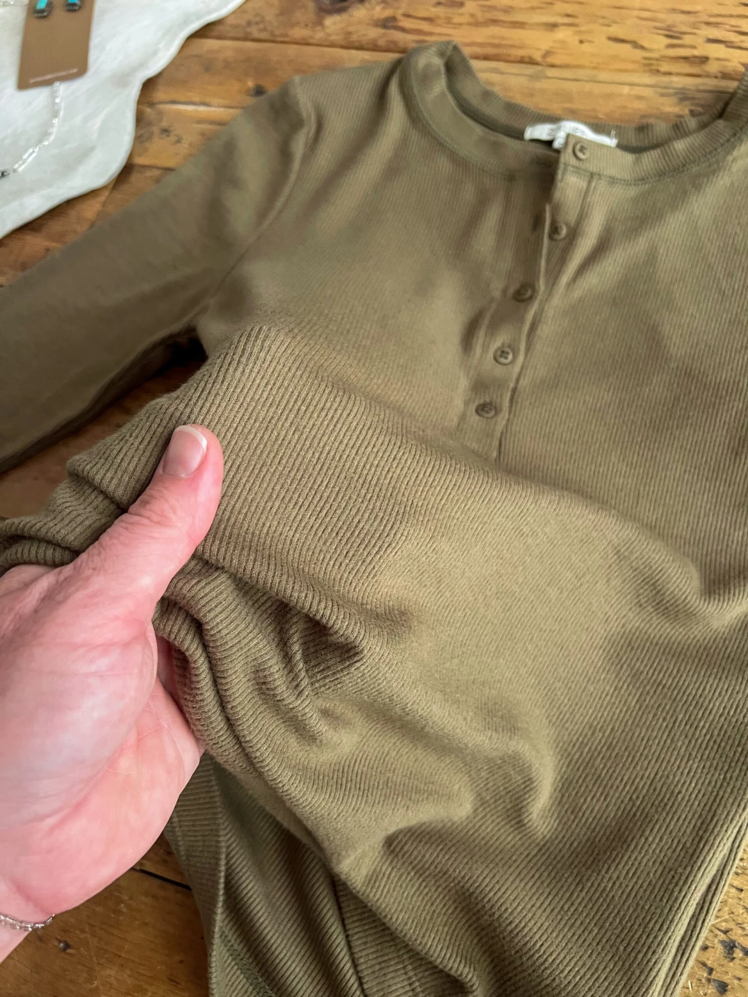 - Olive ribbed long sleeve quarter summary top.