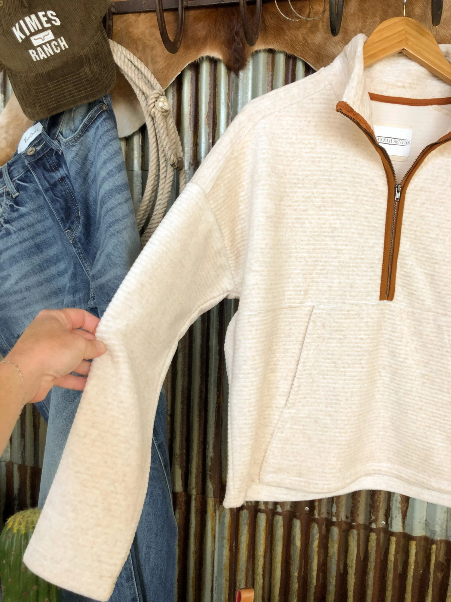 - Oatmeal soft cord quarter zip pullover.