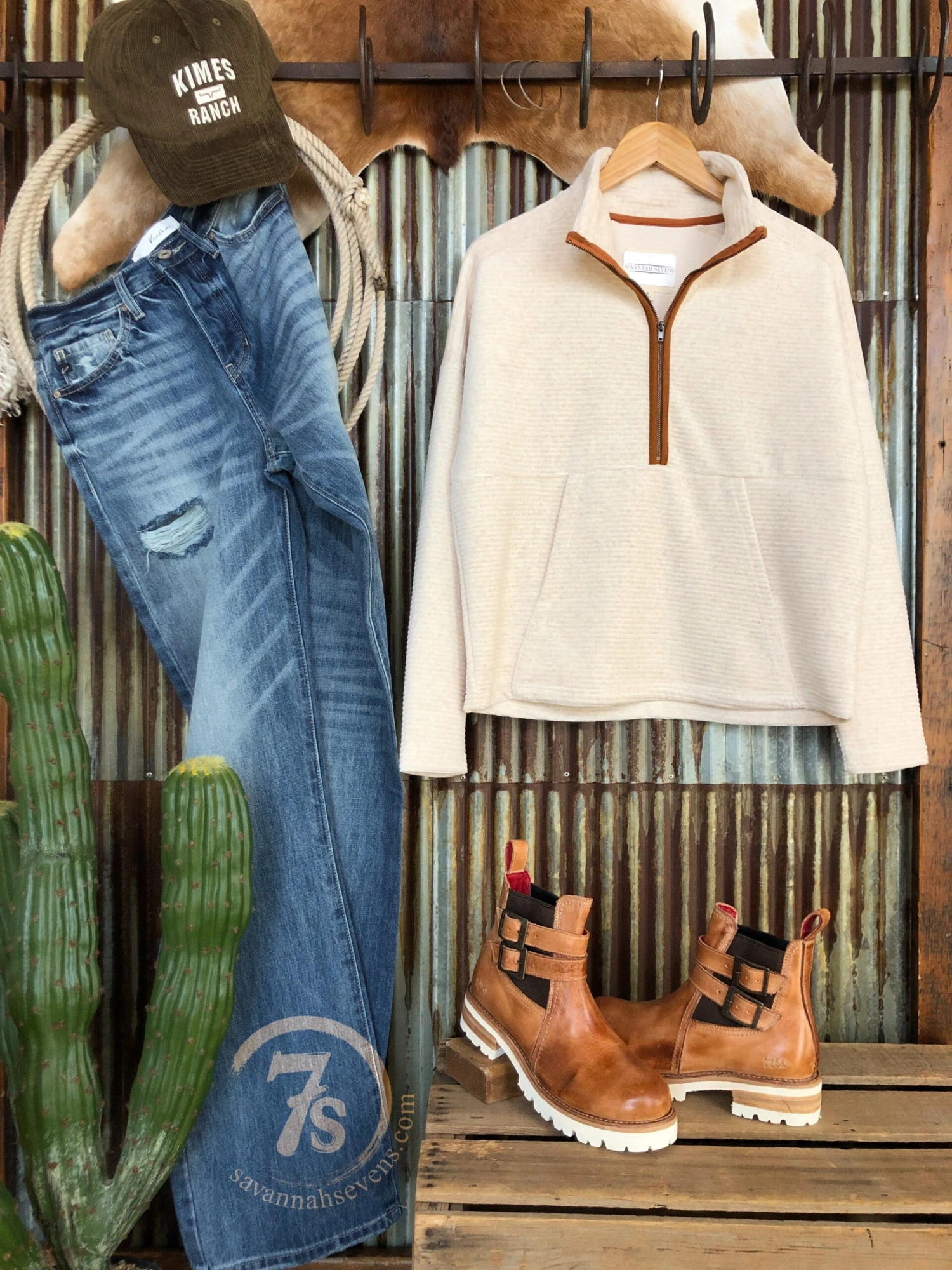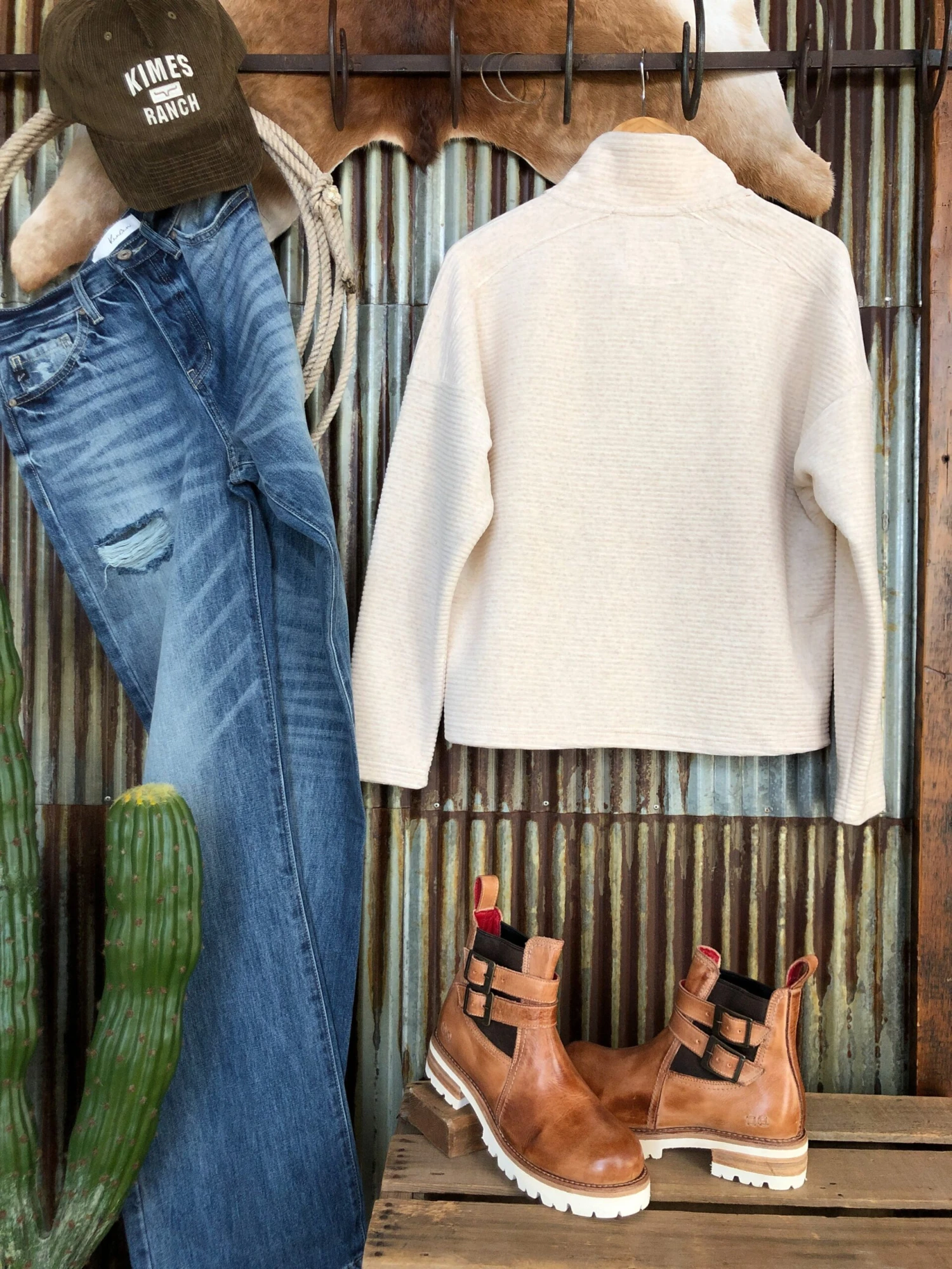 - Shown styled with The Trace High Rise 90’s Wide Leg Jean, The Kallens booties, and Kimes Denton Cap.