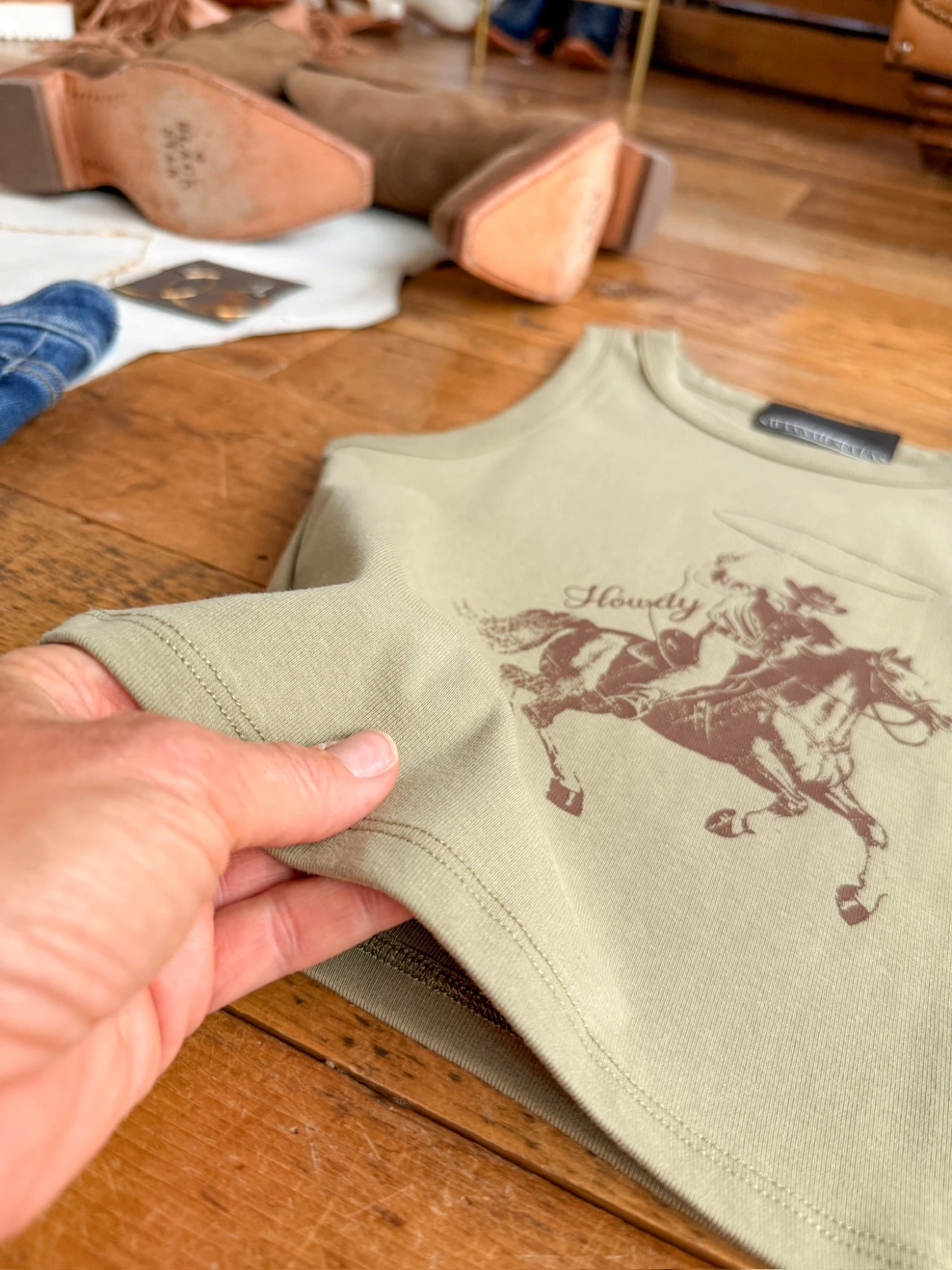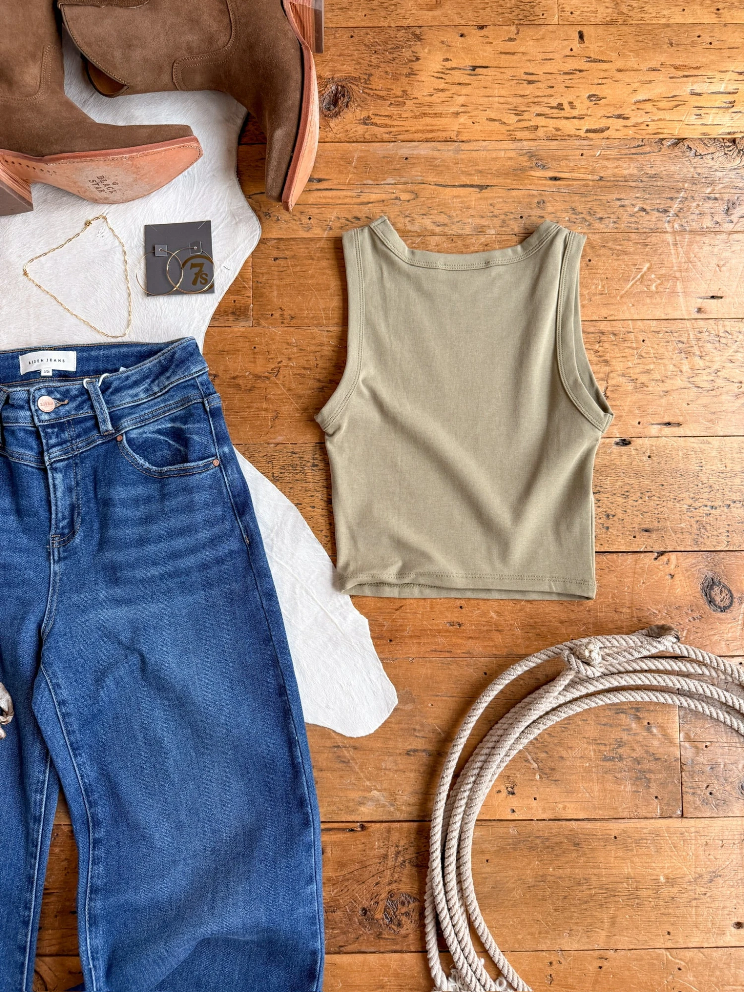 - Hits at the true waist; shows no skin when worn with high rise denim.