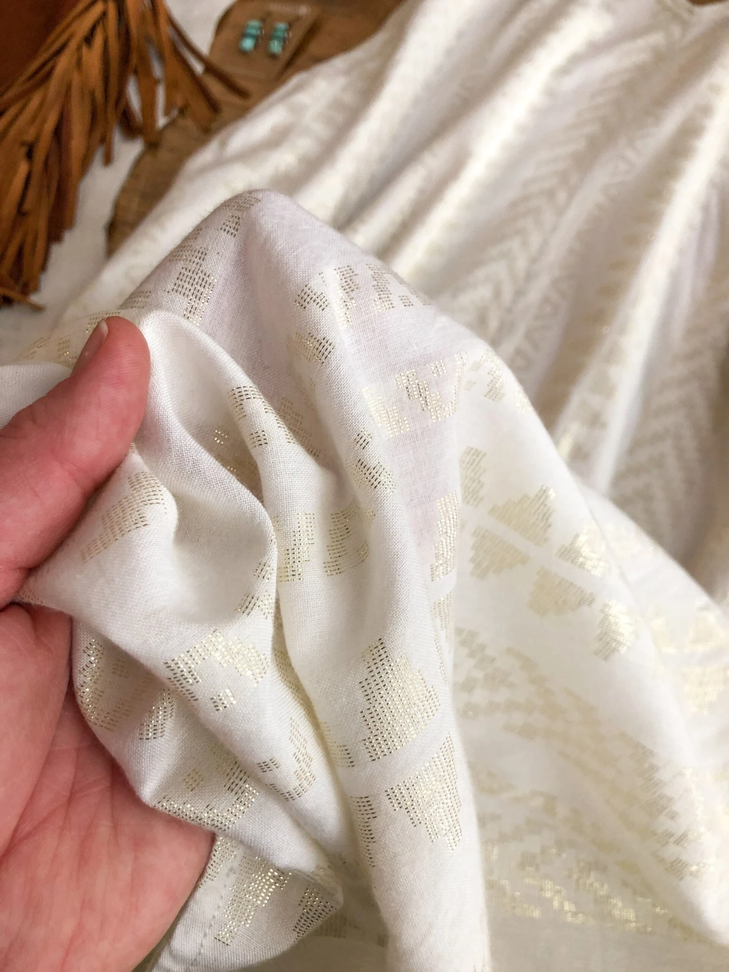 - Gold metallic print woven throughout.