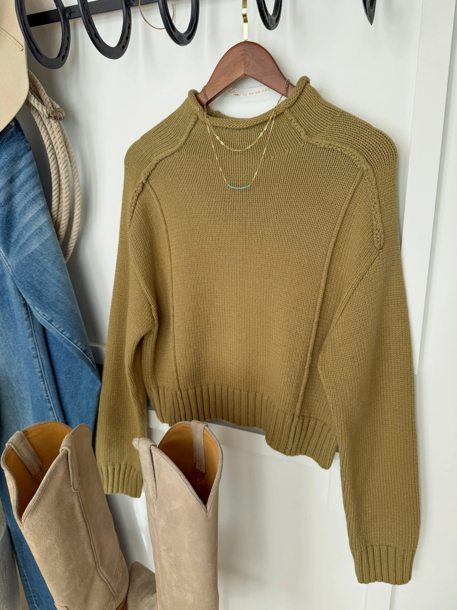 - Exposed cable knit seams.