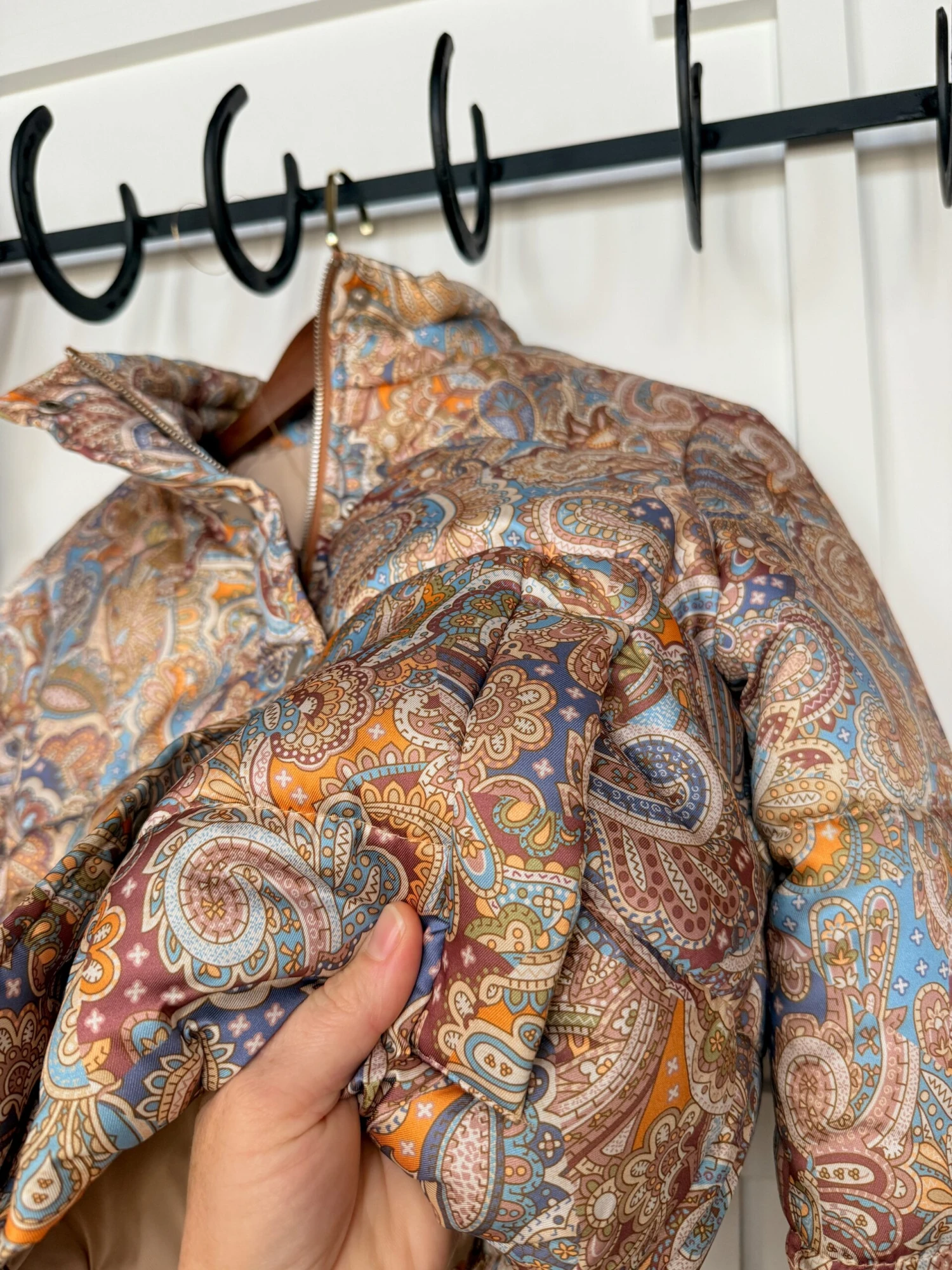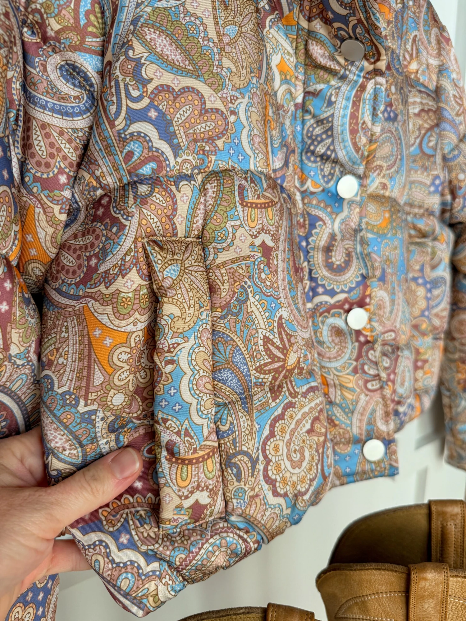 - Paisley satin full zip crop puffer jacket.