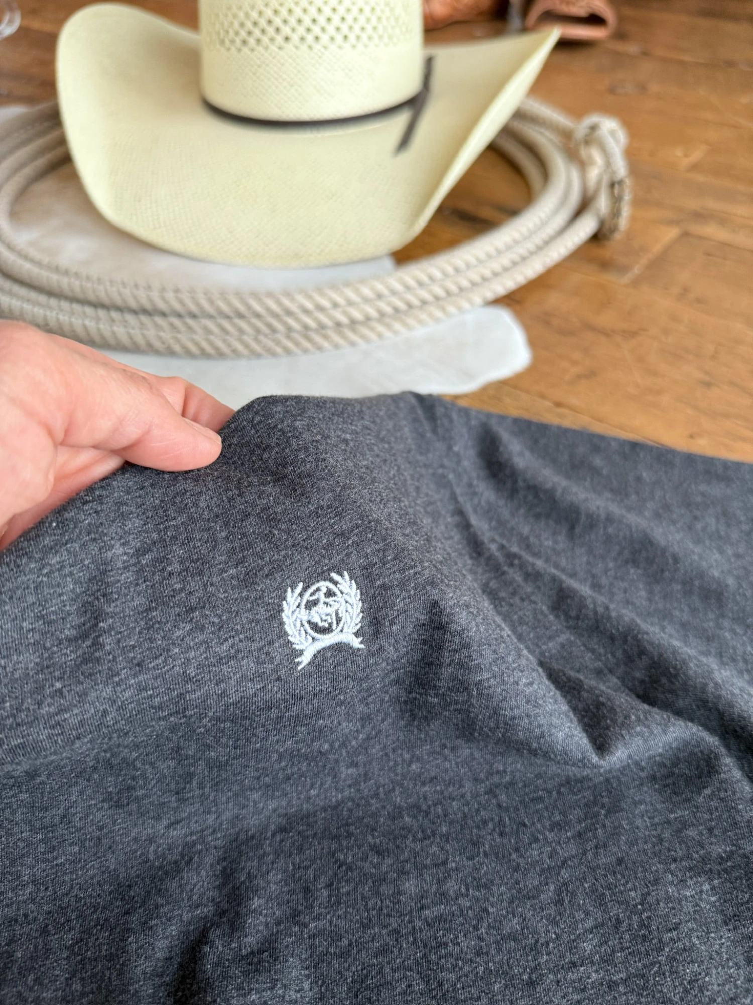 - Charcoal men’s Cinch logo tee.