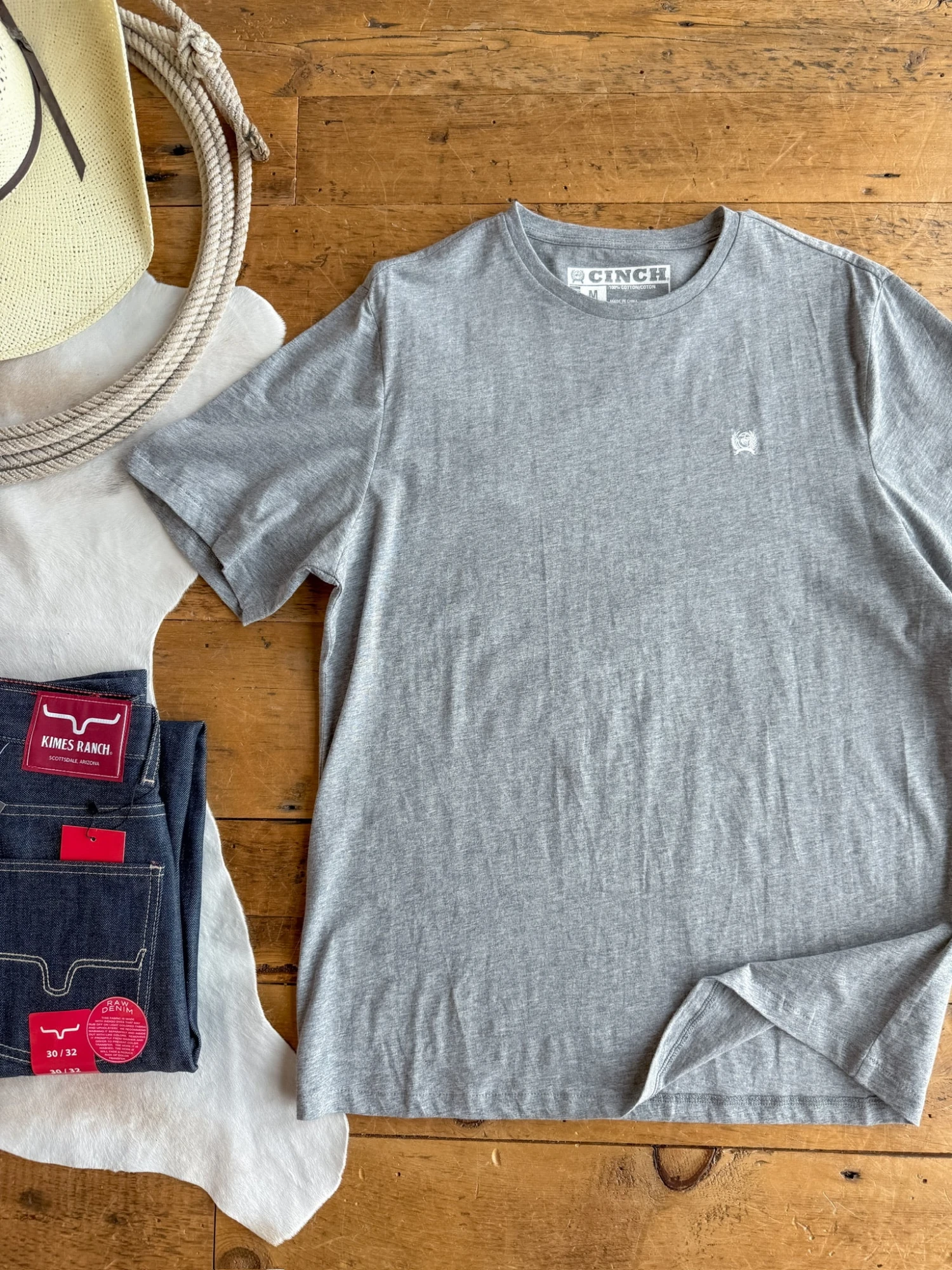 - Light heather grey men’s Cinch logo tee.