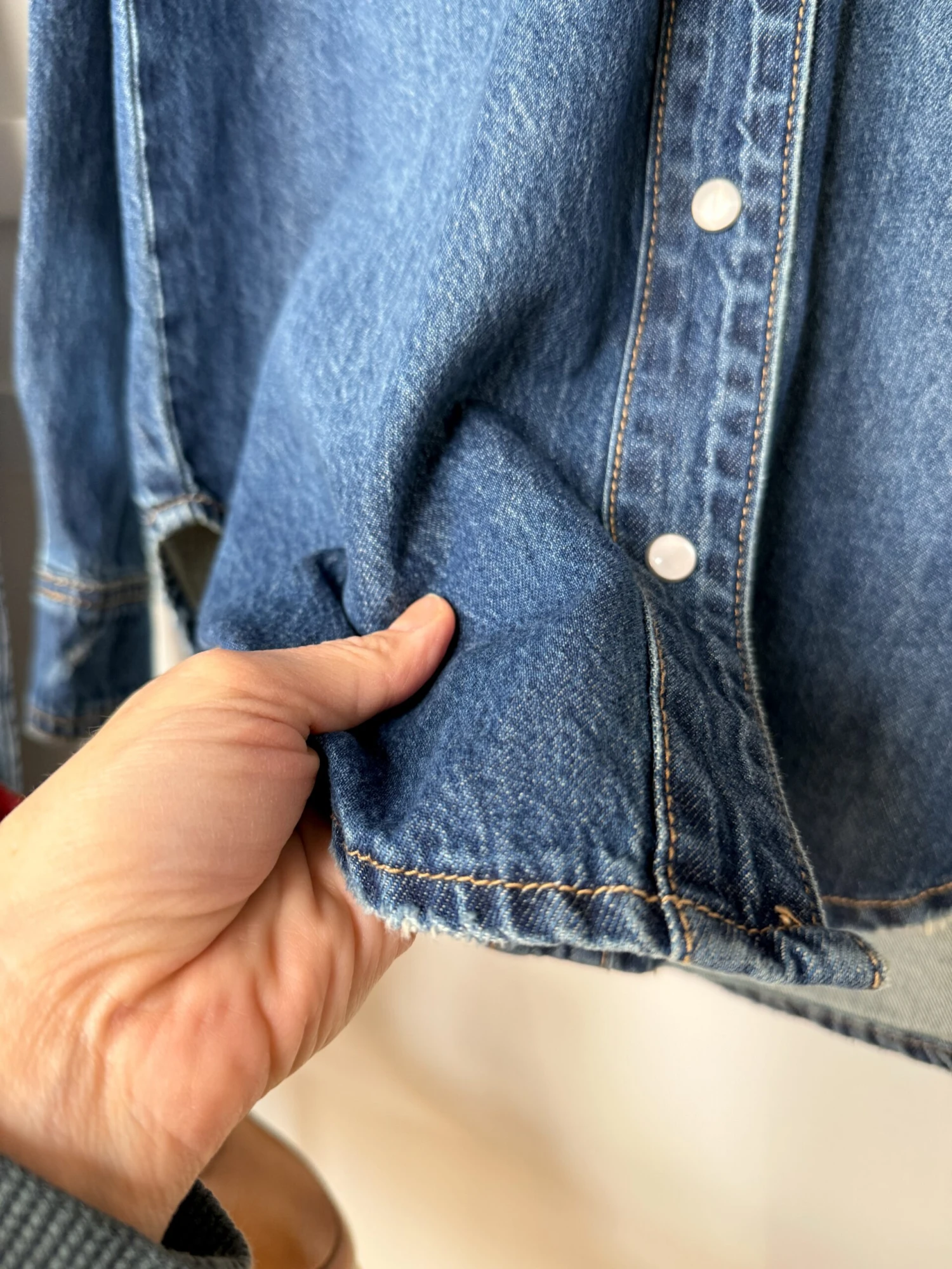- Medium dark wash denim long sleeve pearl snap top.