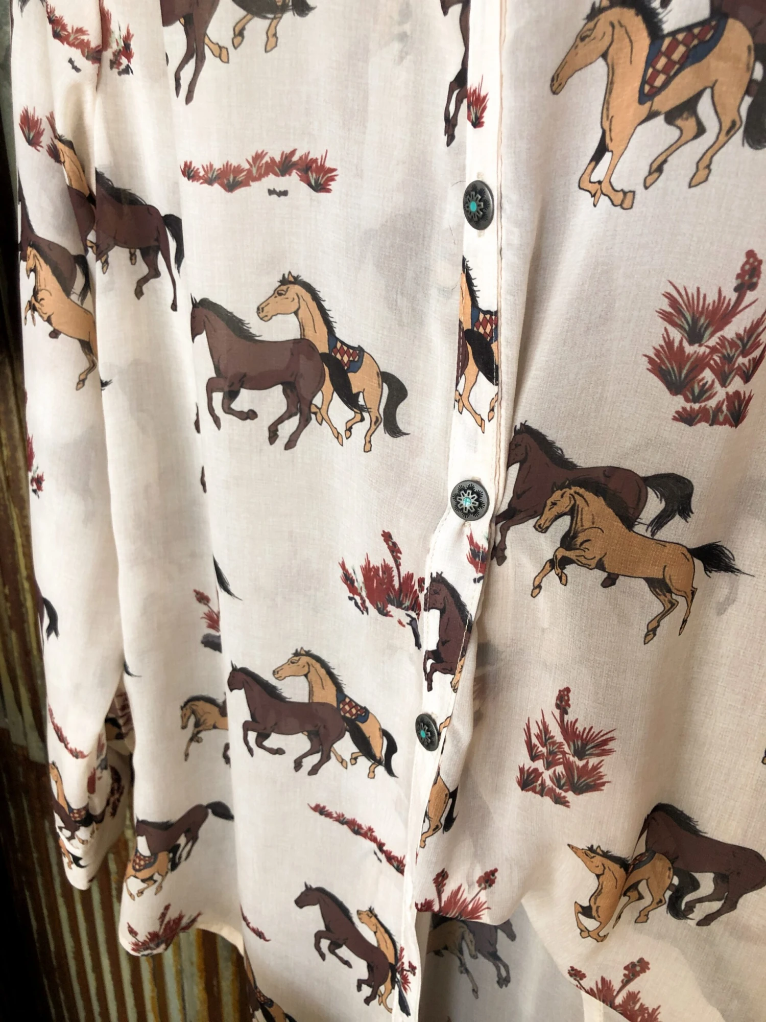 - Horse and prairie brush print throughout.