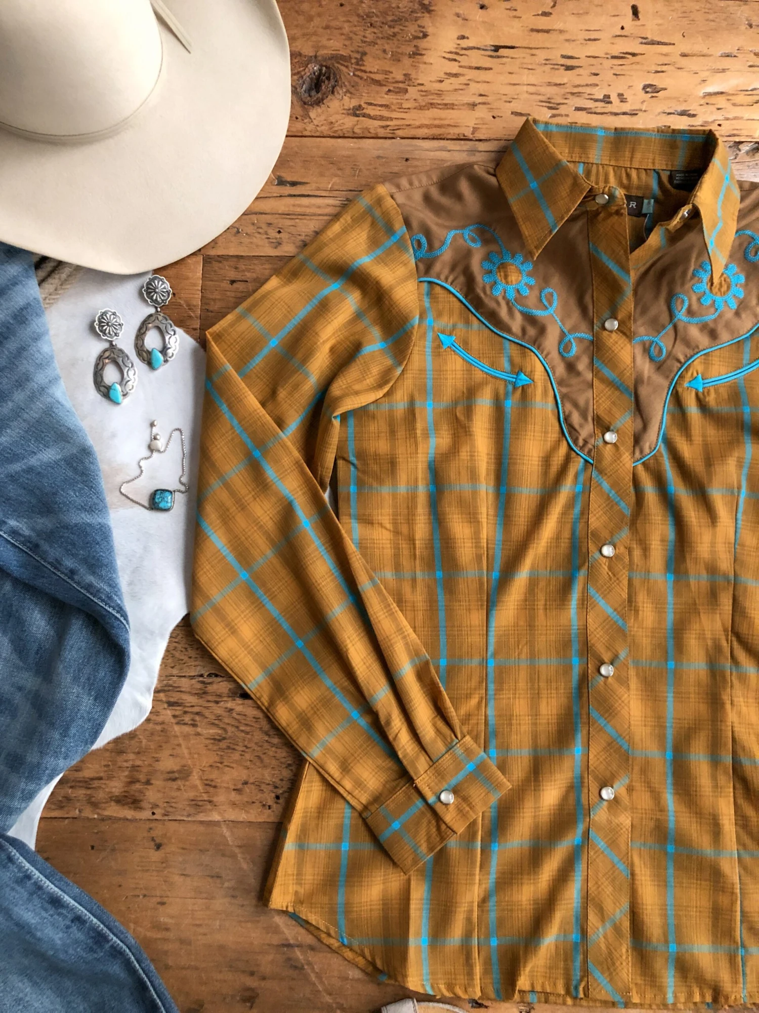 - Saddle tan yoke with turquoise pipe trim and embroidery.