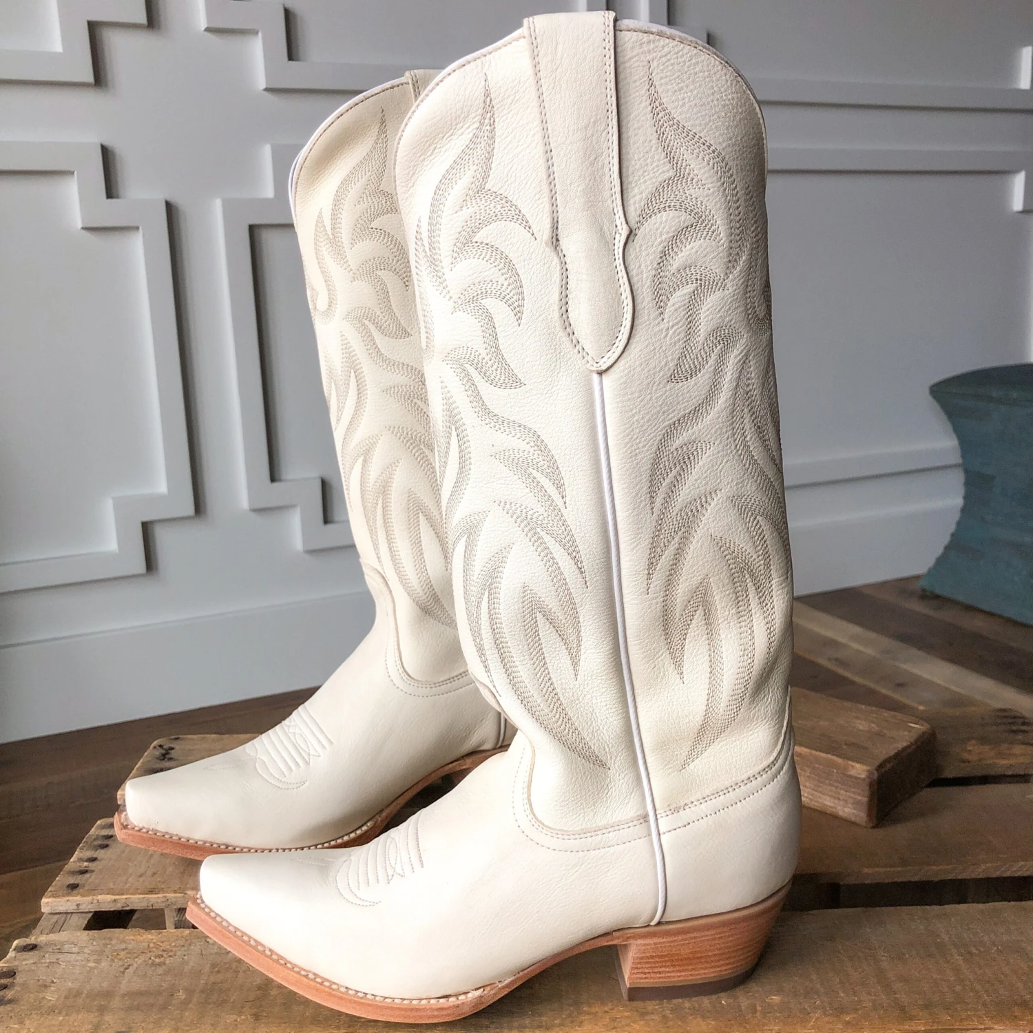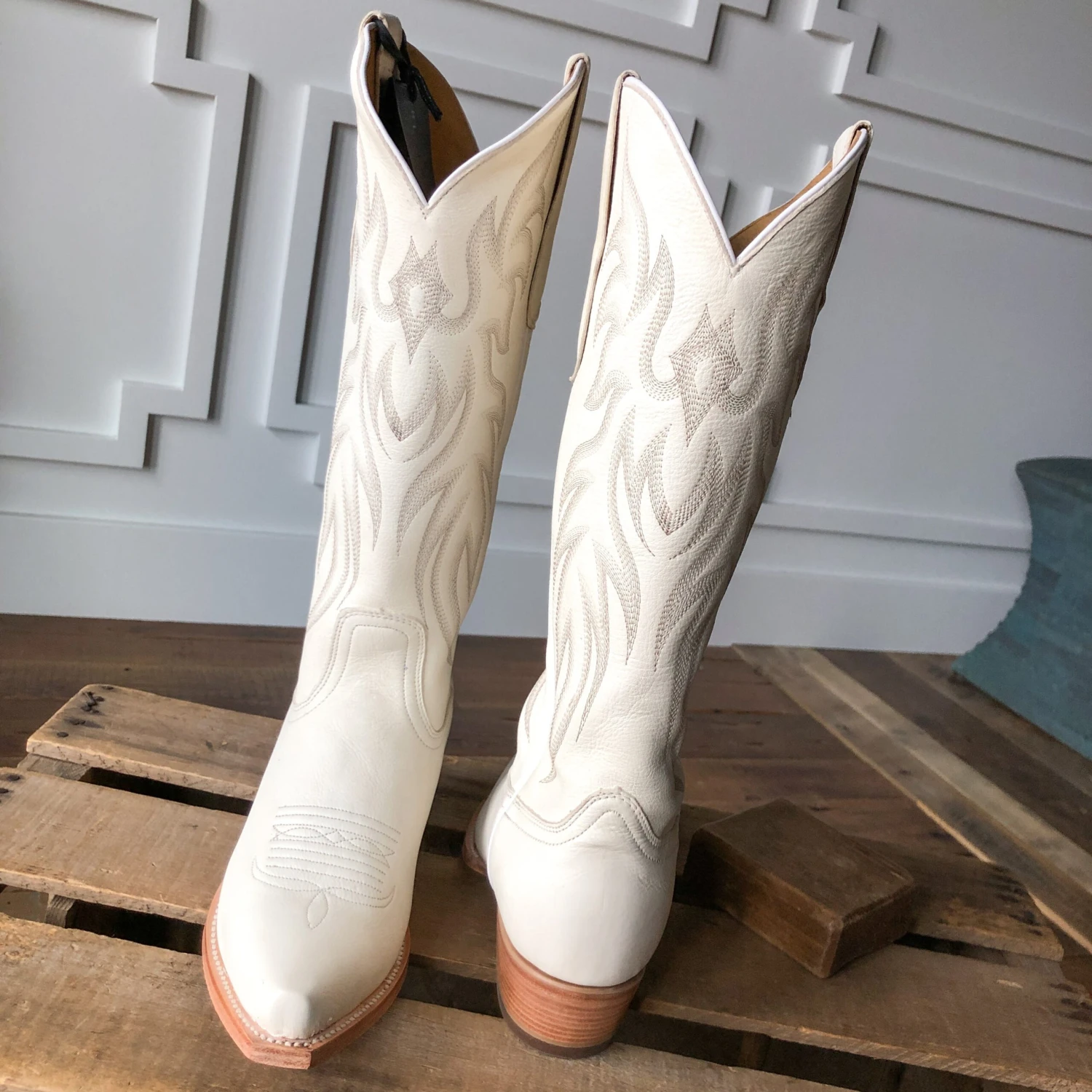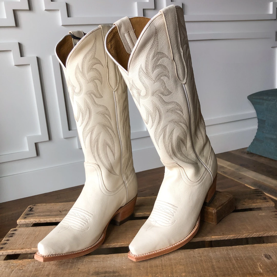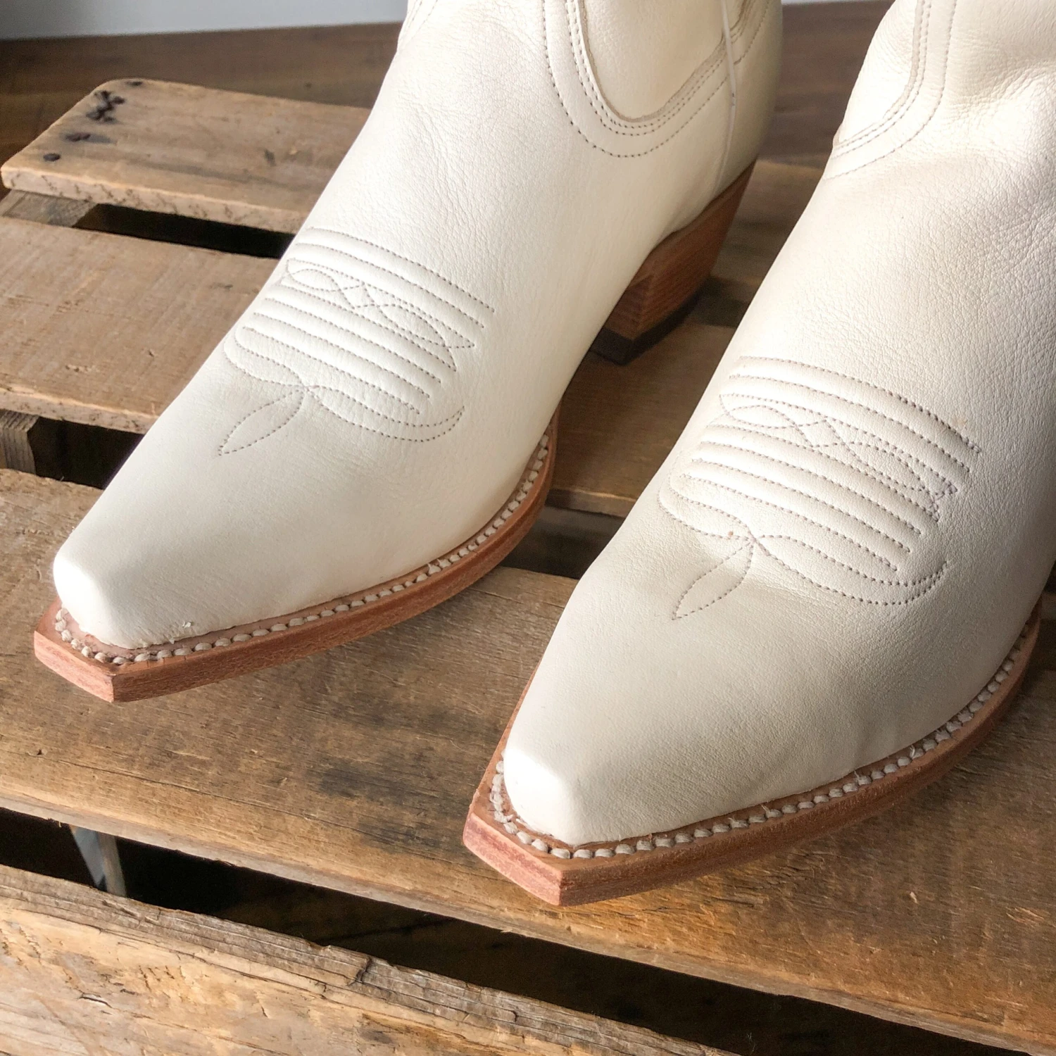 - Off-white leather snip toe boot.