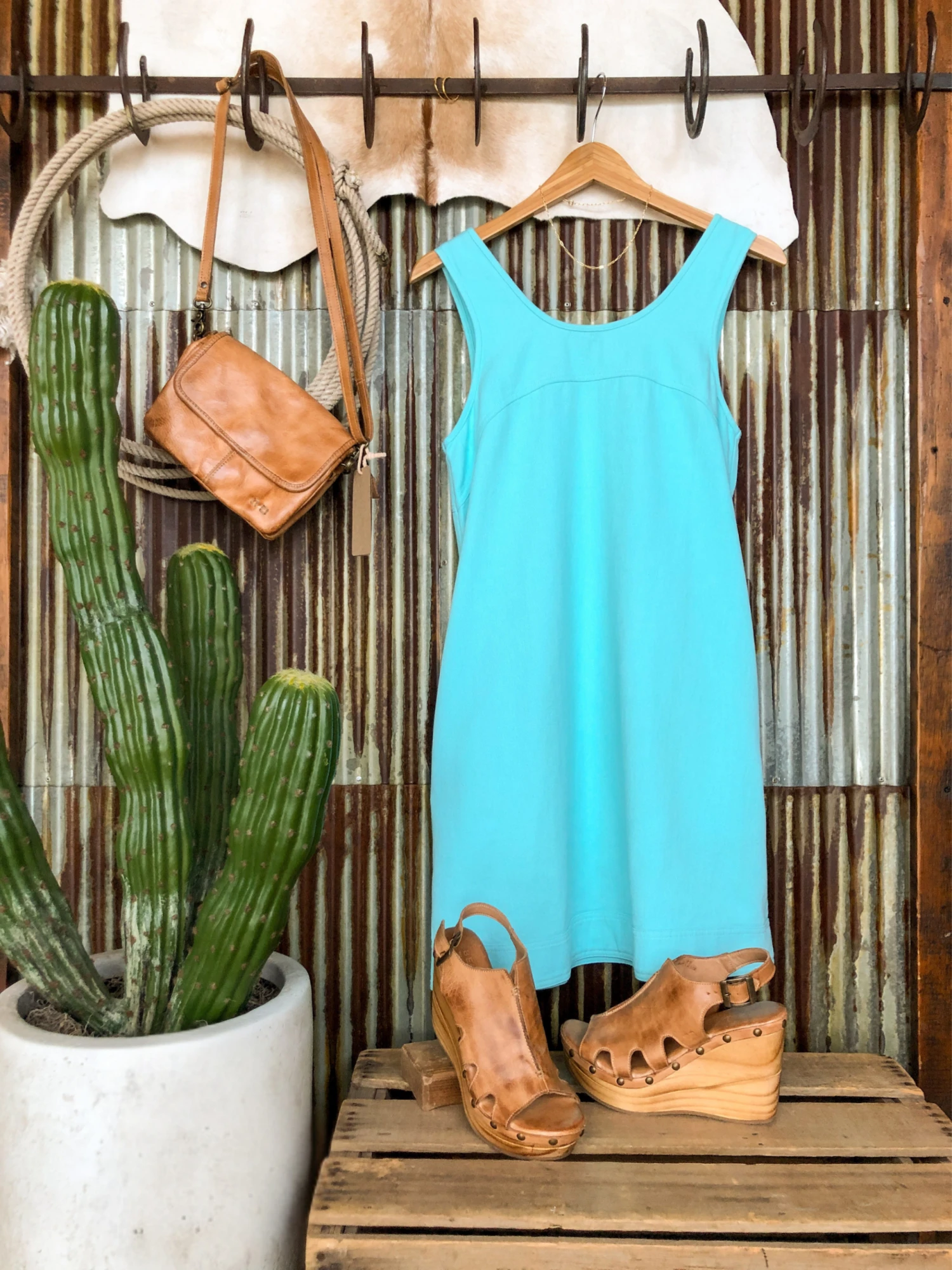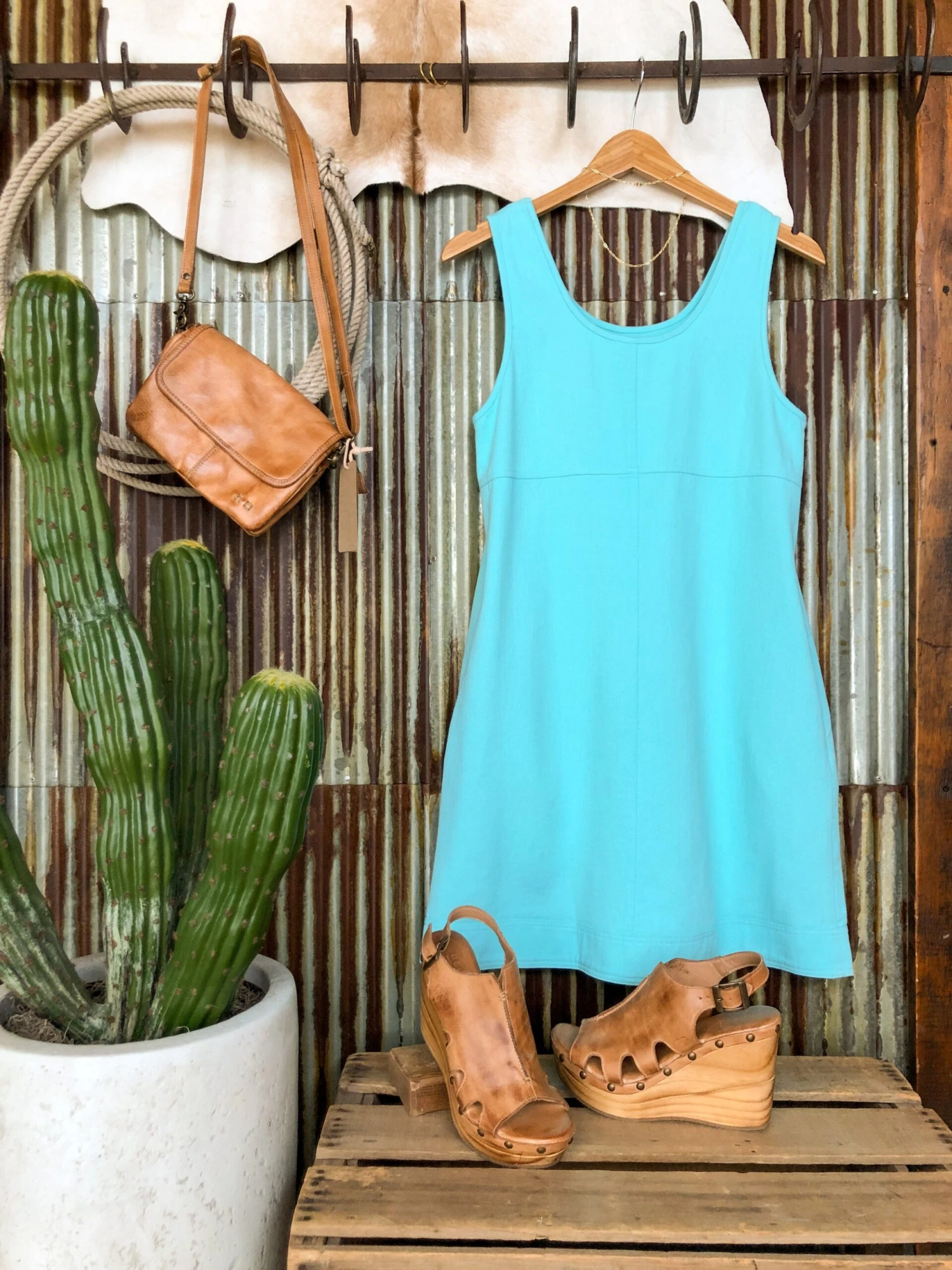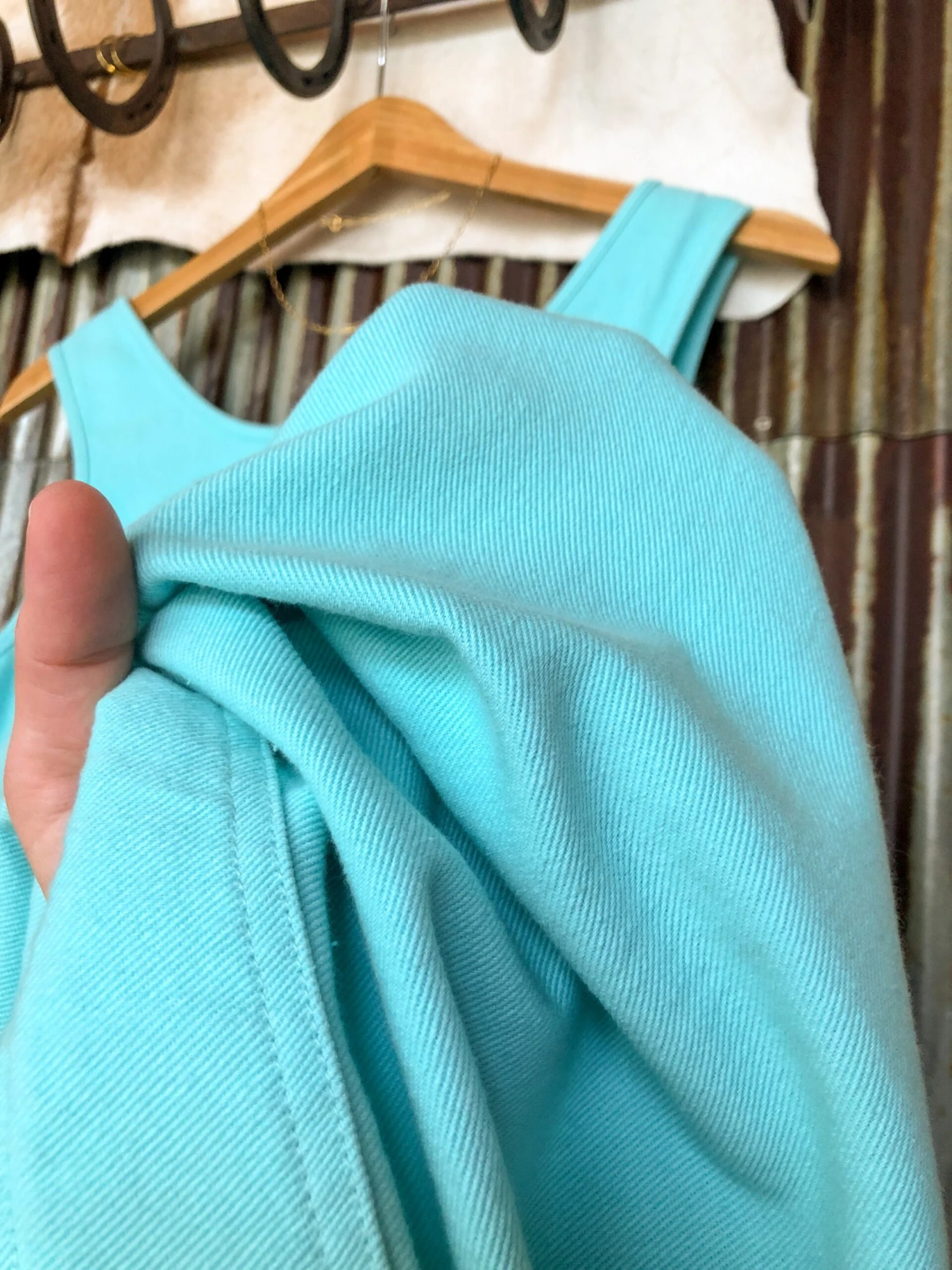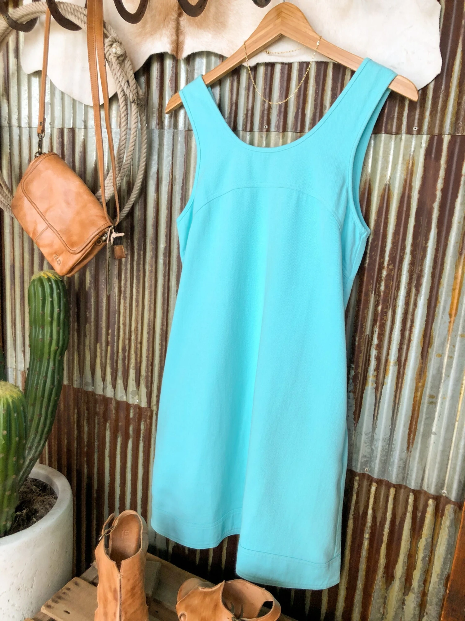 - Light turquoise denim sleeveless dress.
