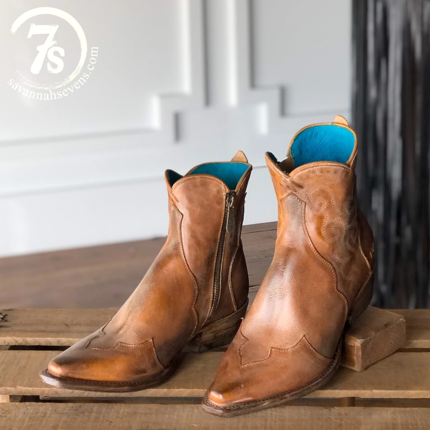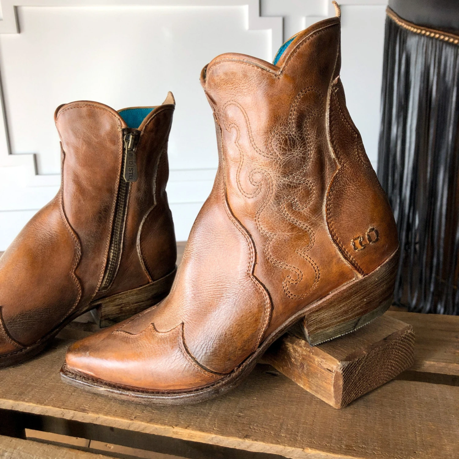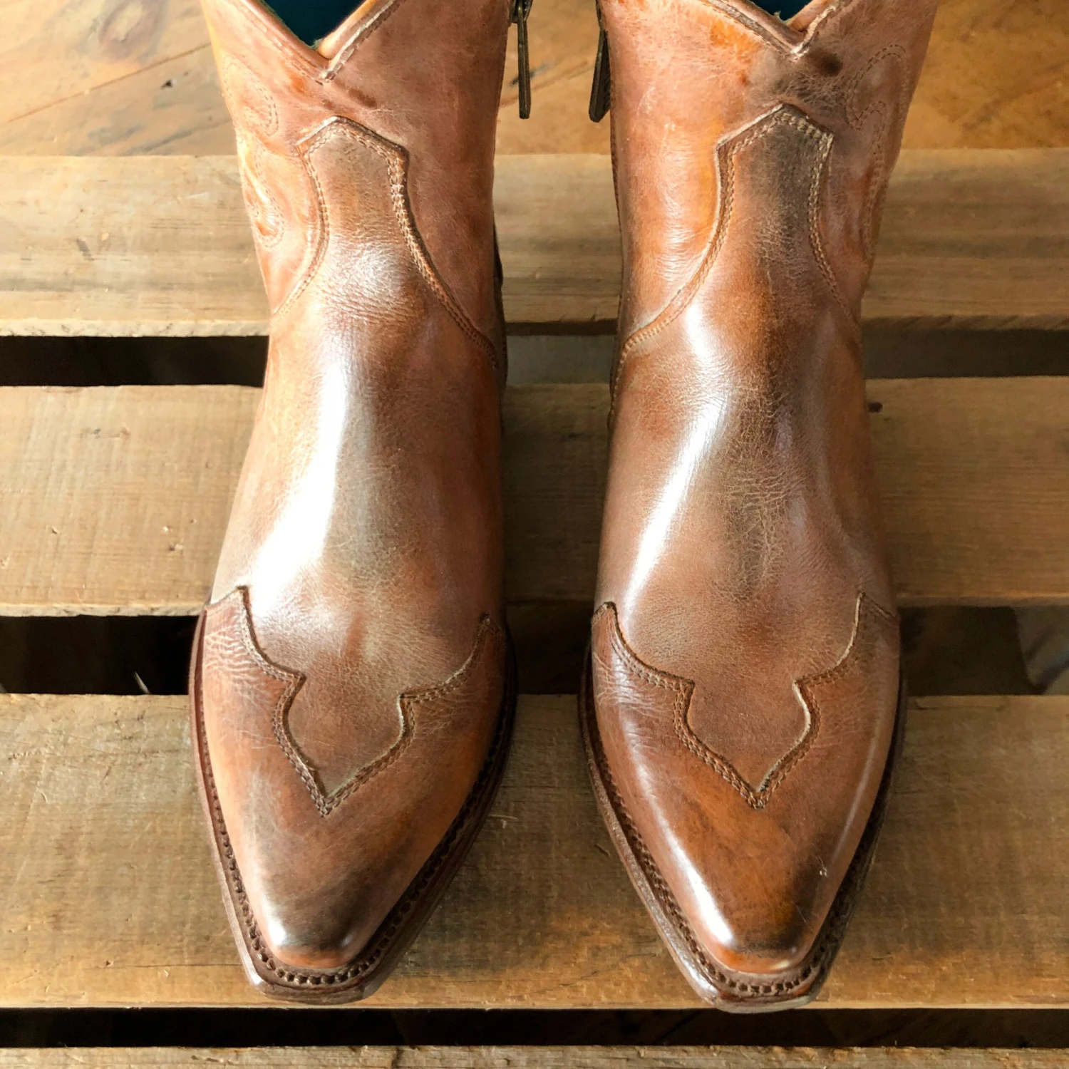 - Gorgeous distressed leather snip toe bootie.