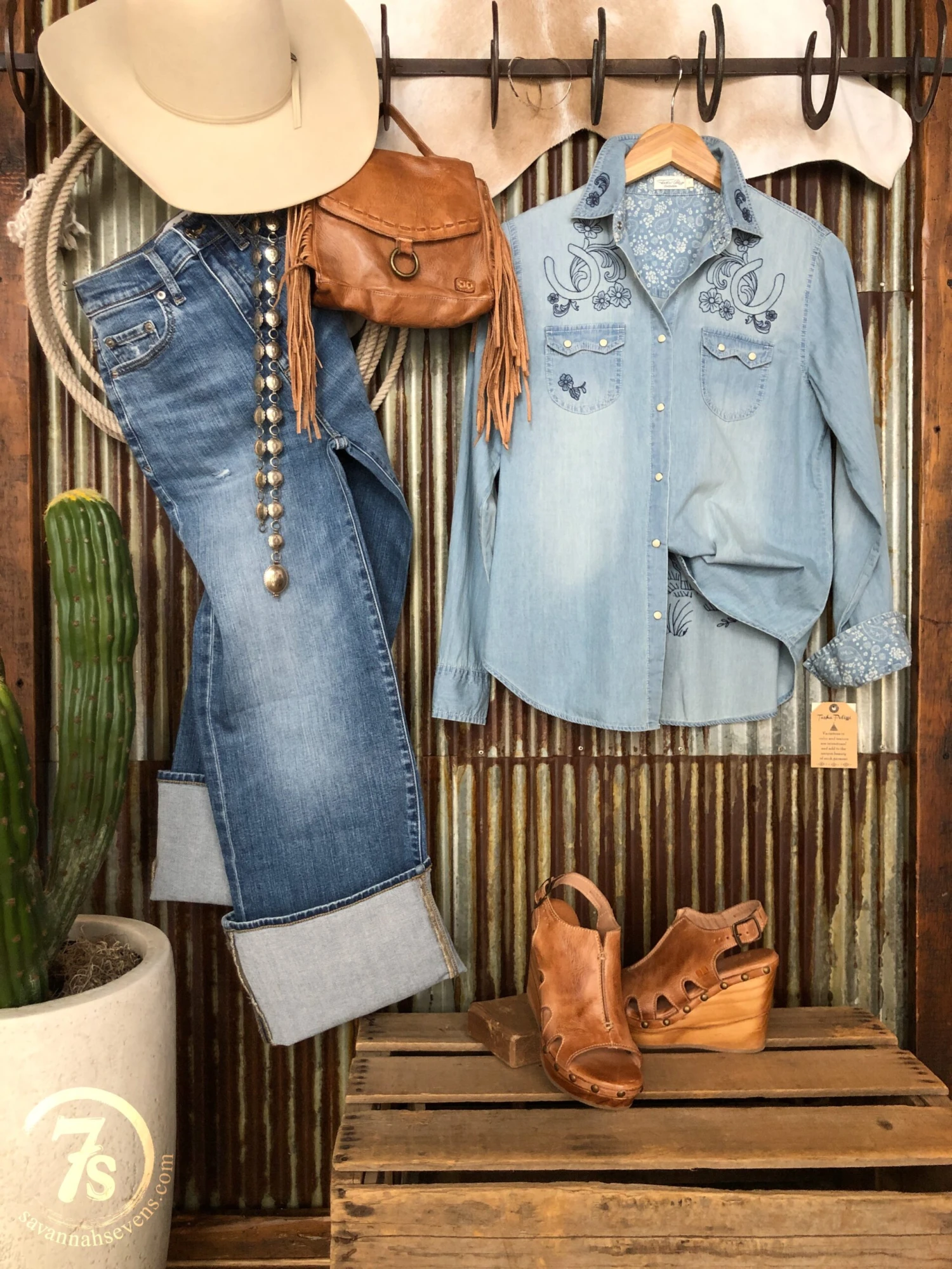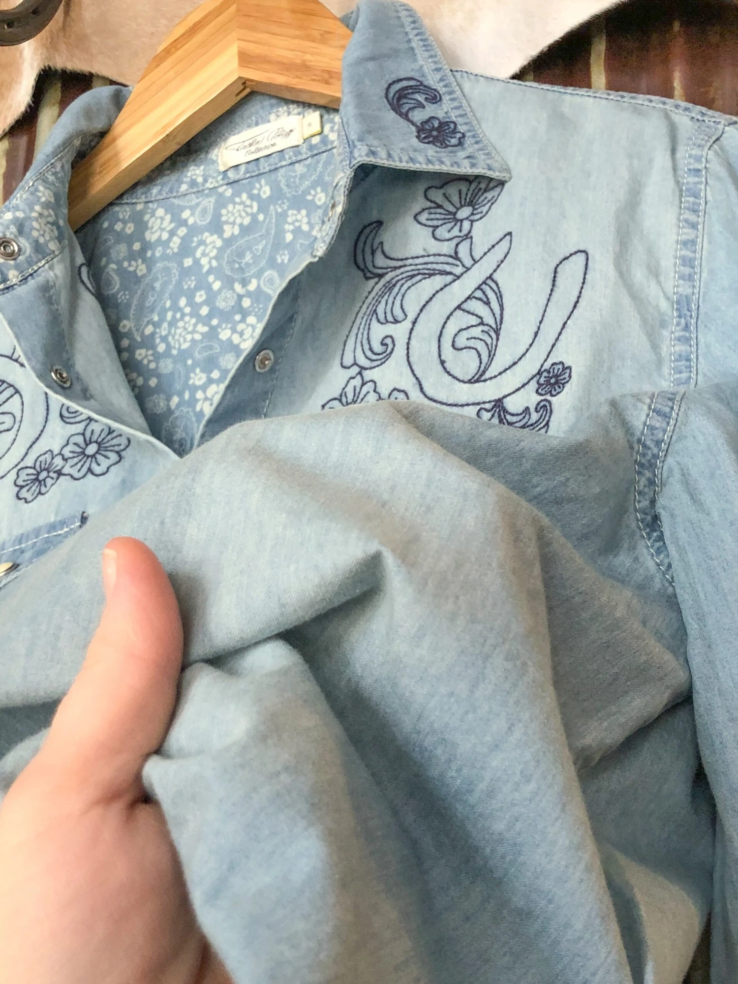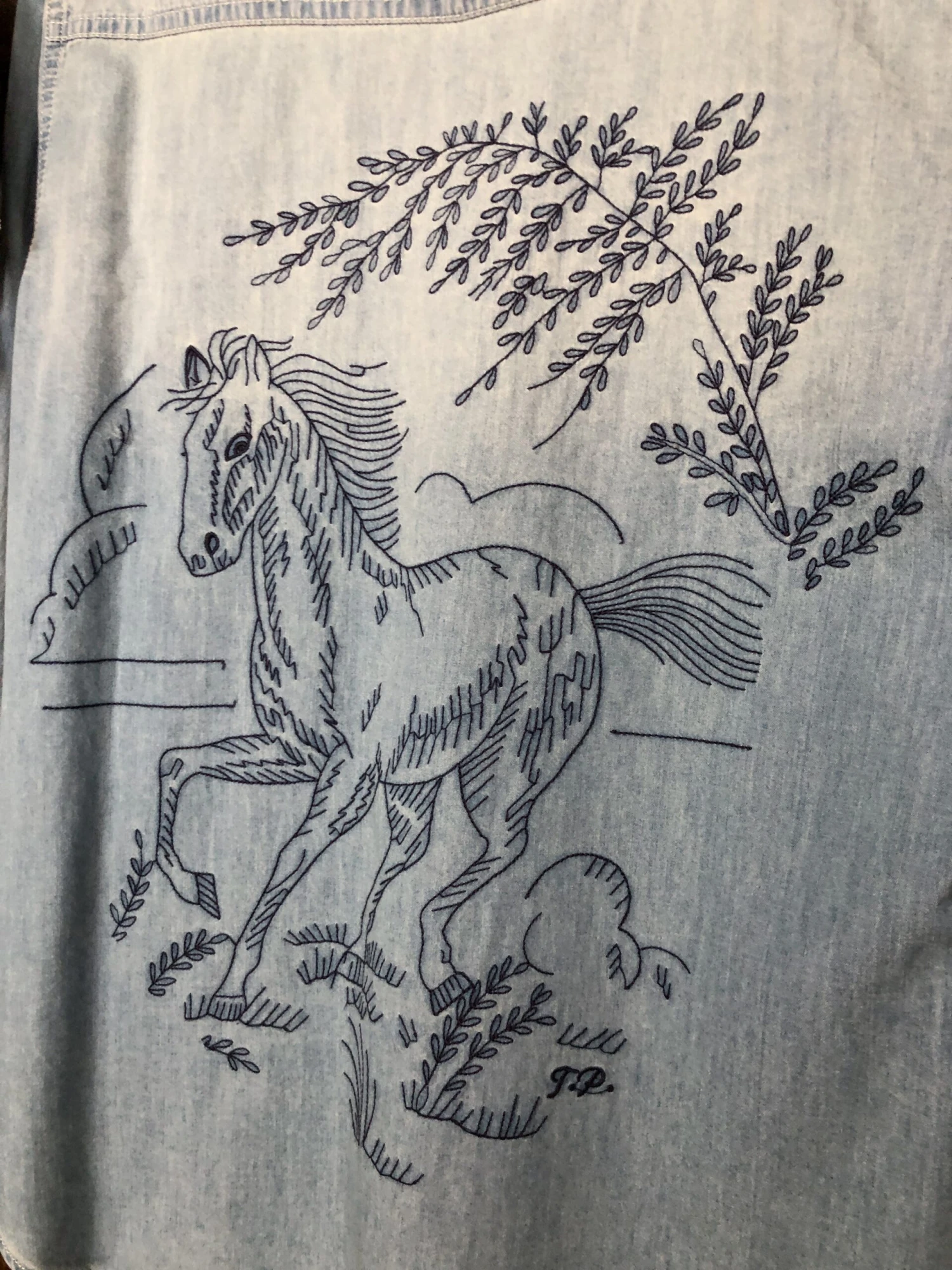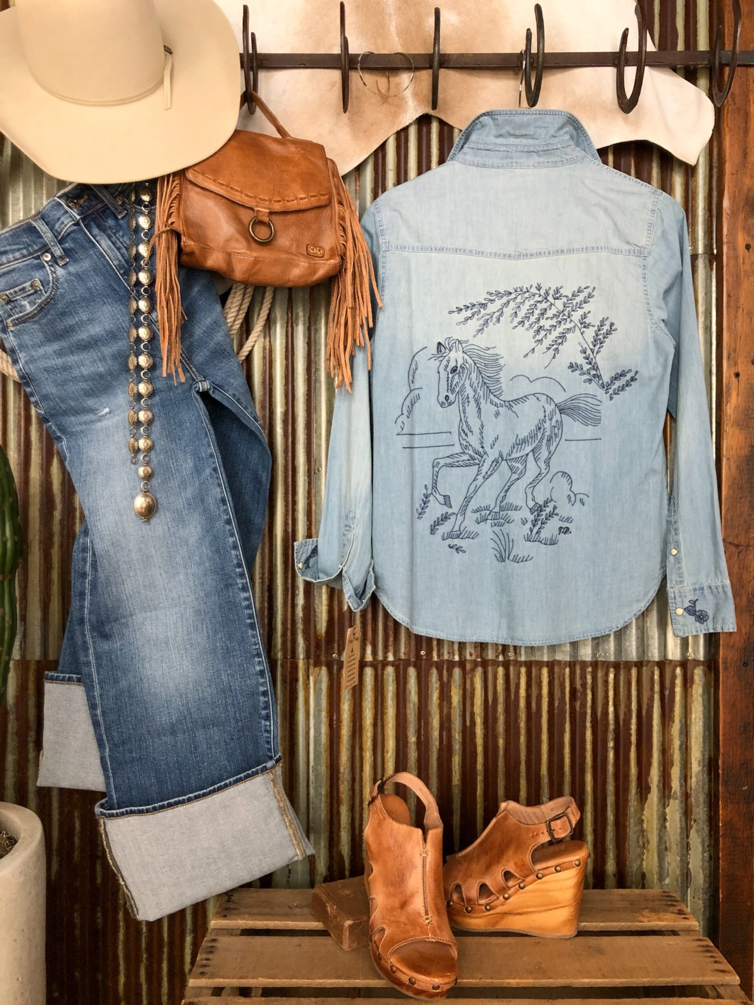 - Intricate western floral and horseshoe embroidery on the front, large wild horse embroidered scene on the back.