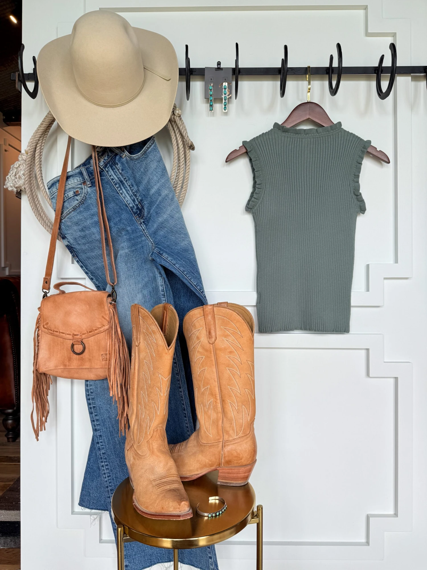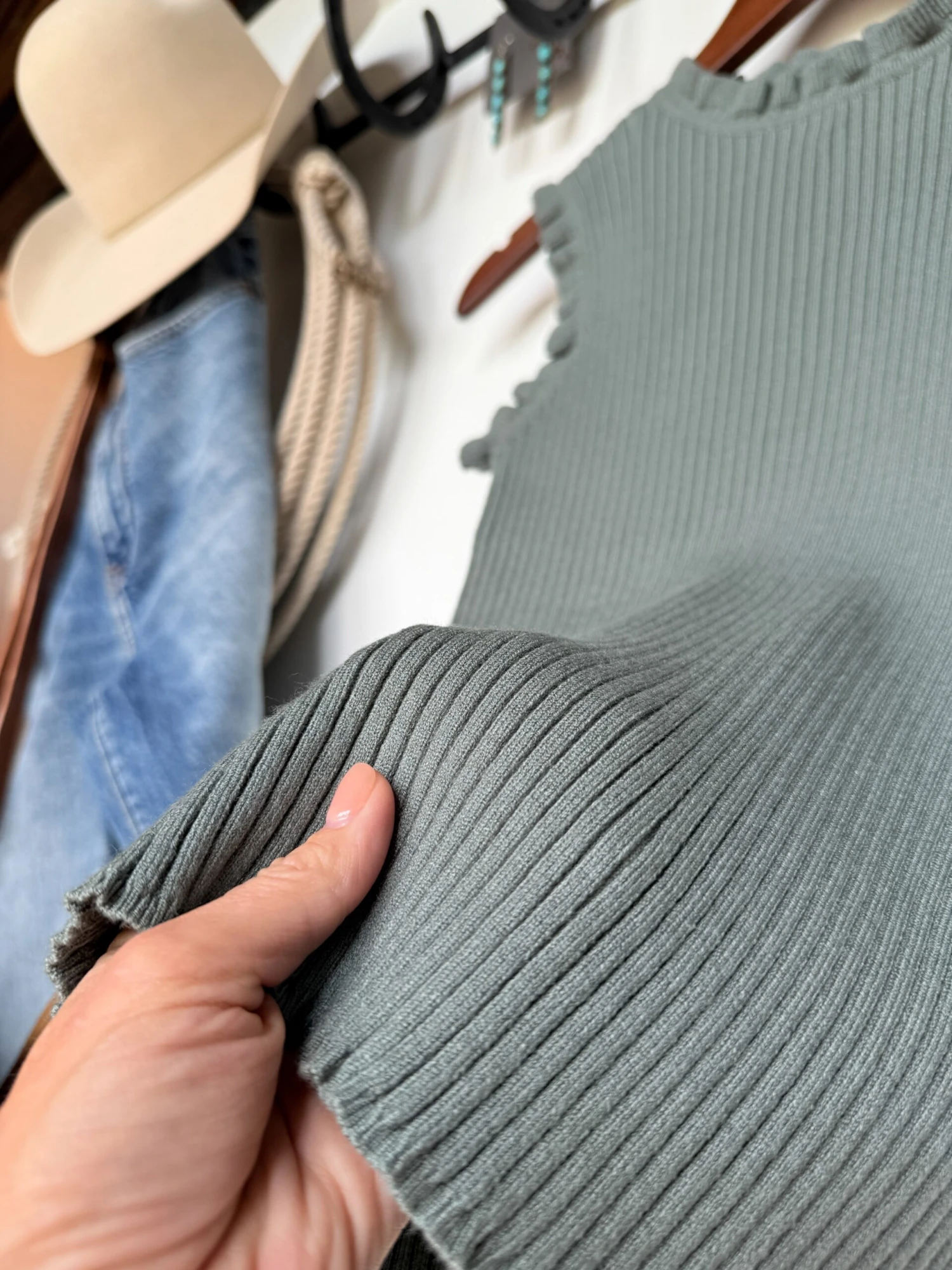 - Sage sleeveless knit ruffle top.