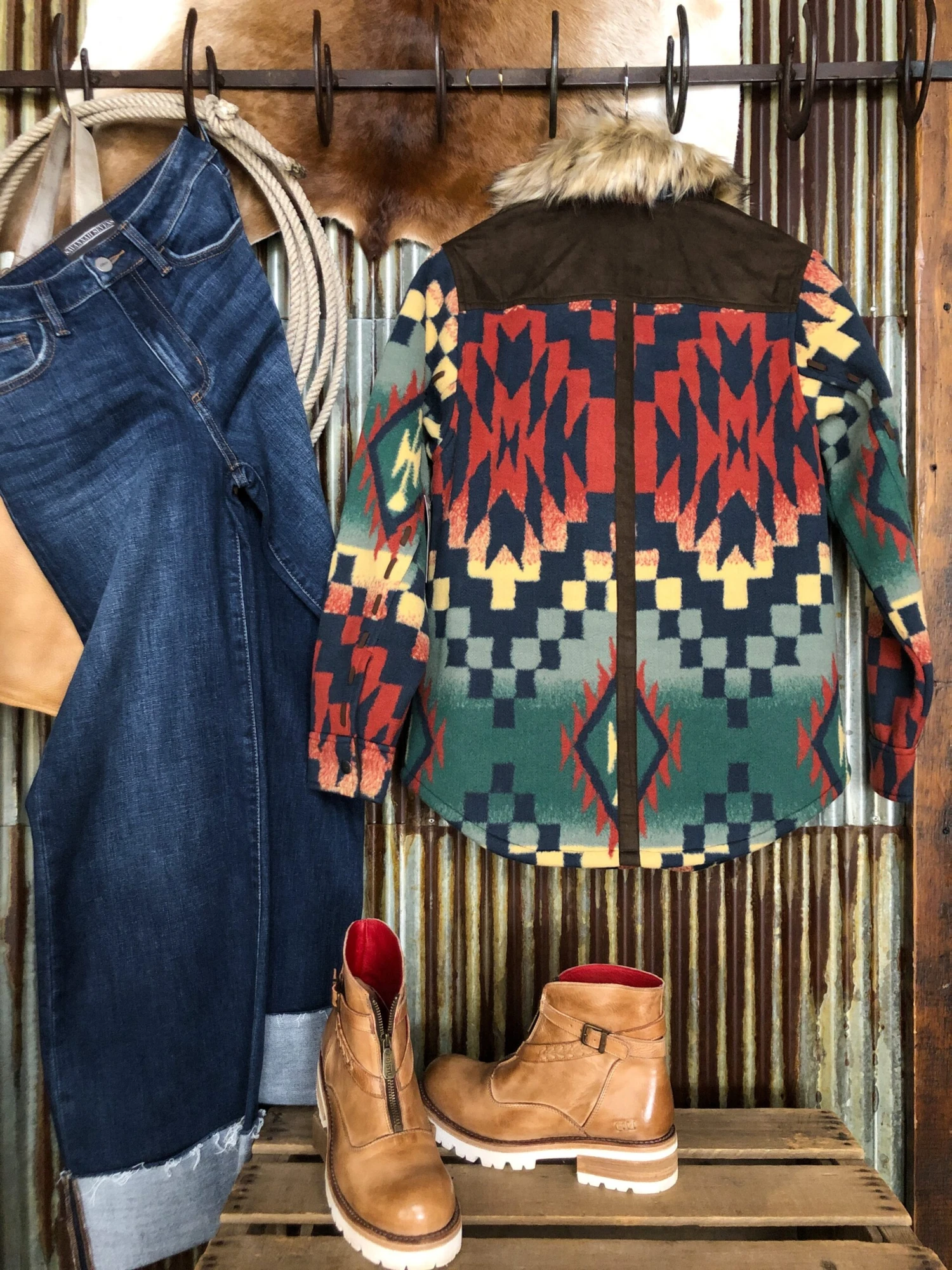 - Gorgeous midnight navy, sage, blonde, and brick southwest pattern.