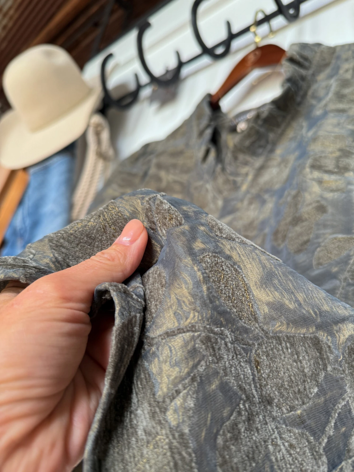 - Grey sage with a moss floral textured soft sheen pattern throughout.