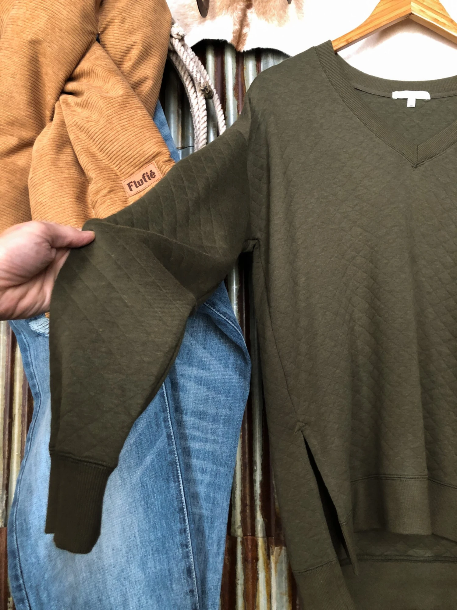 - Olive quilted weekender top.