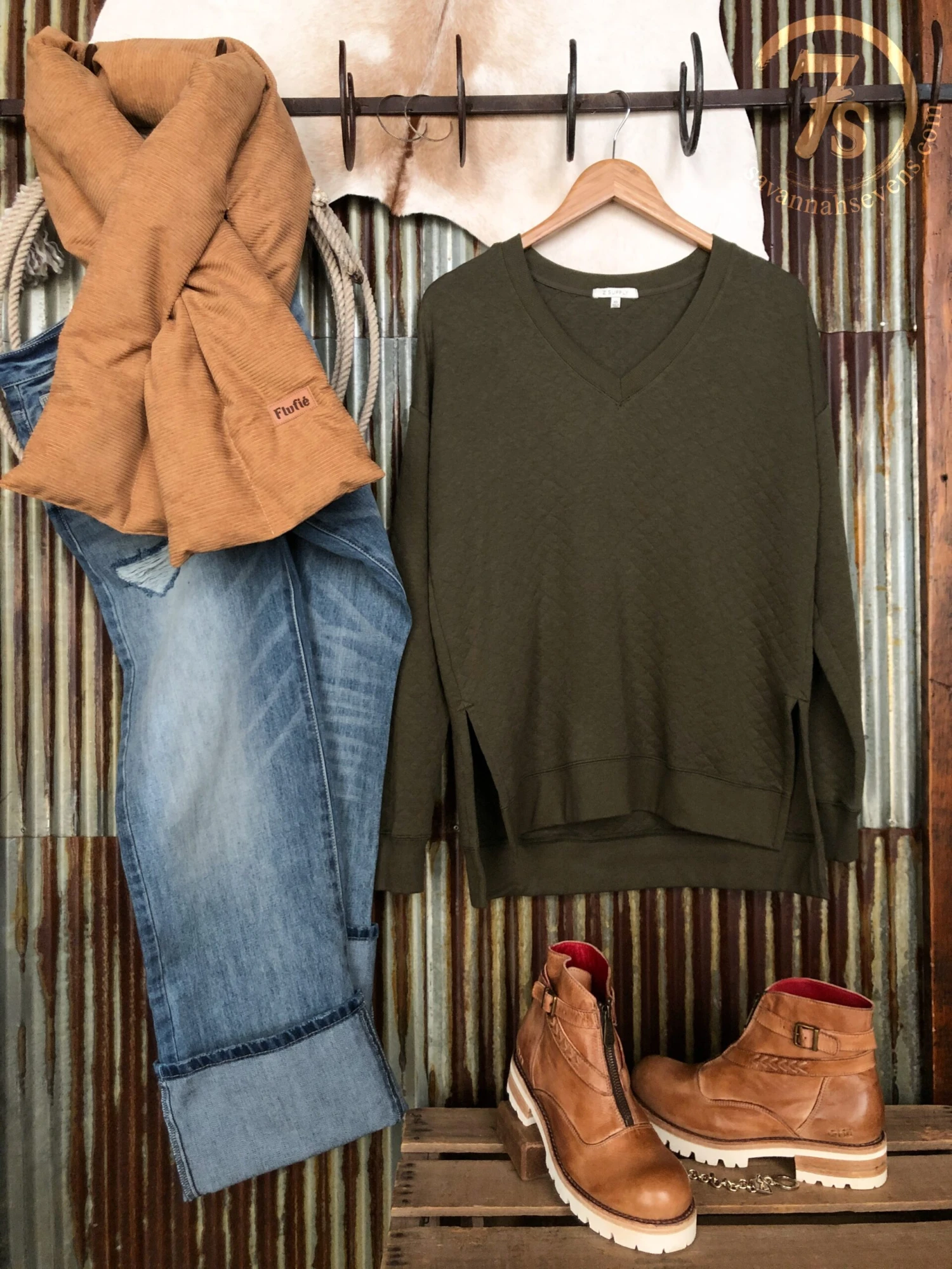 - Shown styled with The Trace High Rise 90’s Wide Leg Jean, The Larue booties, Hiram Scarf {Tan Cord}, Boca Raton Bracelet, and Montrose Earrings.