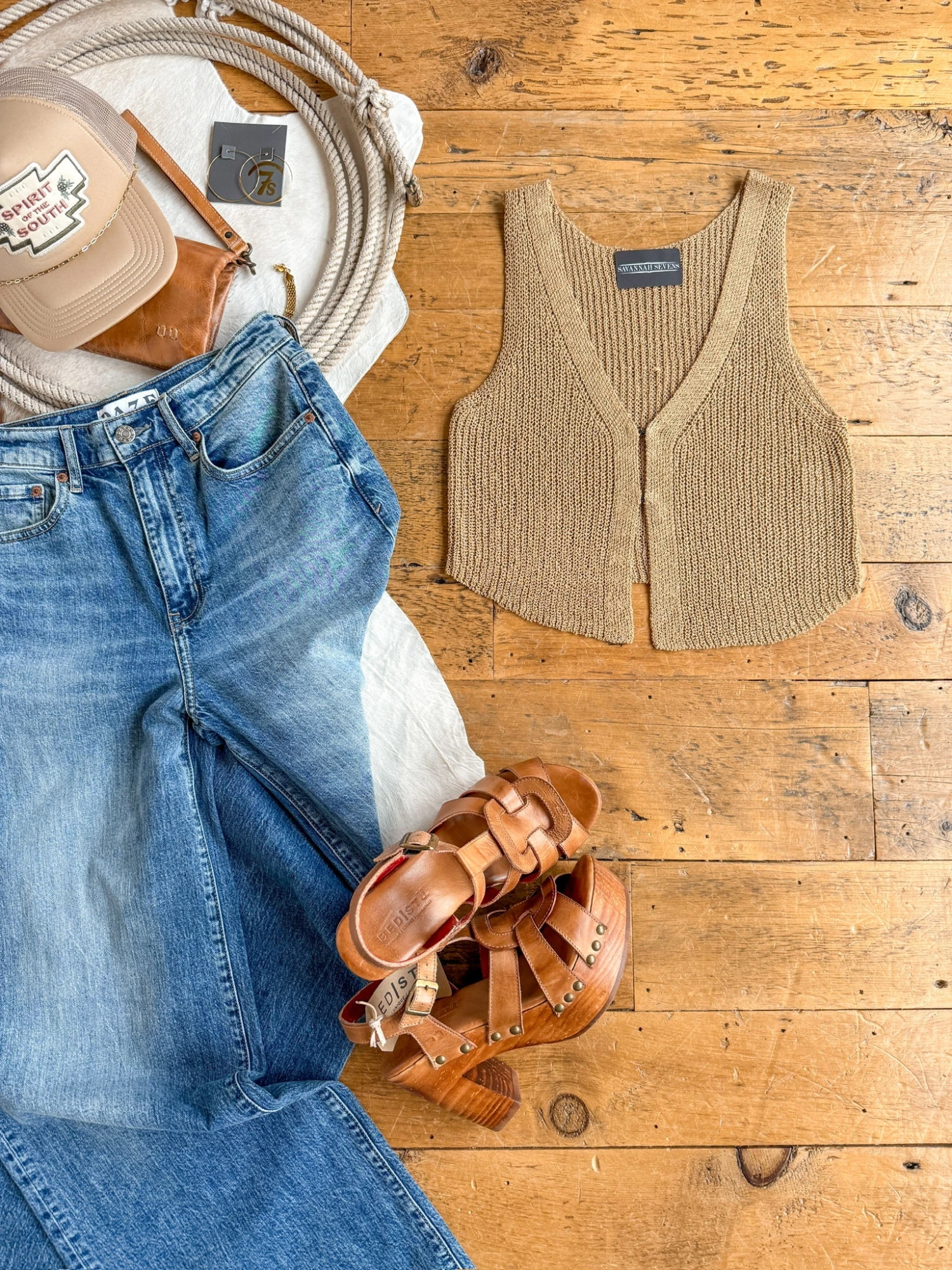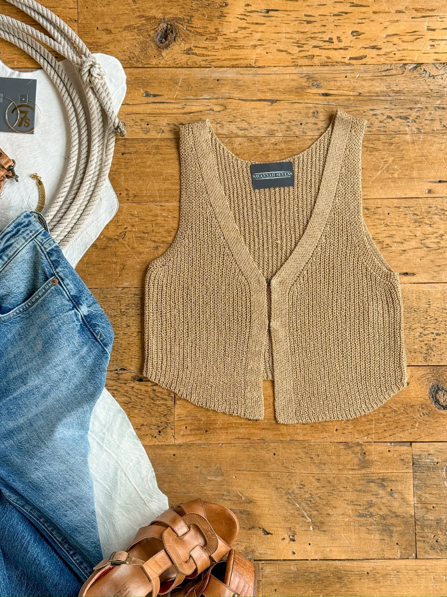 - Tan open knit vest top.