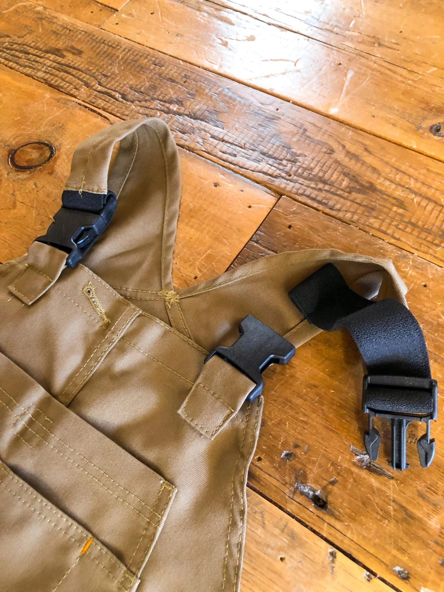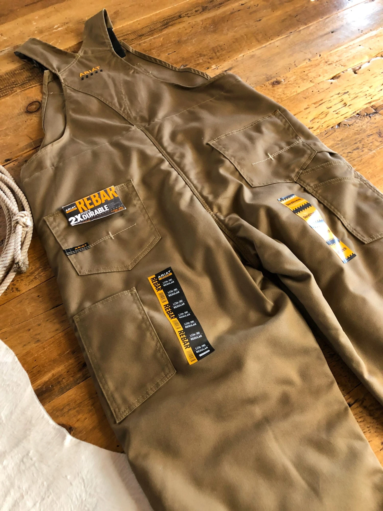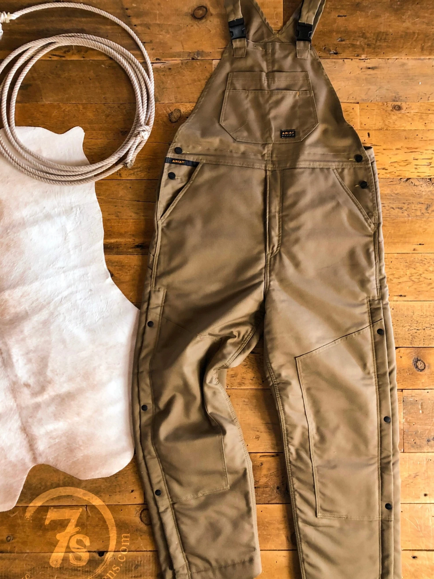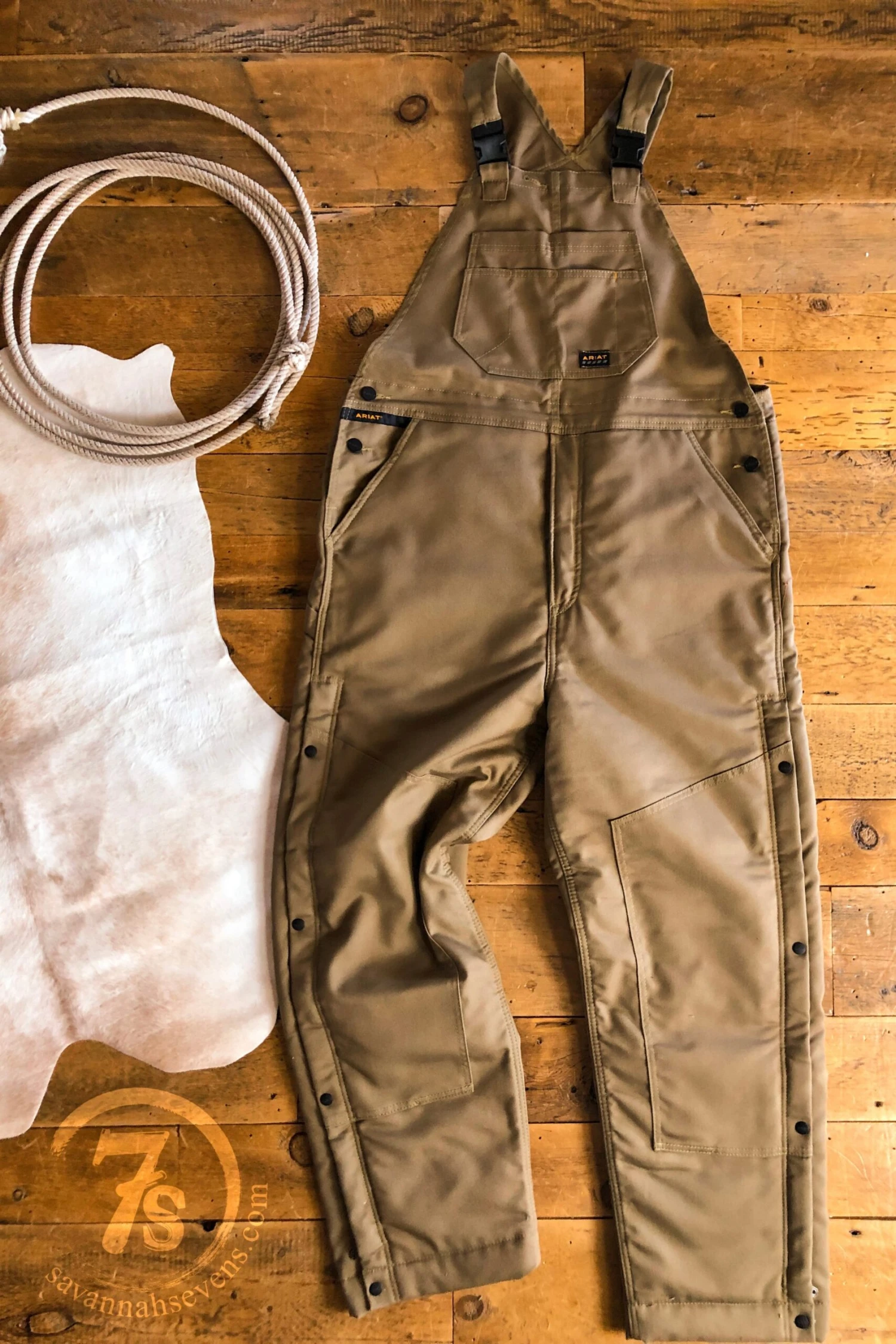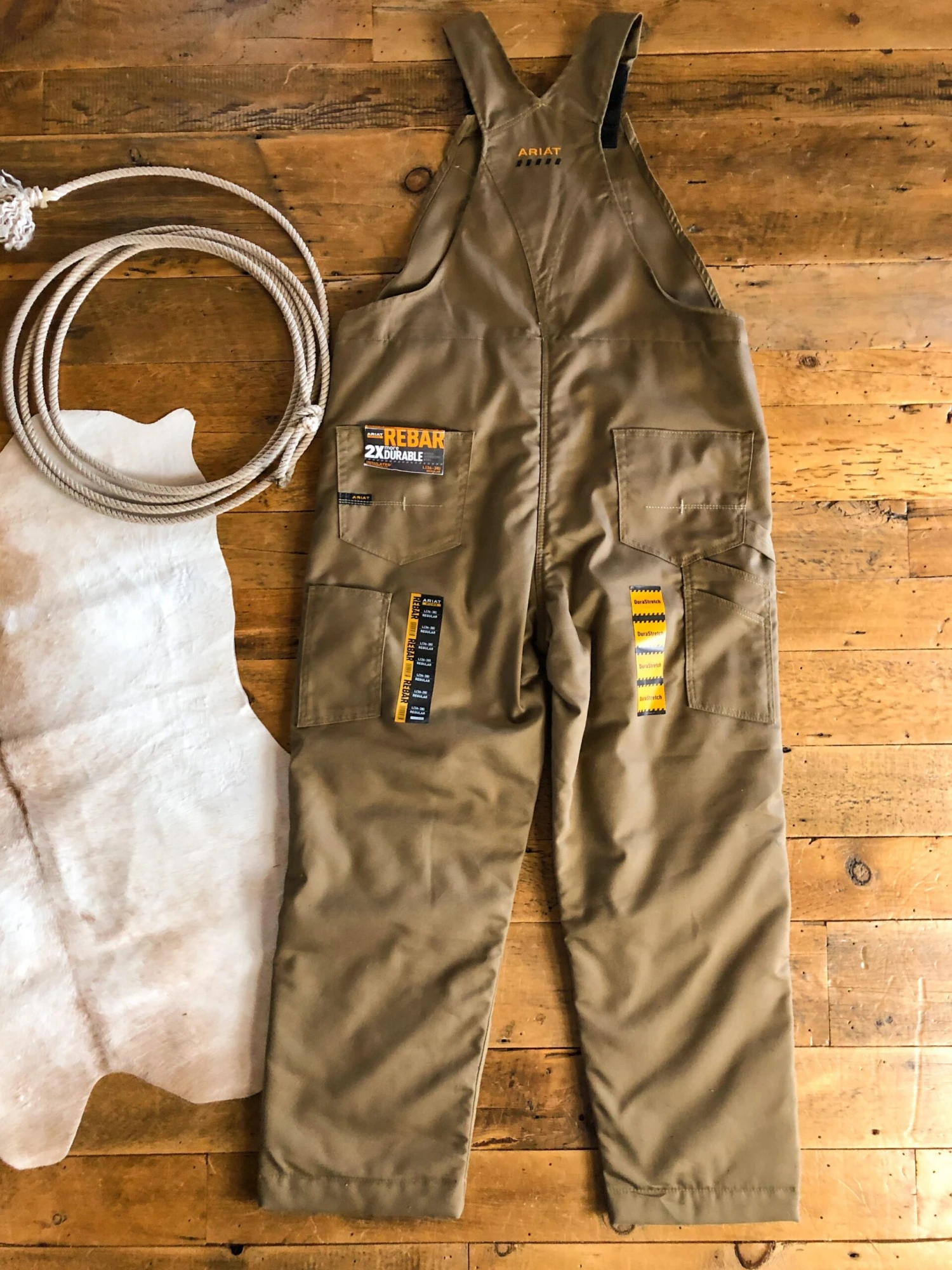 - Natural tan Ariat Rebar insulated men’s bib overalls.