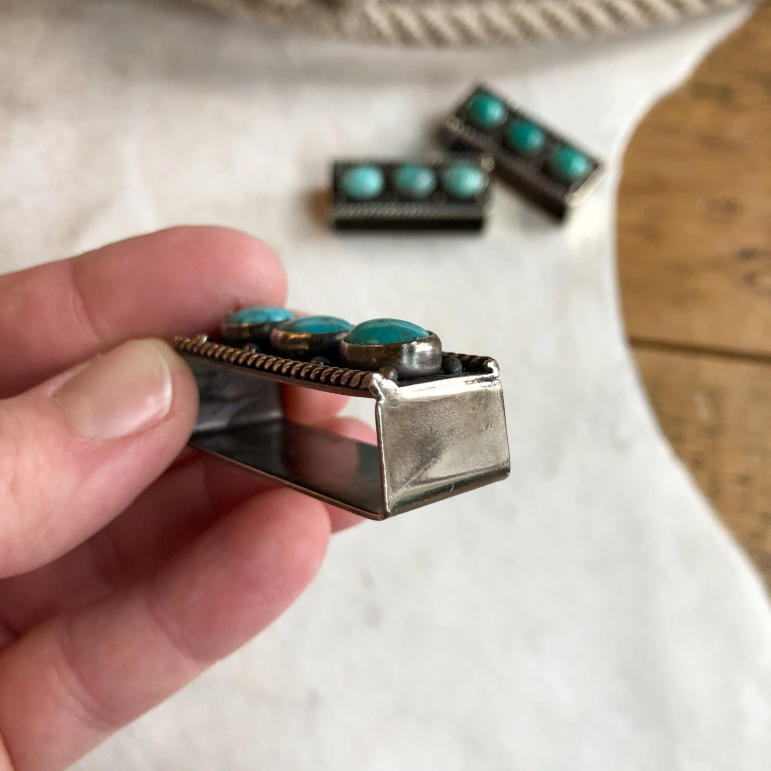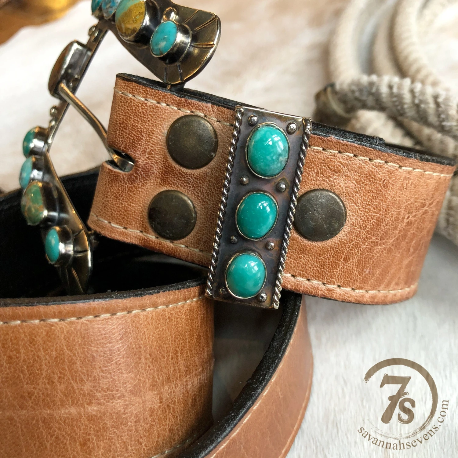 - Turquoise and German silver belt keeper.