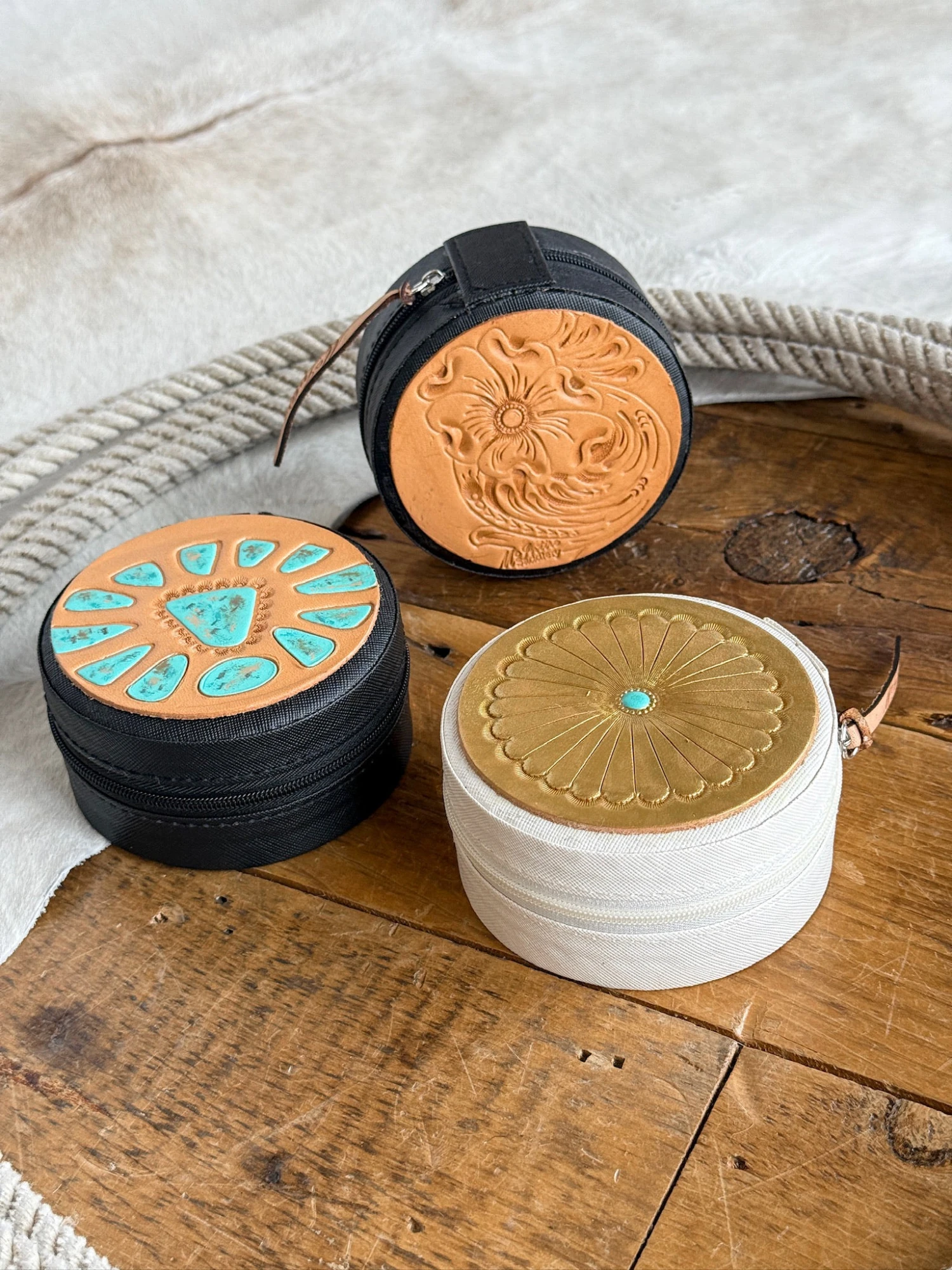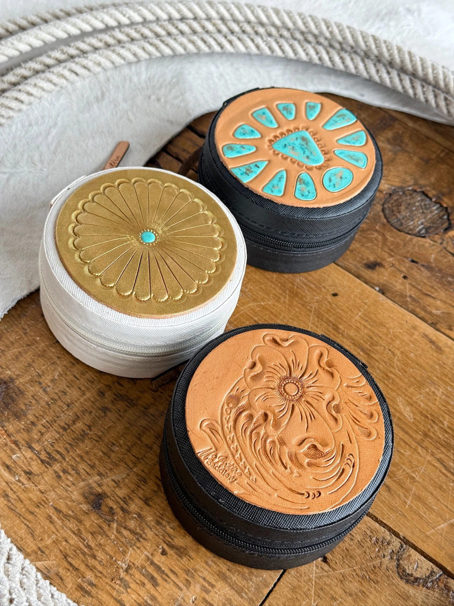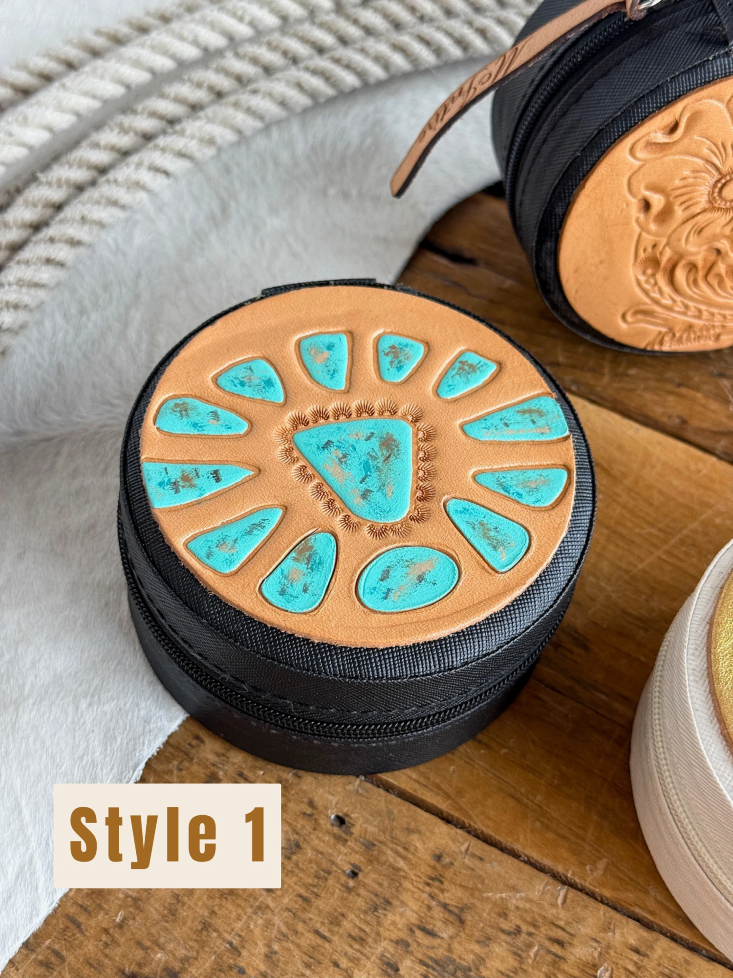 - Tooled leather patch jewelry case.